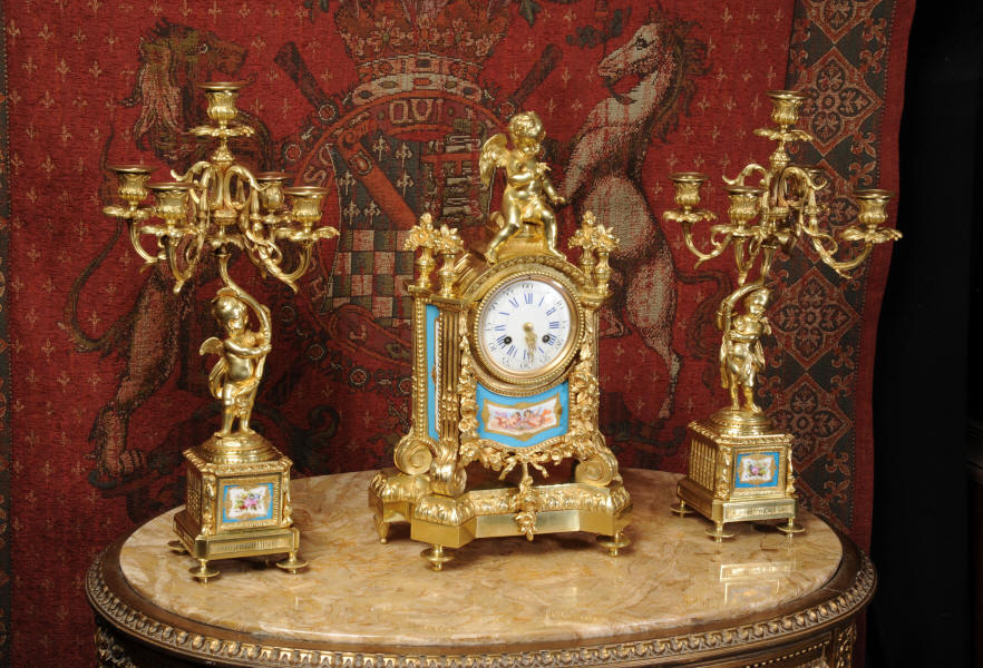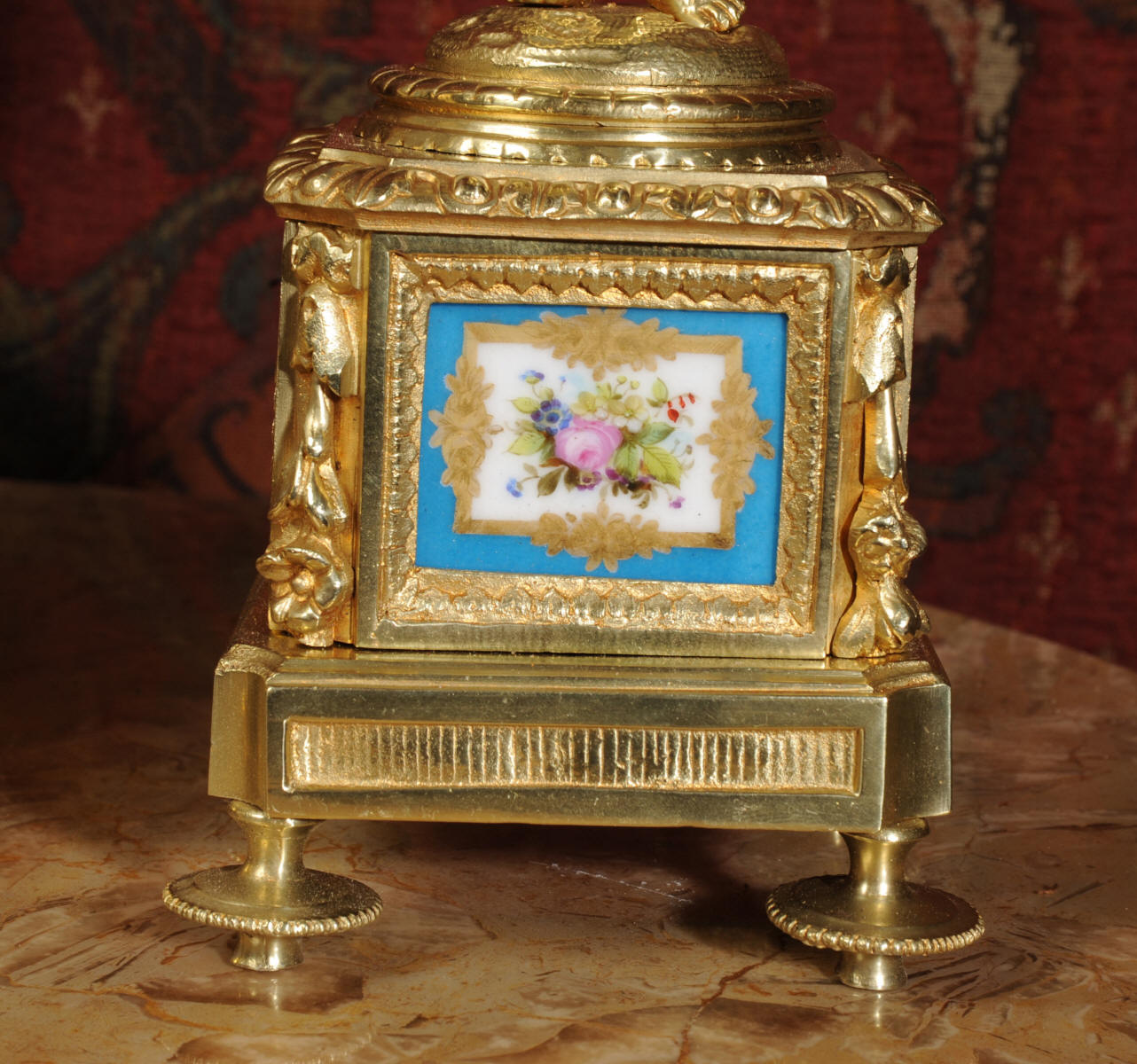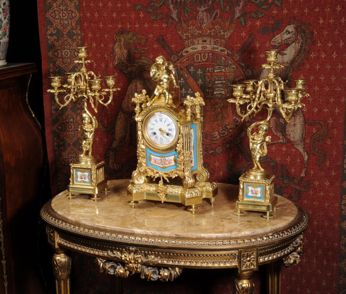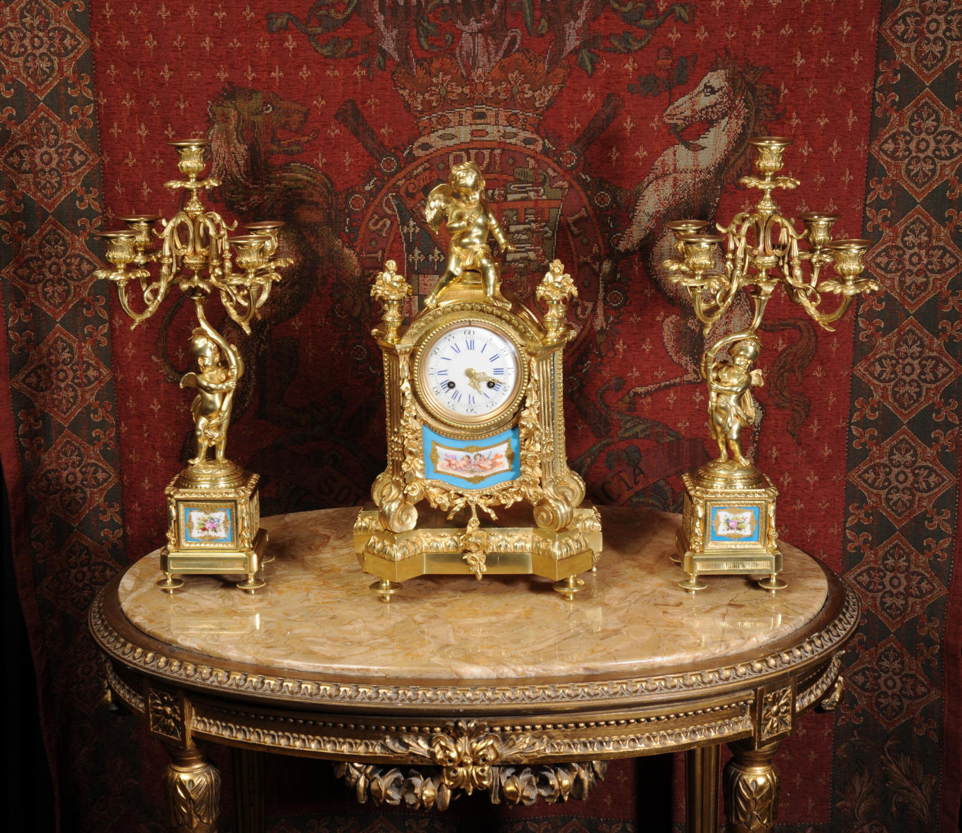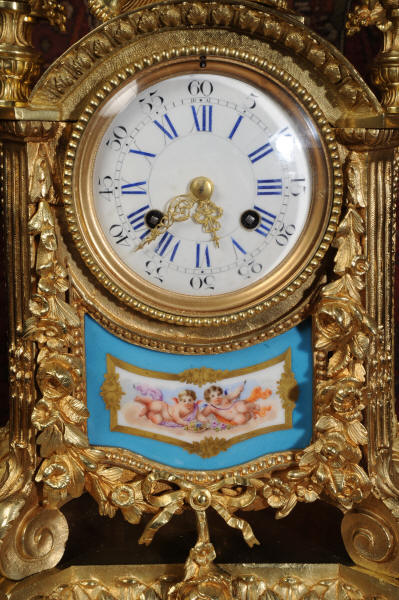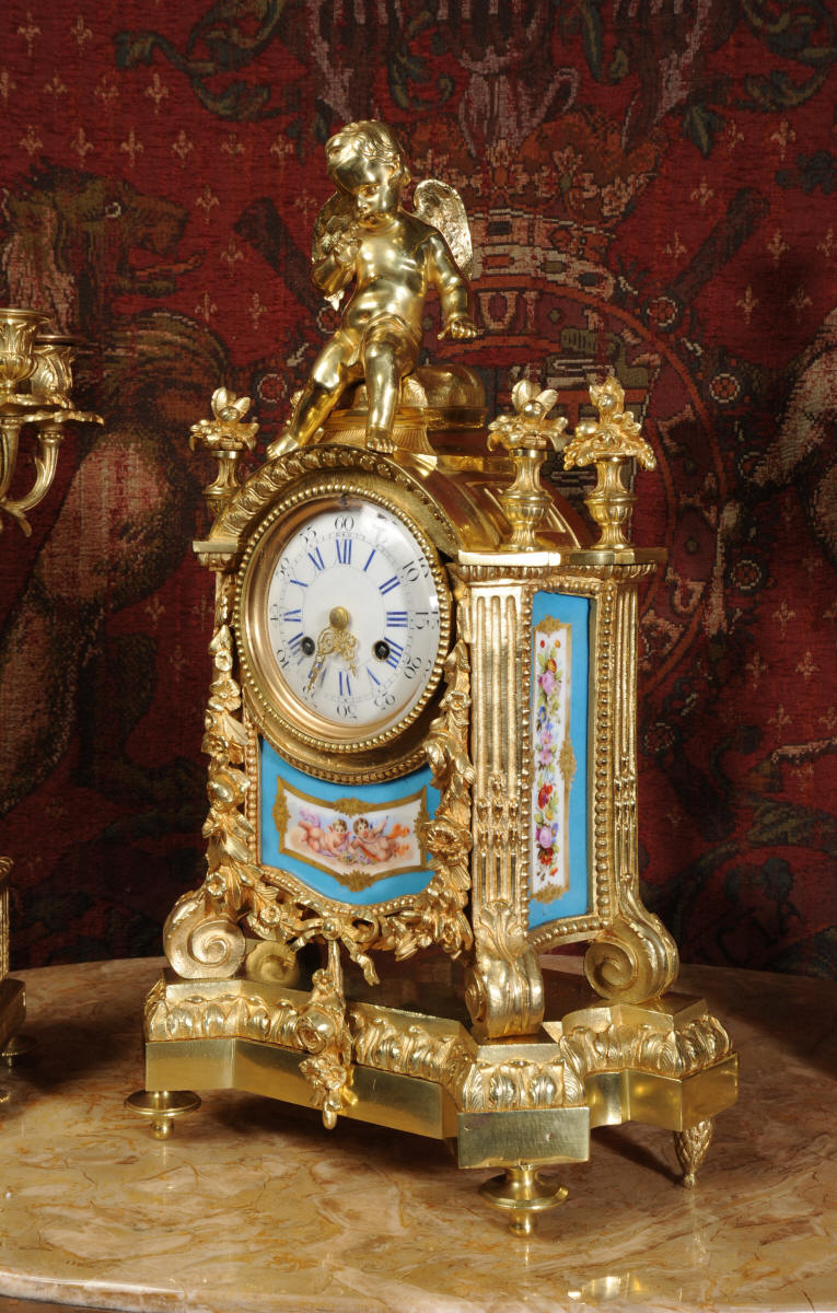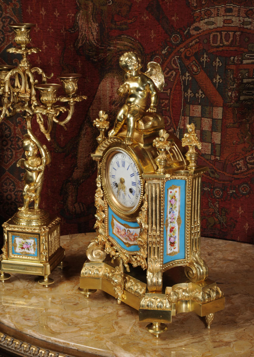 Condition of the case is excellent, the original gilding is beautifully clean and bright with hardly any wear or discolouration. One candelabra branch has a small piece of acanthus missing which does not detract. There are some stress cracks to some of the castings, particularly the candelabra arms and also some of the applied decoration to the clock but these are still strong and sound. The dial is also in excellent condition, there is some restoration, particularly to the bezel, it is the original bezel with matching serial number. Porcelain is also excellent with just some slight wear to the over glaze gilt decoration. A lovely early clock set to add to your collection.