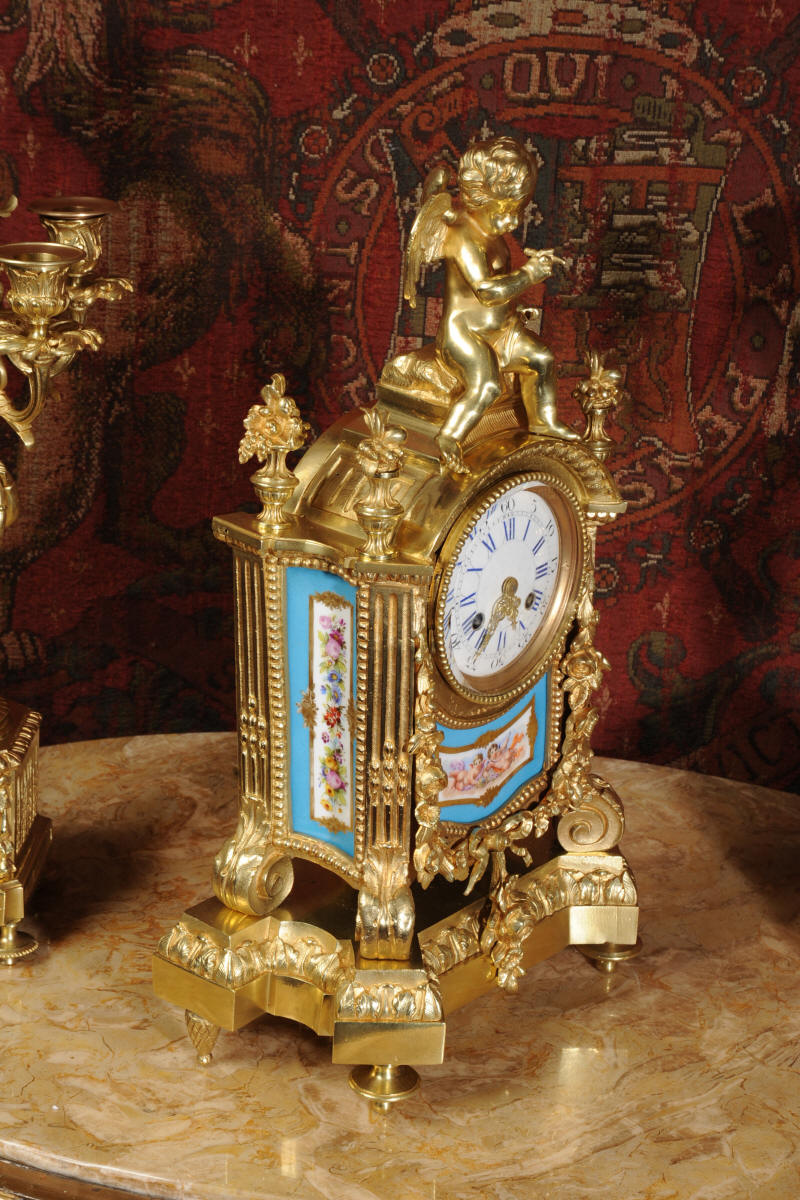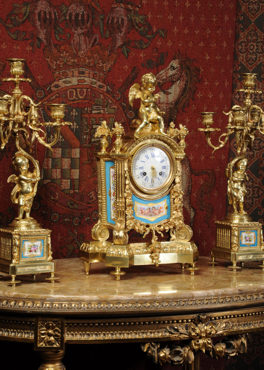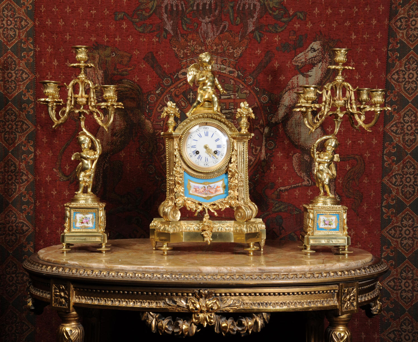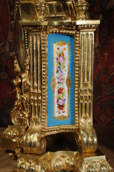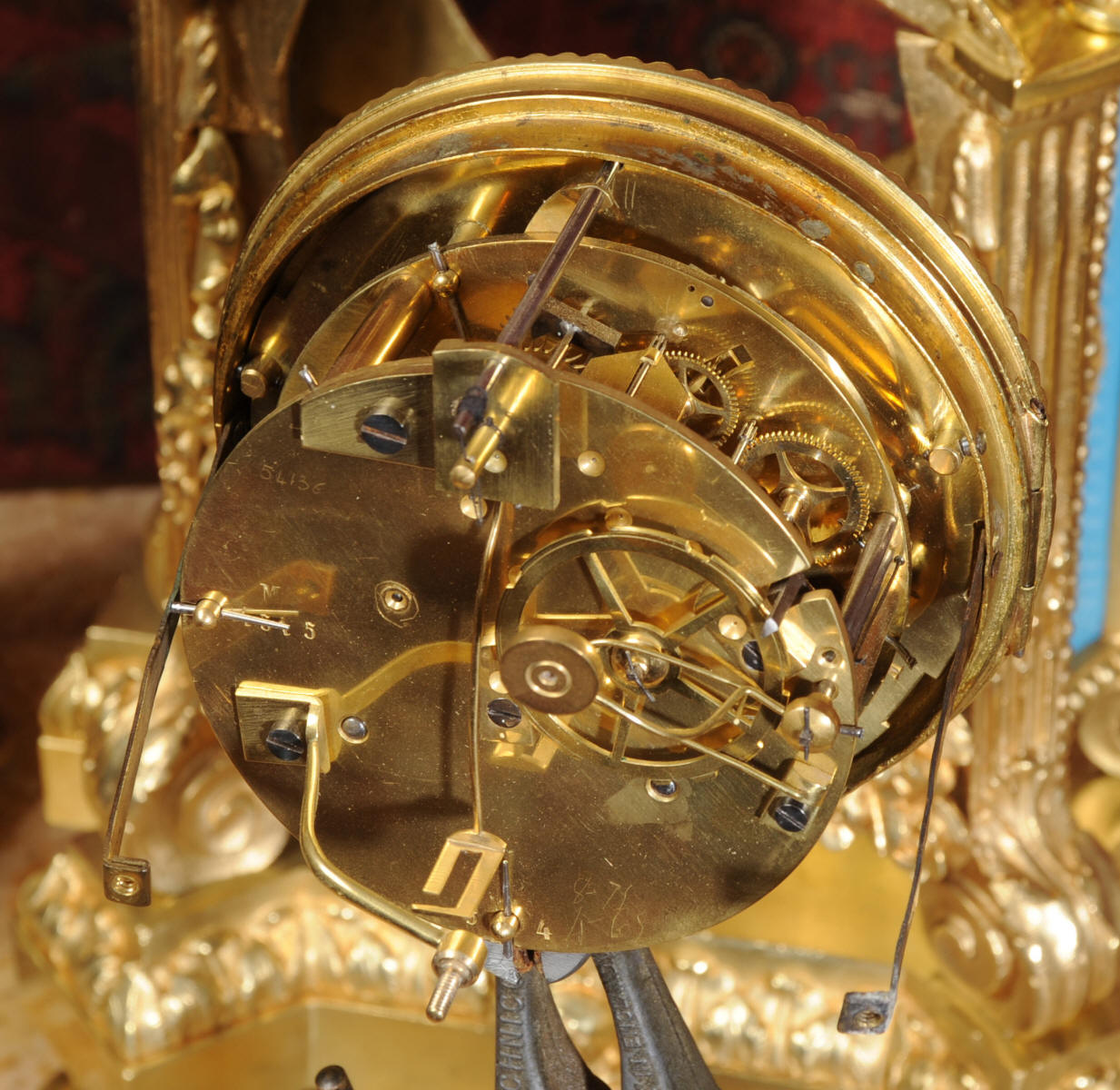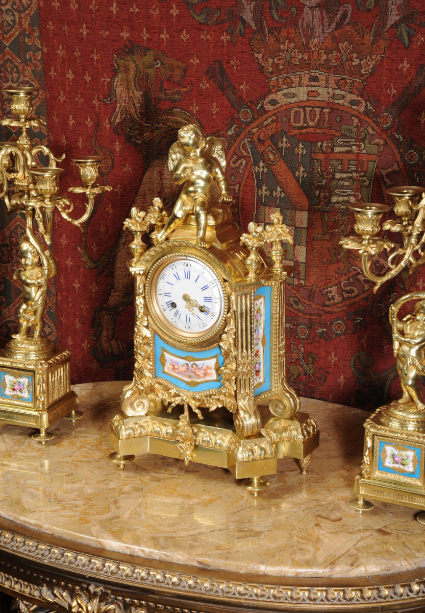 Condition of the case is excellent, the original gilding is beautifully clean and bright with hardly any wear or discolouration. One candelabra branch has a small piece of acanthus missing which does not detract. There are some stress cracks to some of the castings, particularly the candelabra arms and also some of the applied decoration to the clock but these are still strong and sound. The dial is also in excellent condition, there is some restoration, particularly to the bezel, it is the original bezel with matching serial number. Porcelain is also excellent with just some slight wear to the over glaze gilt decoration. A lovely early clock set to add to your collection.