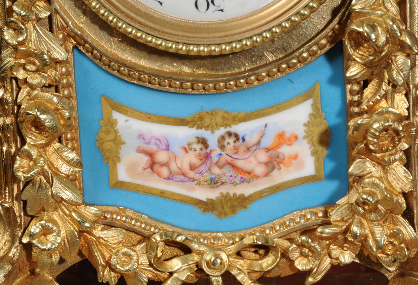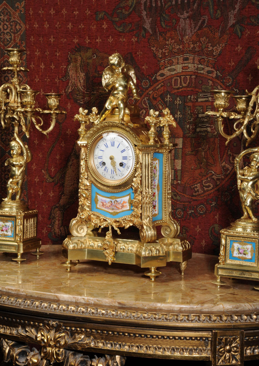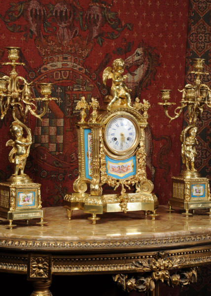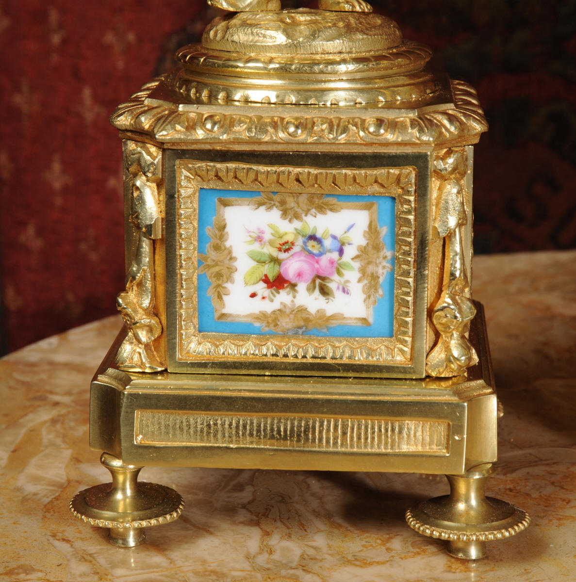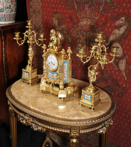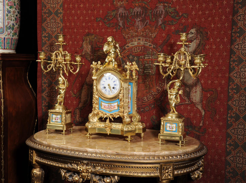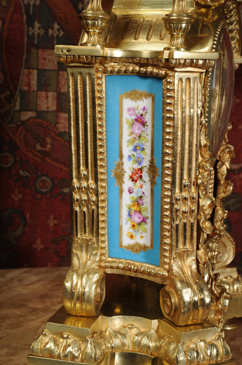 Condition of the case is excellent, the original gilding is beautifully clean and bright with hardly any wear or discolouration. One candelabra branch has a small piece of acanthus missing which does not detract. There are some stress cracks to some of the castings, particularly the candelabra arms and also some of the applied decoration to the clock but these are still strong and sound. The dial is also in excellent condition, there is some restoration, particularly to the bezel, it is the original bezel with matching serial number. Porcelain is also excellent with just some slight wear to the over glaze gilt decoration. A lovely early clock set to add to your collection.