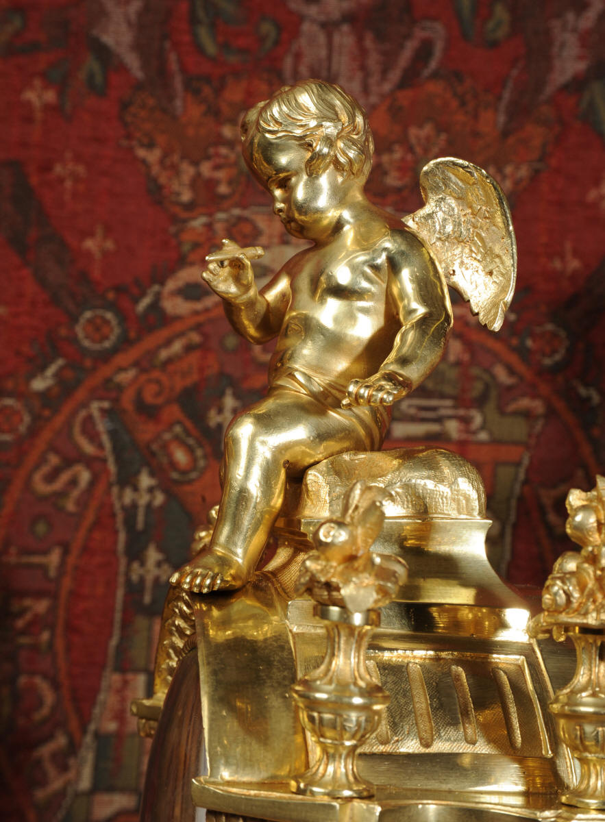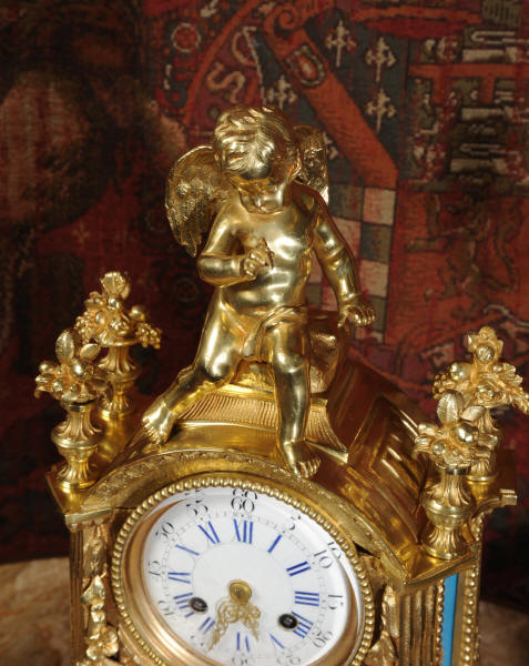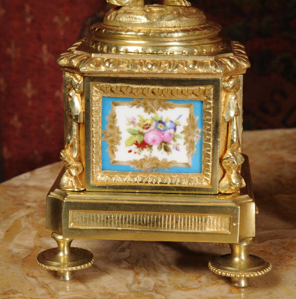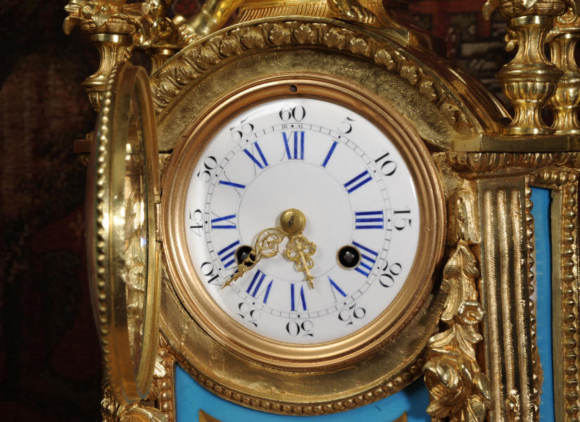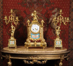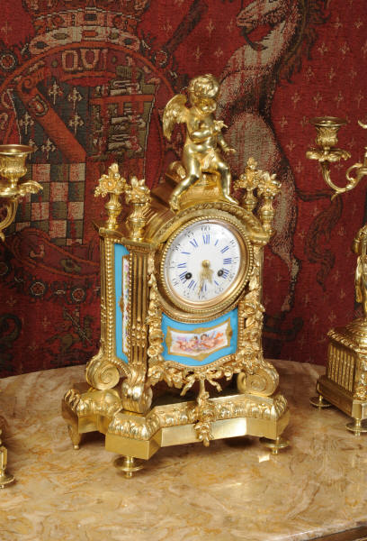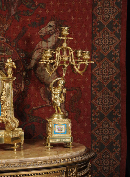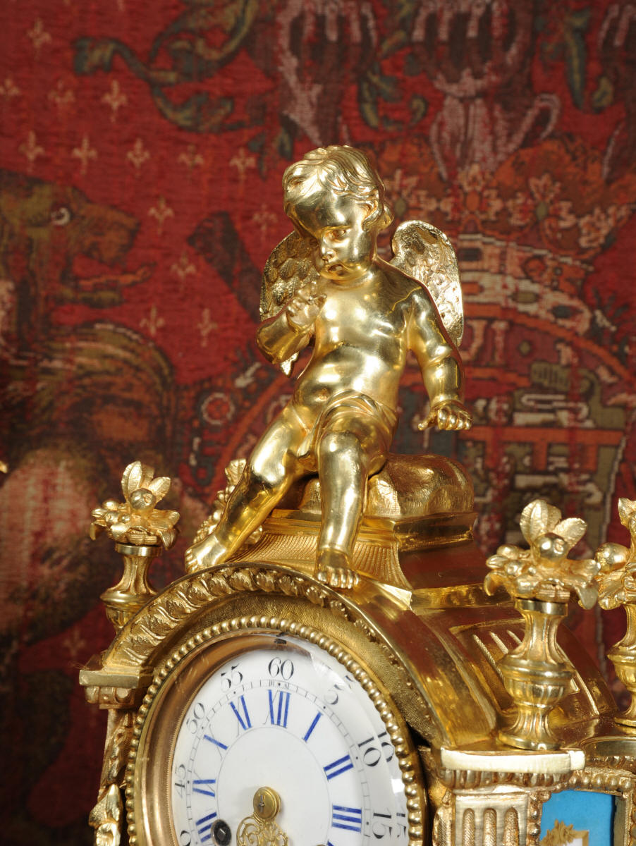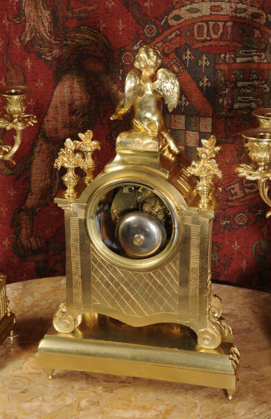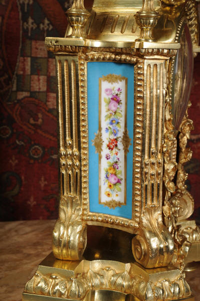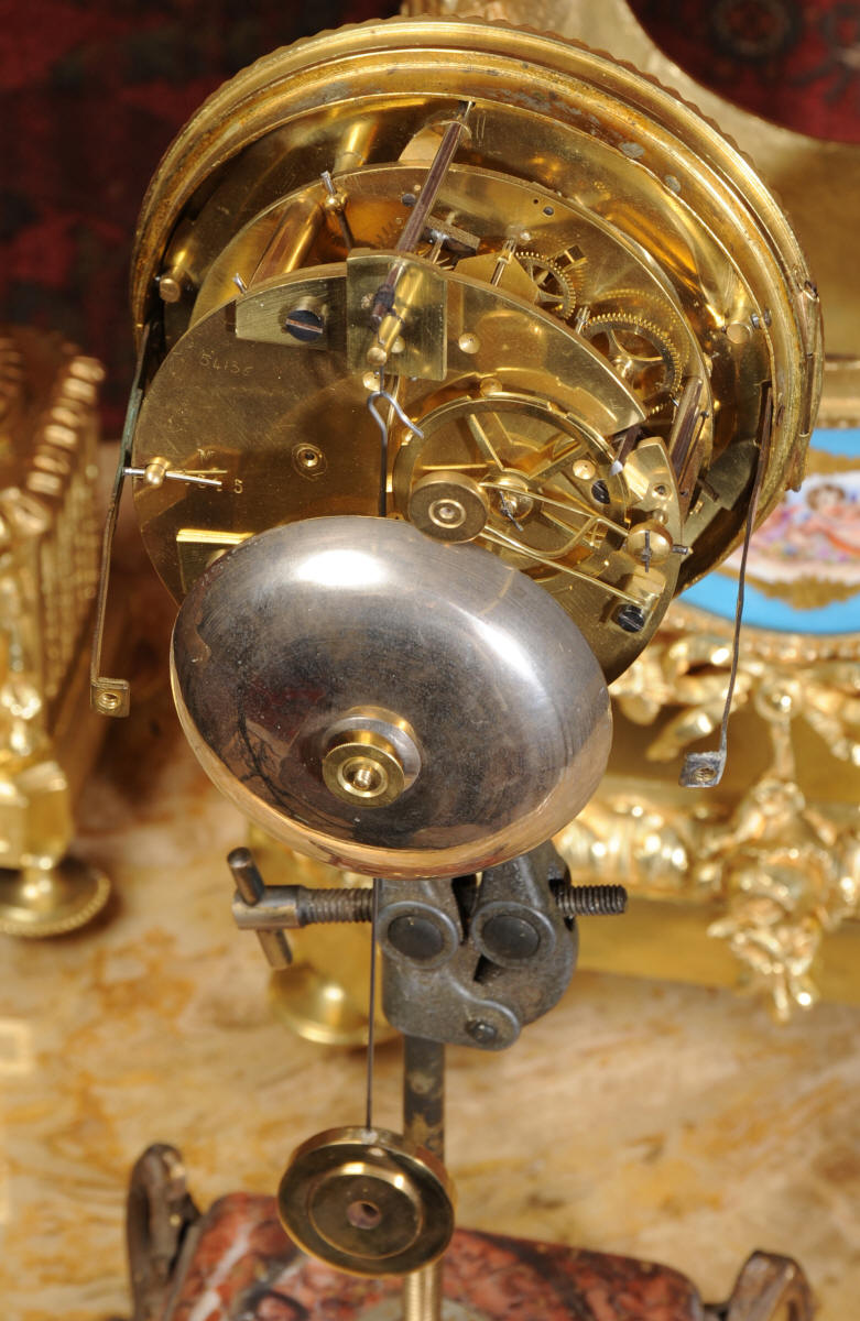 Condition of the case is excellent, the original gilding is beautifully clean and bright with hardly any wear or discolouration. One candelabra branch has a small piece of acanthus missing which does not detract. There are some stress cracks to some of the castings, particularly the candelabra arms and also some of the applied decoration to the clock but these are still strong and sound. The dial is also in excellent condition, there is some restoration, particularly to the bezel, it is the original bezel with matching serial number. Porcelain is also excellent with just some slight wear to the over glaze gilt decoration. A lovely early clock set to add to your collection.