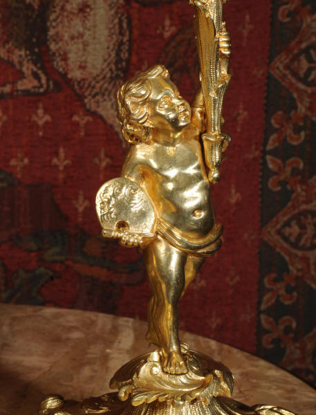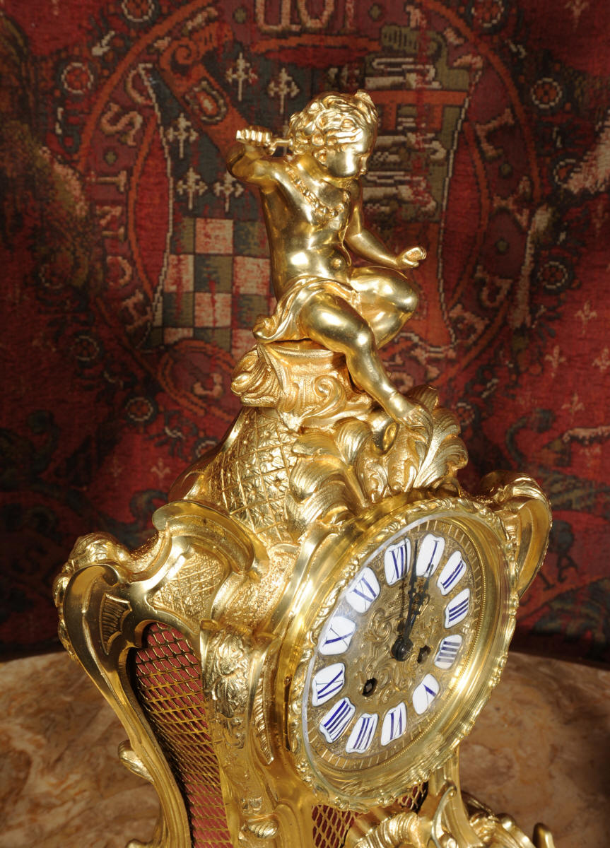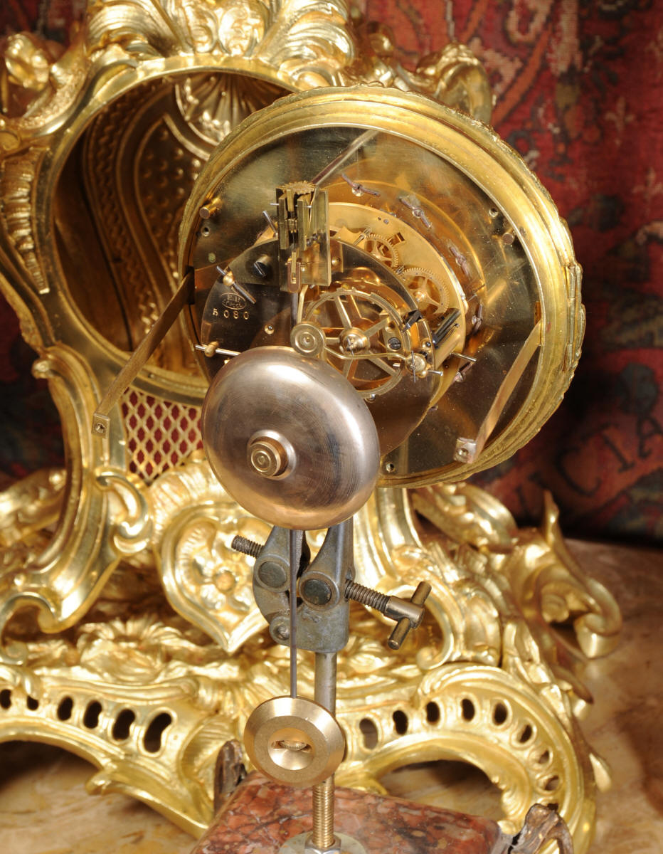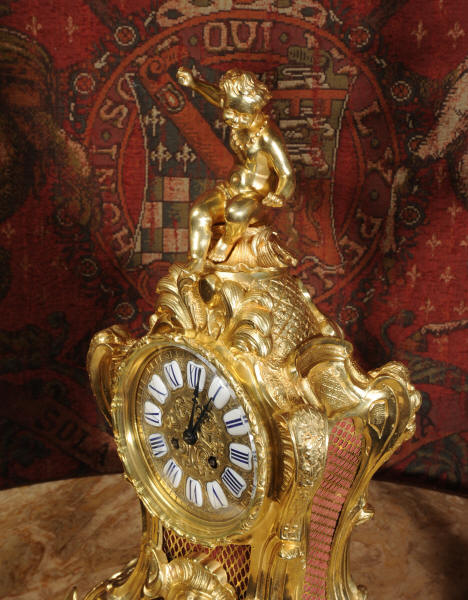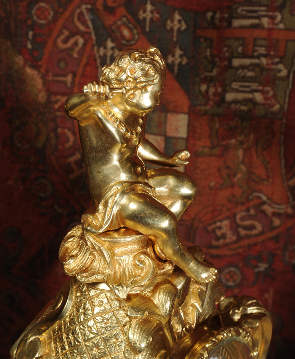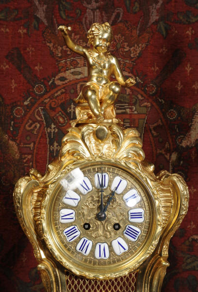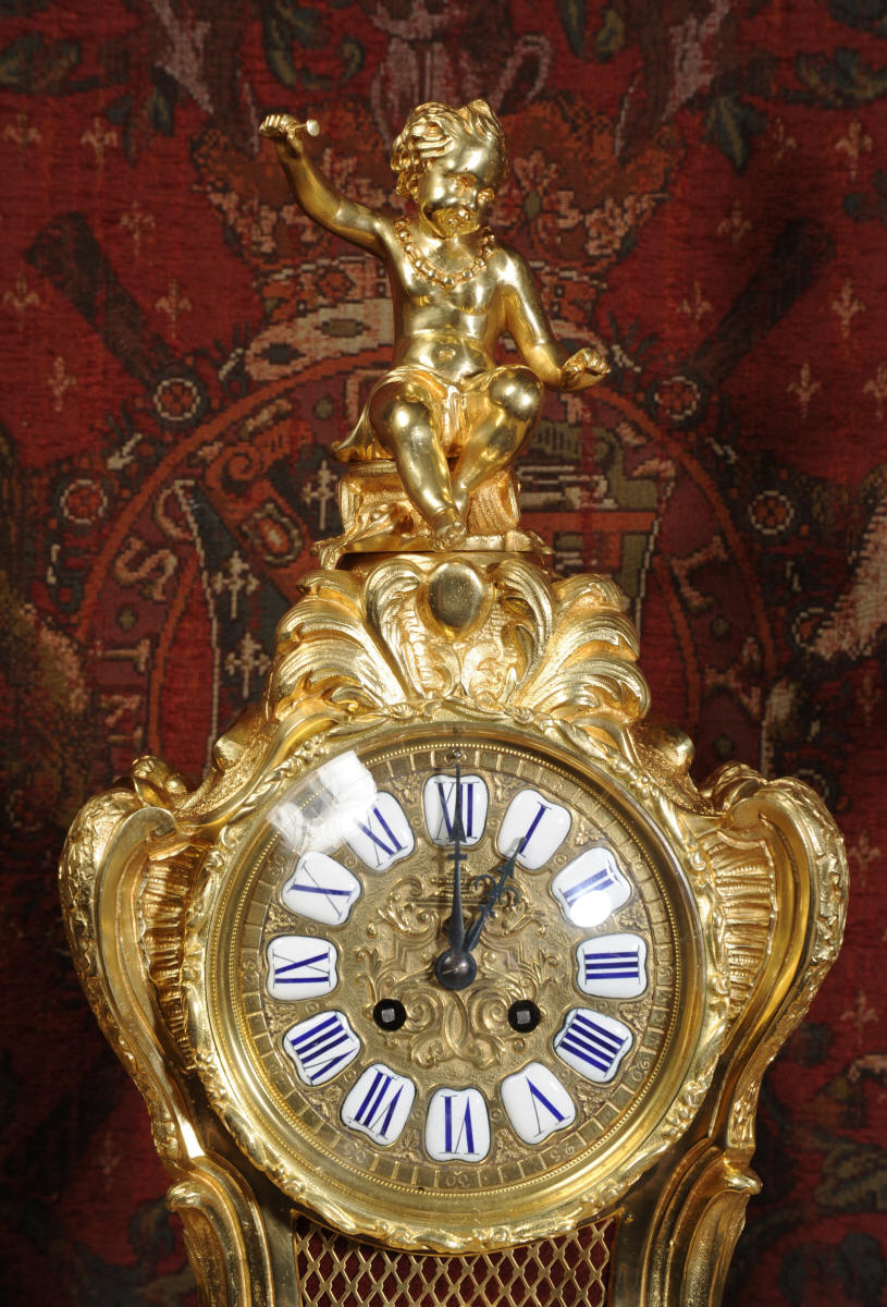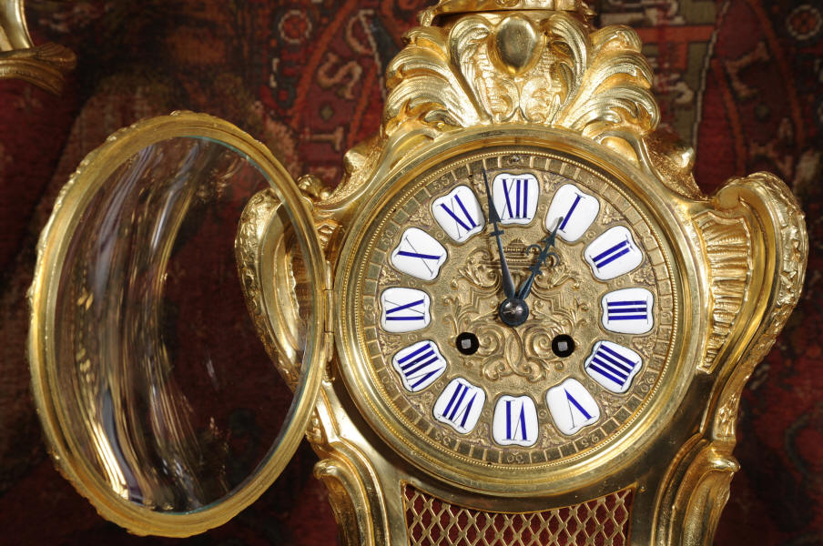 The large dial is also gilt brass with 12 individual enamel cartouches and original finely fretted blued steel hands. The Rococo bezel is fitted with convex glass.