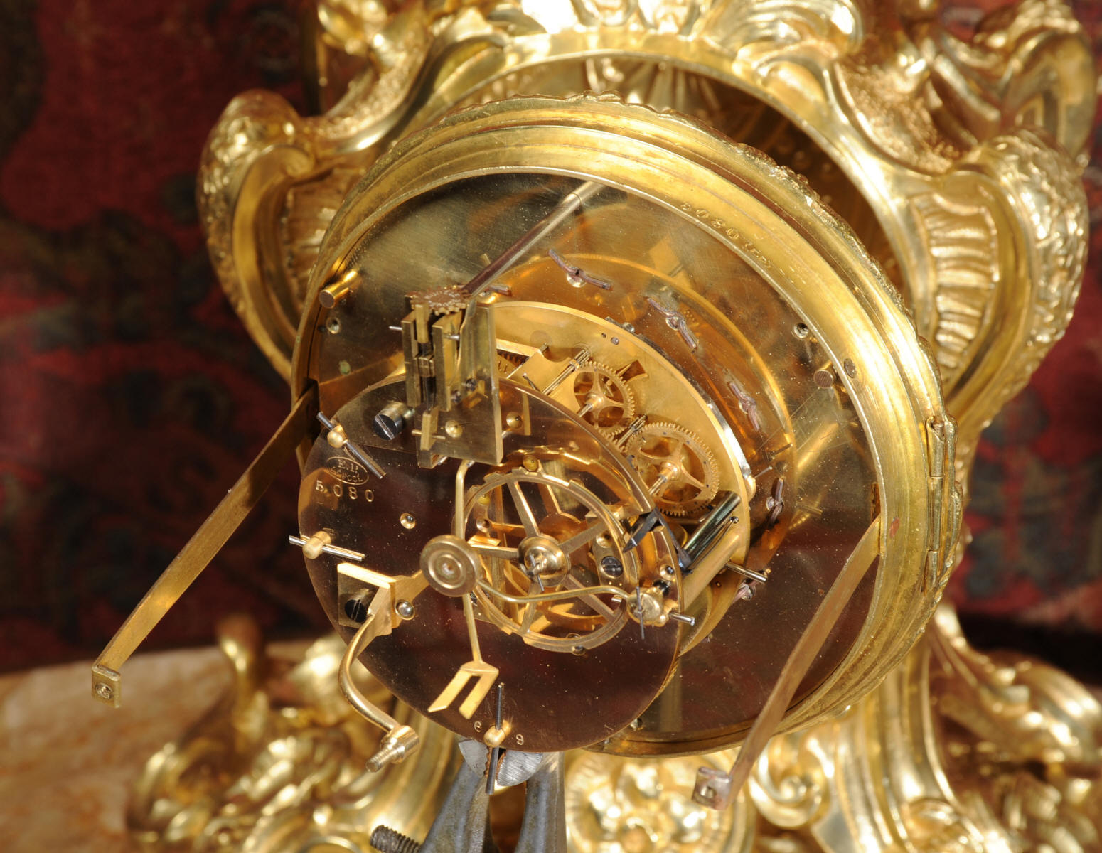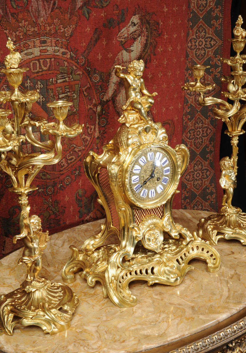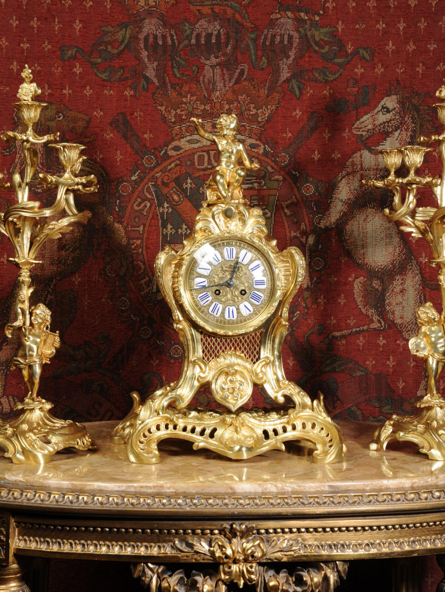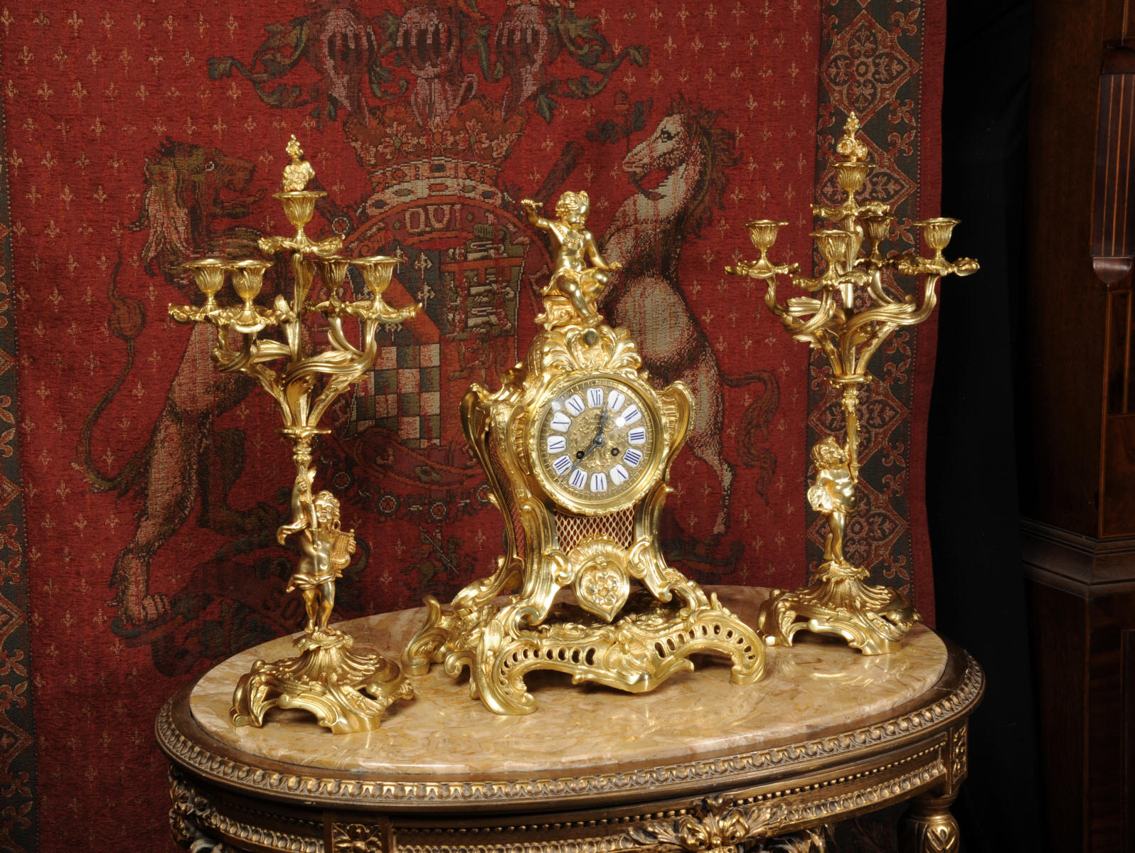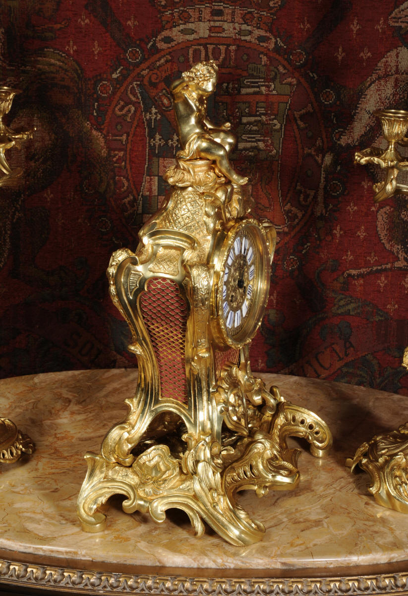 Condition of the case is excellent, the original gilding is beautifully clean and bright with hardly any wear or discolouration and there are no losses. The dial is also in excellent condition with no faults. We have replaced the red velvet. The set makes a stunning display as you can see below.