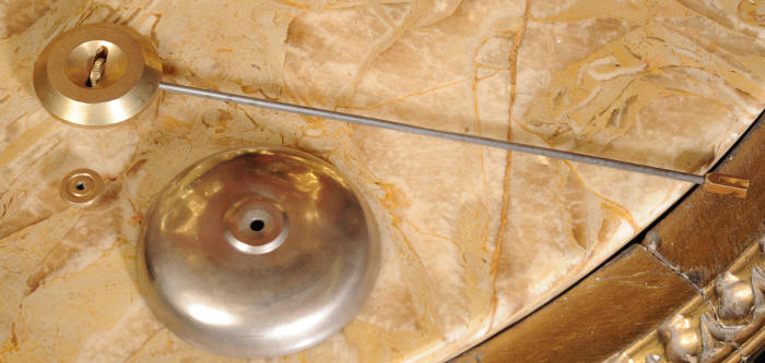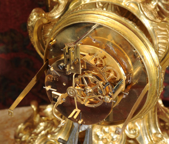 The French movement is of high quality and is in excellent clean and running condition having been fully overhauled by our clockmaker. Pendulum is a replacement. It runs for 8 days and strikes the hours and halves on a bell. Click the video clip below to hear the bell and watch the clock running!
