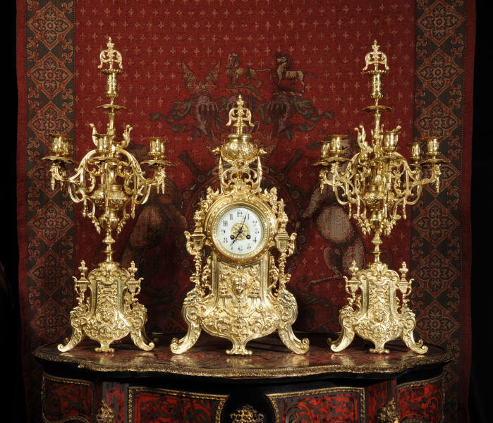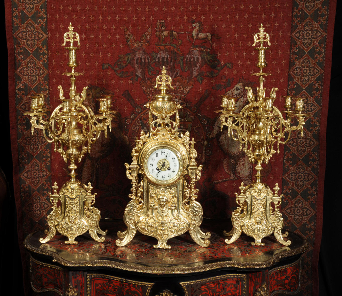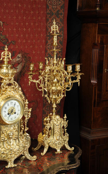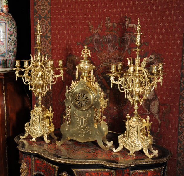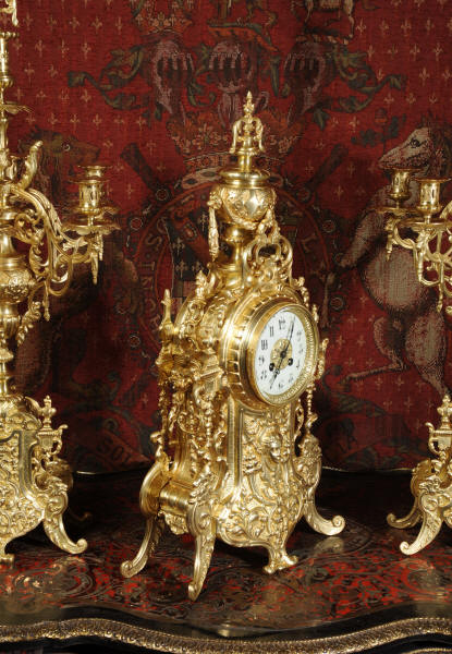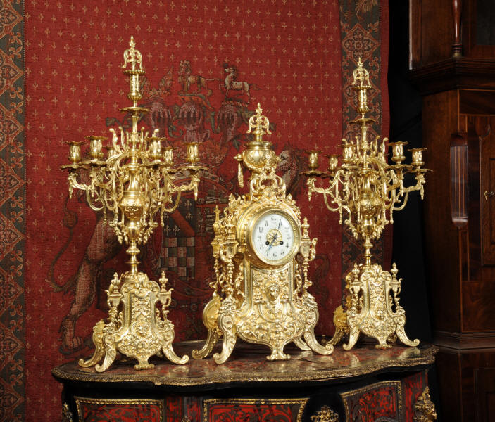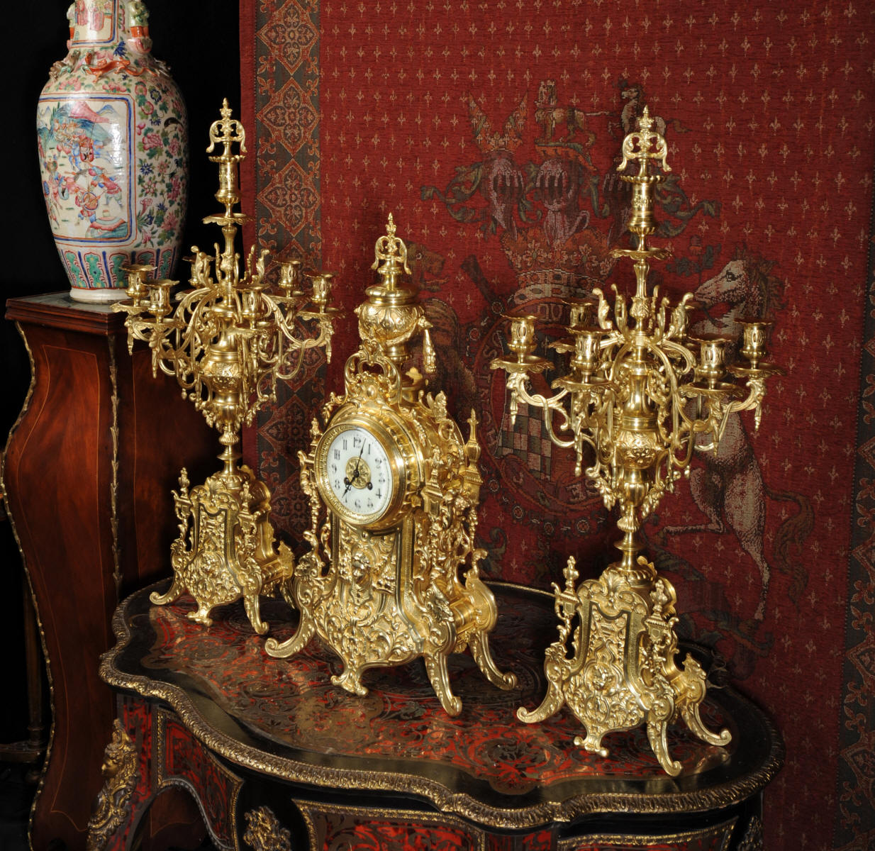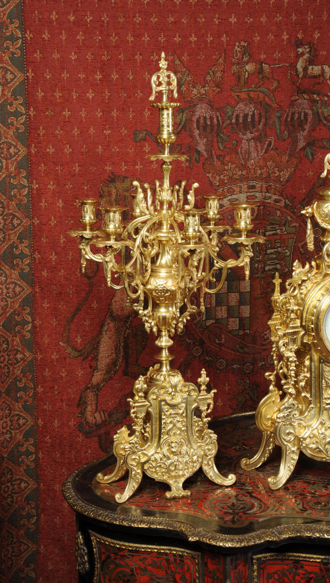 Condition of the case is excellent, the original gilding is beautifully clean and bright with hardly any wear or discolouration and there are no losses. The dial is also in excellent condition just some tiny nibbles next to the winding holes and some faint hairlines. Candelabra are slightly distorted. The set makes a stunning display as you can see below.