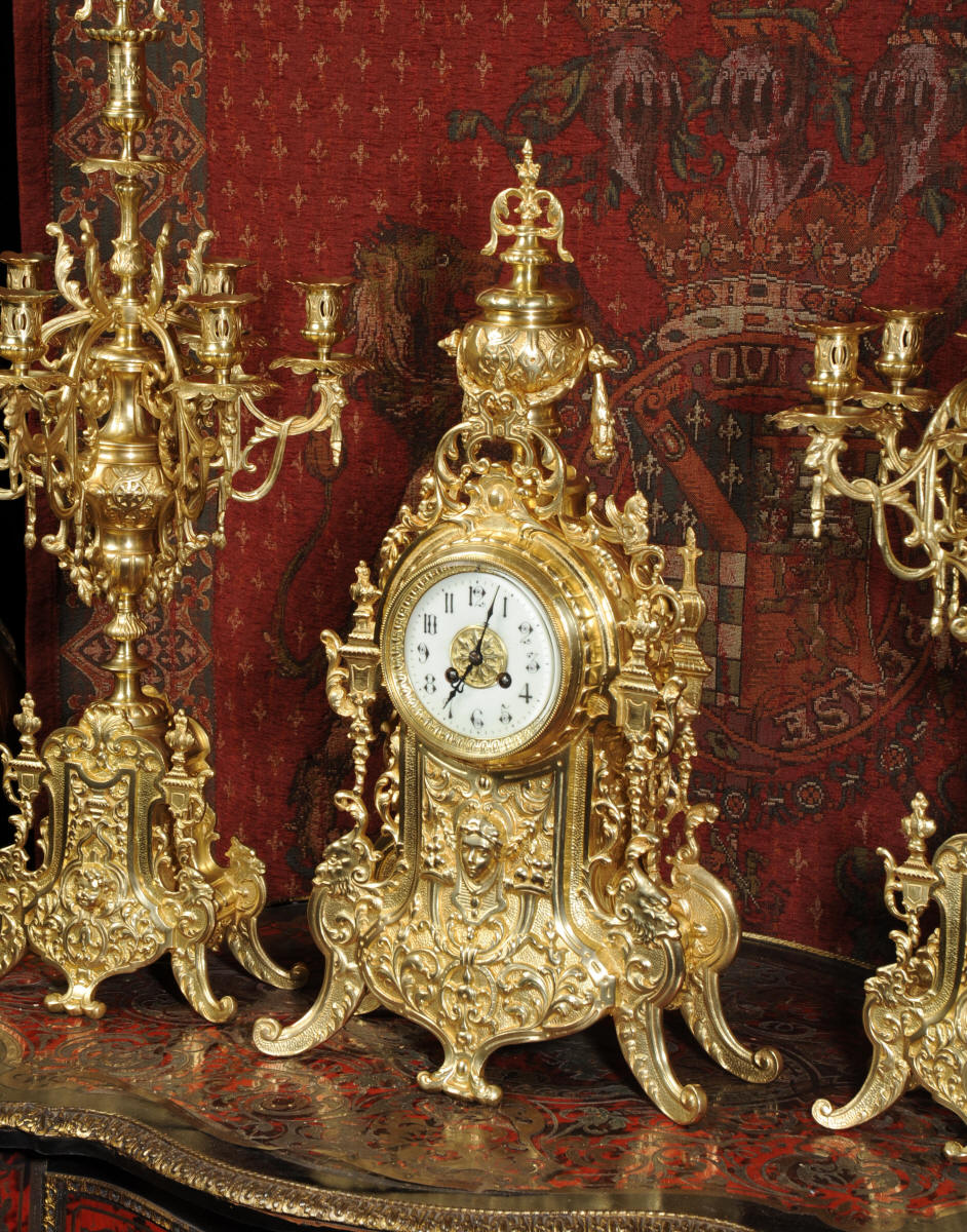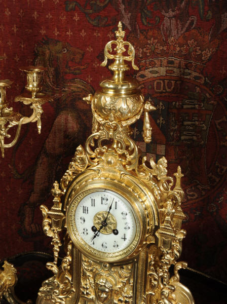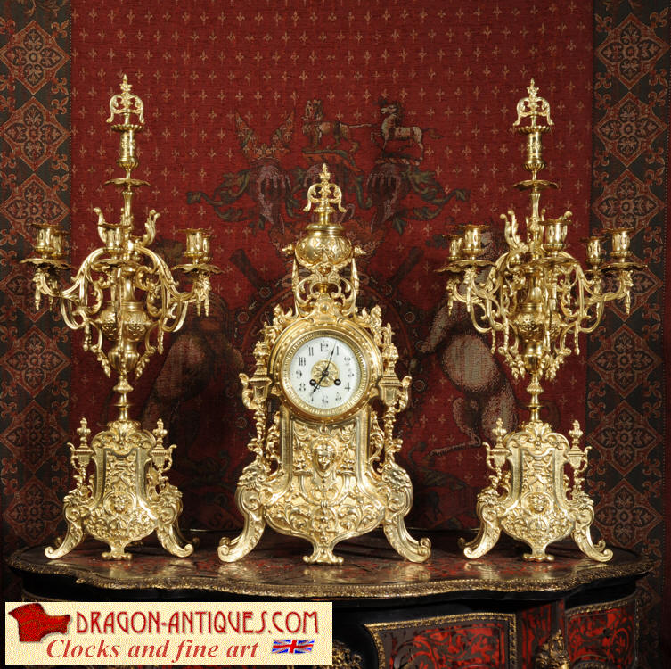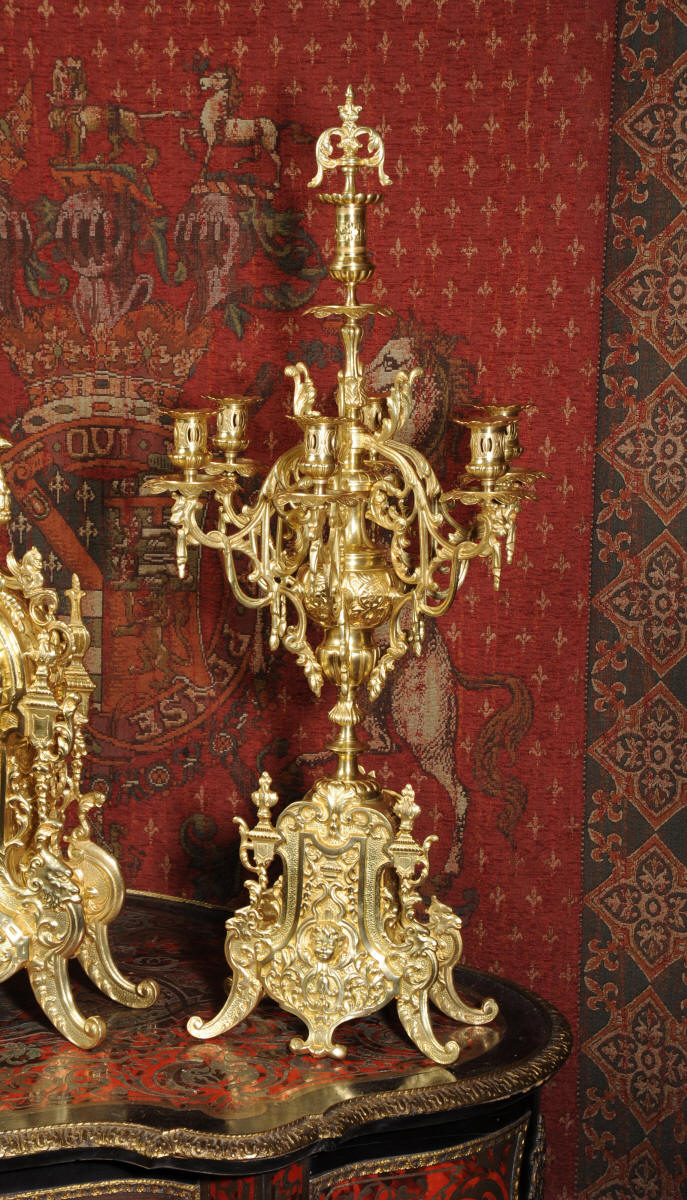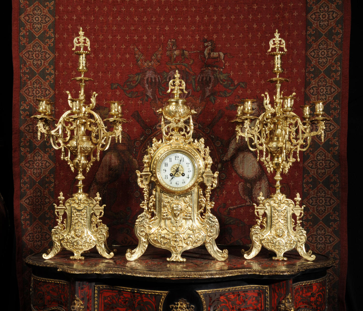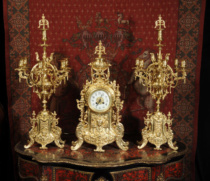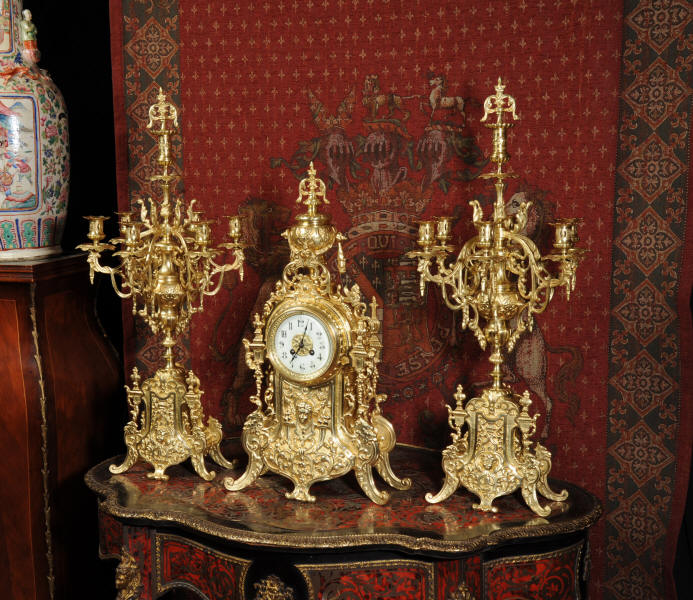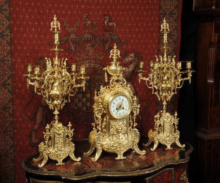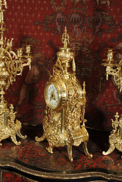Condition of the case is excellent, the original gilding is beautifully clean and bright with hardly any wear or discolouration and there are no losses. The dial is also in excellent condition just some tiny nibbles next to the winding holes and some faint hairlines. Candelabra are slightly distorted. The set makes a stunning display as you can see below.