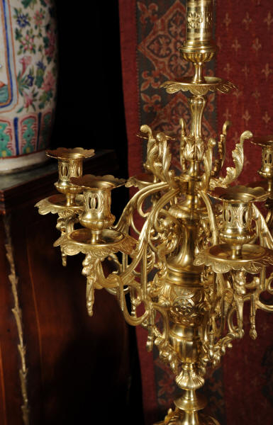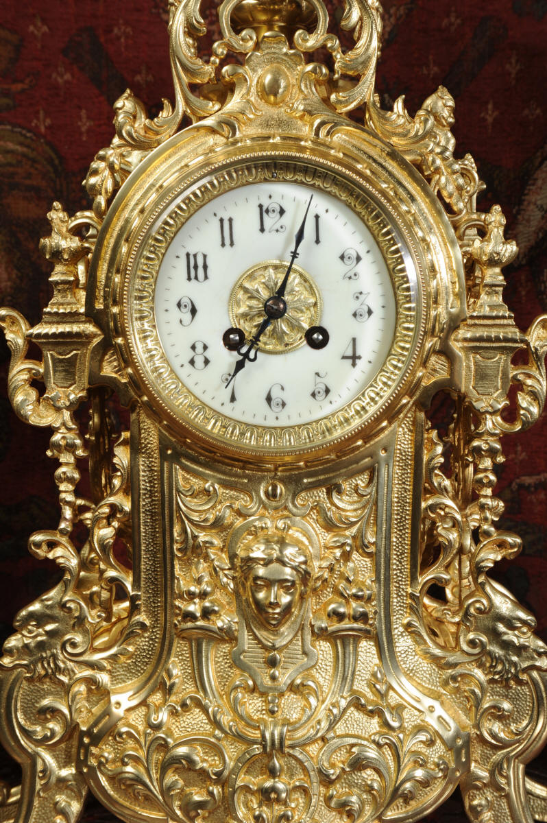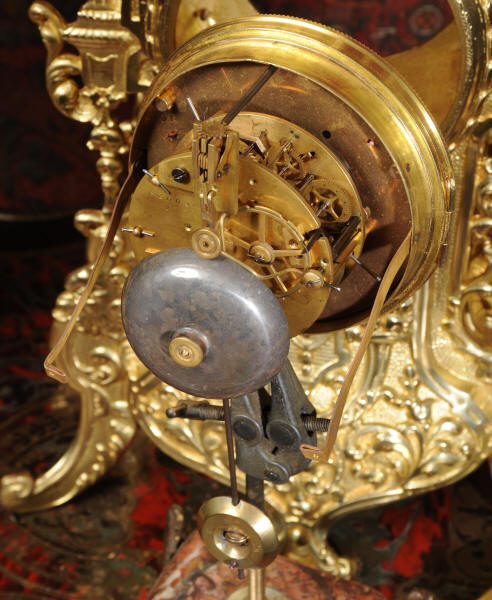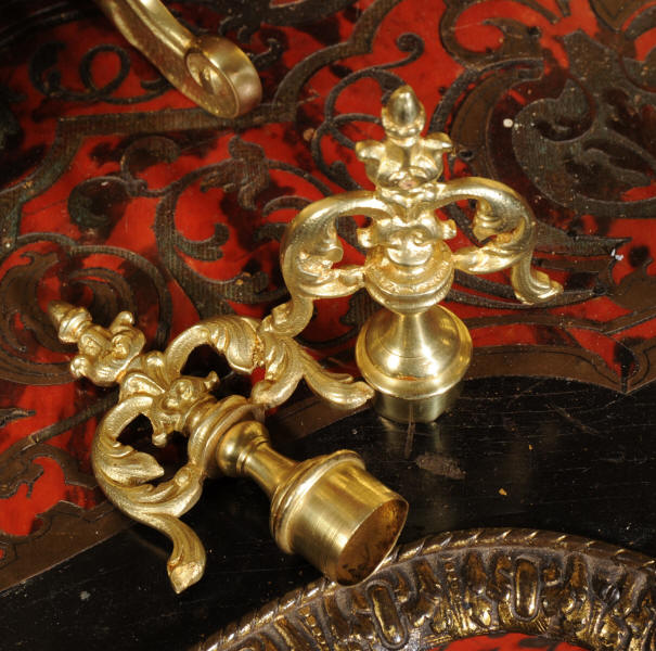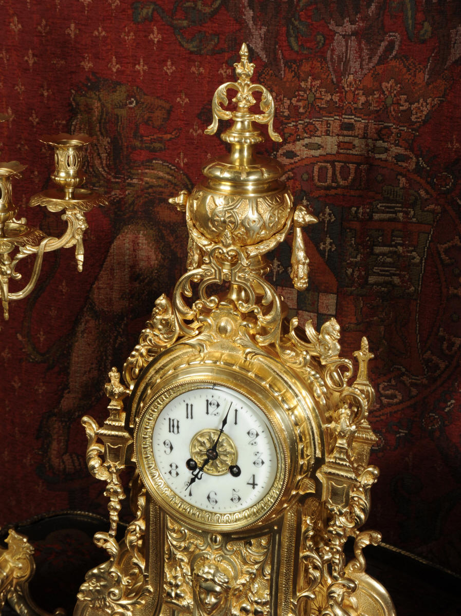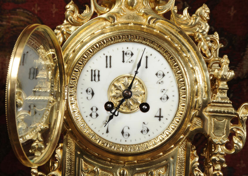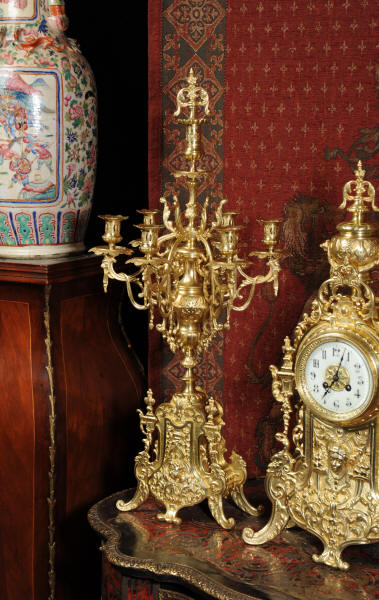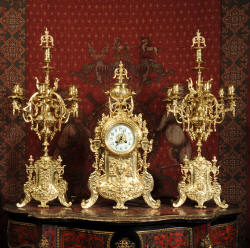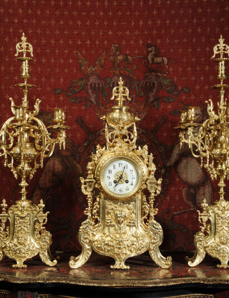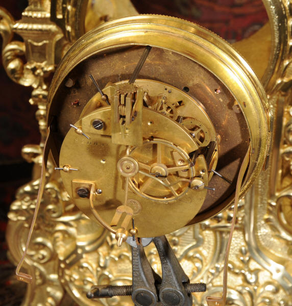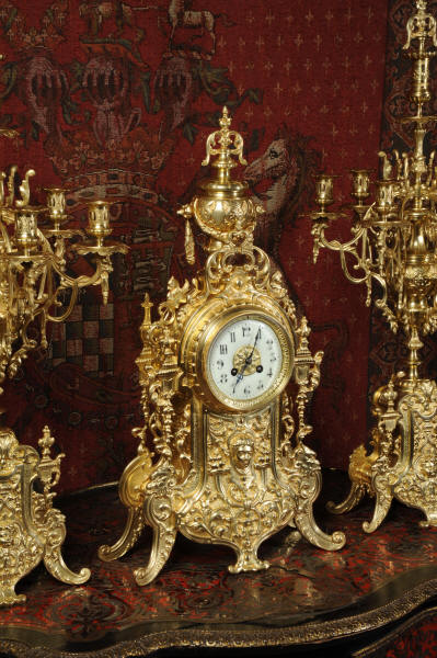 Condition of the case is excellent, the original gilding is beautifully clean and bright with hardly any wear or discolouration and there are no losses. The dial is also in excellent condition just some tiny nibbles next to the winding holes and some faint hairlines. Candelabra are slightly distorted. The set makes a stunning display as you can see below.