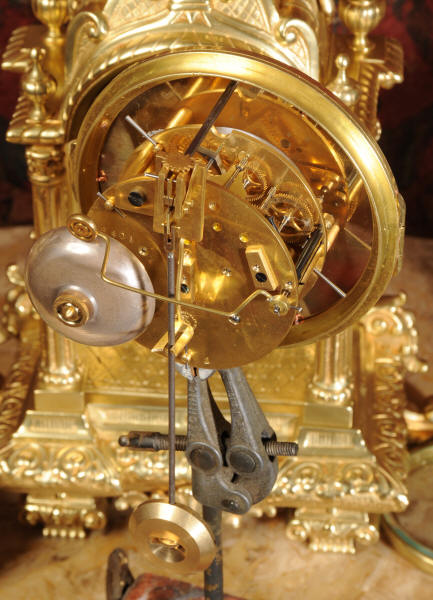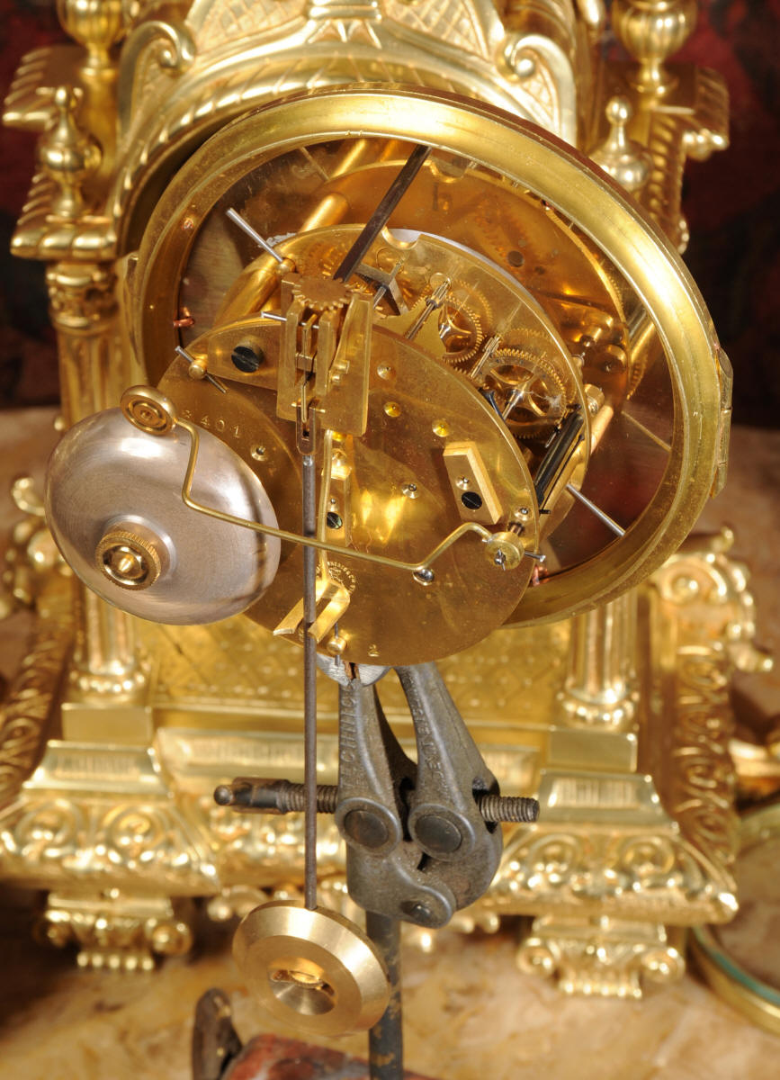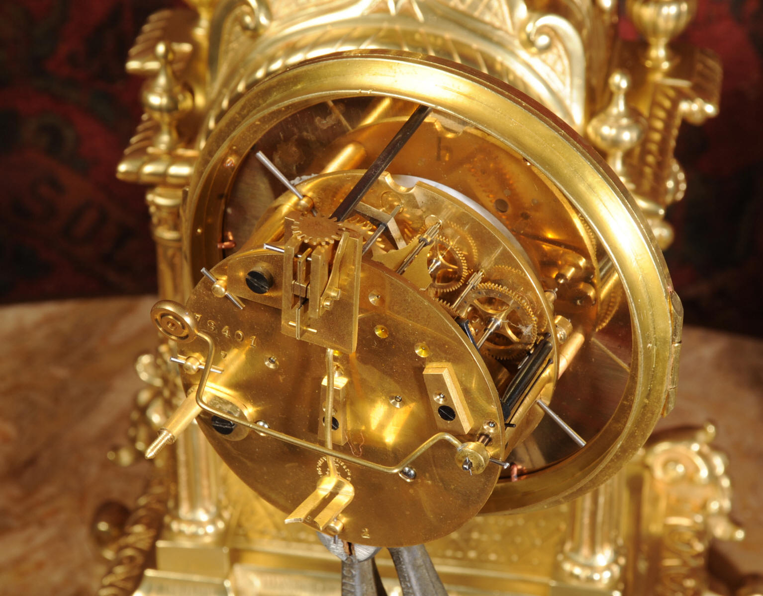 The French movement is by Japy Freres and has the makers mark on the backplate. It is of high quality and is in excellent clean and running condition having been fully overhauled by our clockmaker. Pendulum is a replacement. It runs for 8 days and strikes the hours and halves on a bell. Click the video clip below to hear the bell and watch the clock running!