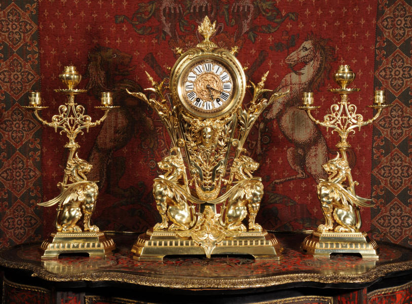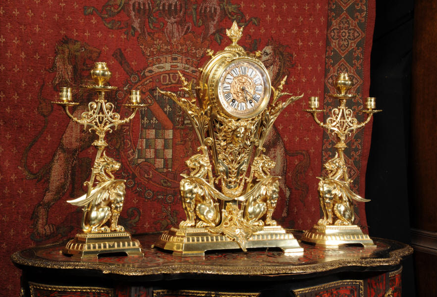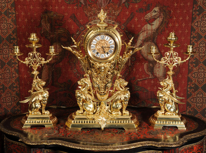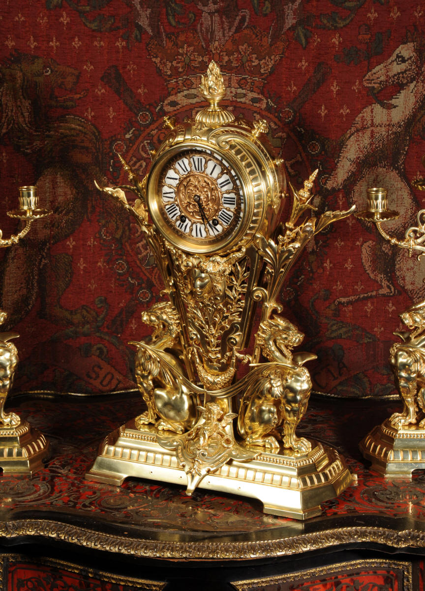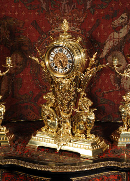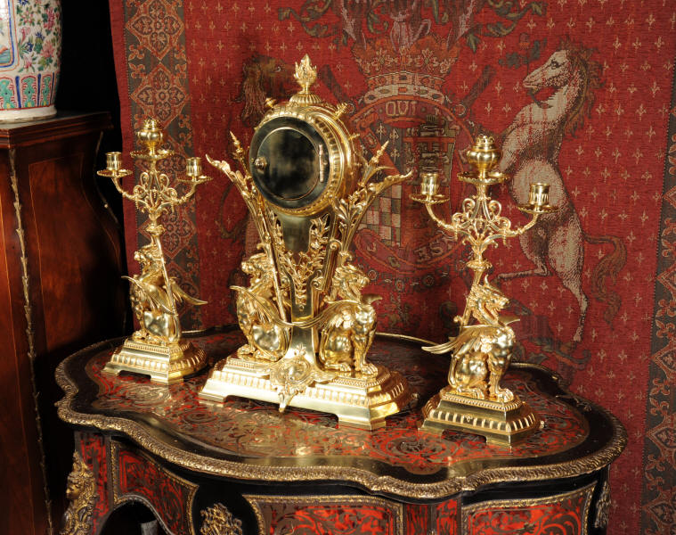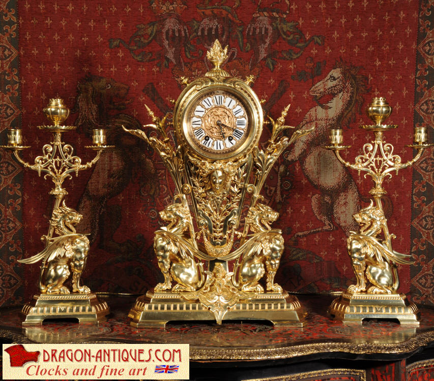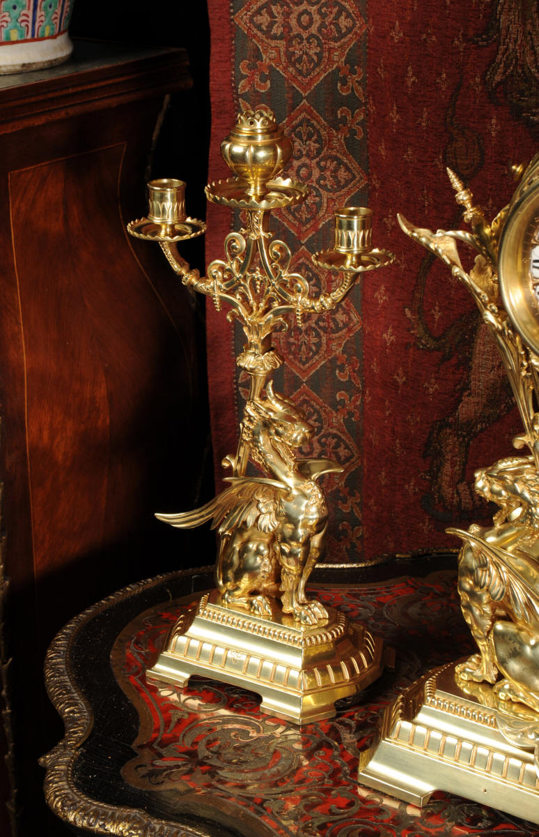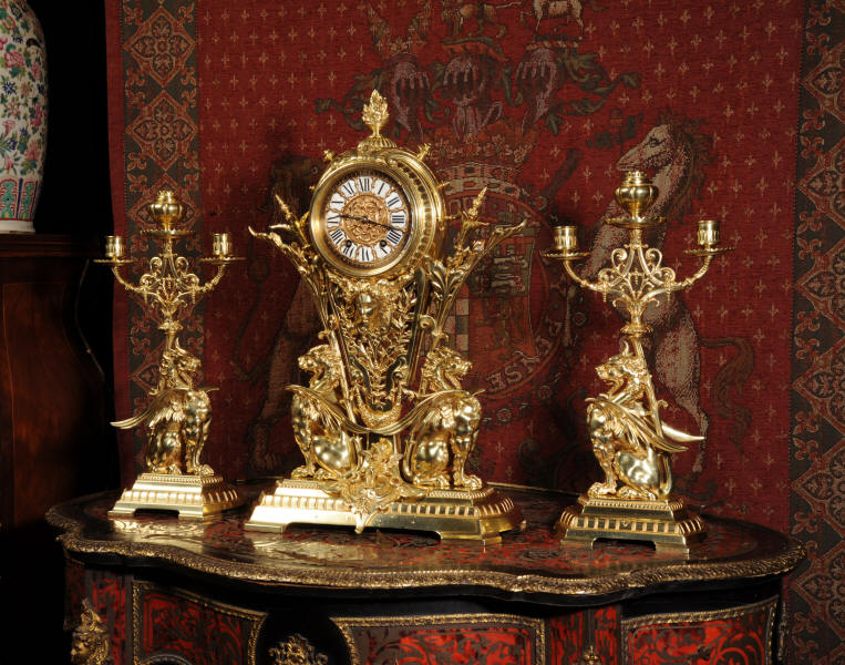 Condition of the case is excellent, the original gilding is beautifully clean and bright with just some slight wear and discolouration in places. The reverse of one dragon has a small piece of wing missing, this is at the rear of the clock case. The rear door has been re-built at some time. The dial is also in good condition, there is some slight restoration to some of the cartouches. The set makes a stunning display as you can see below.