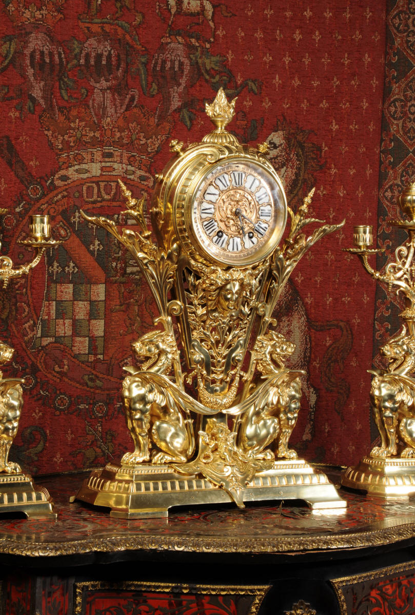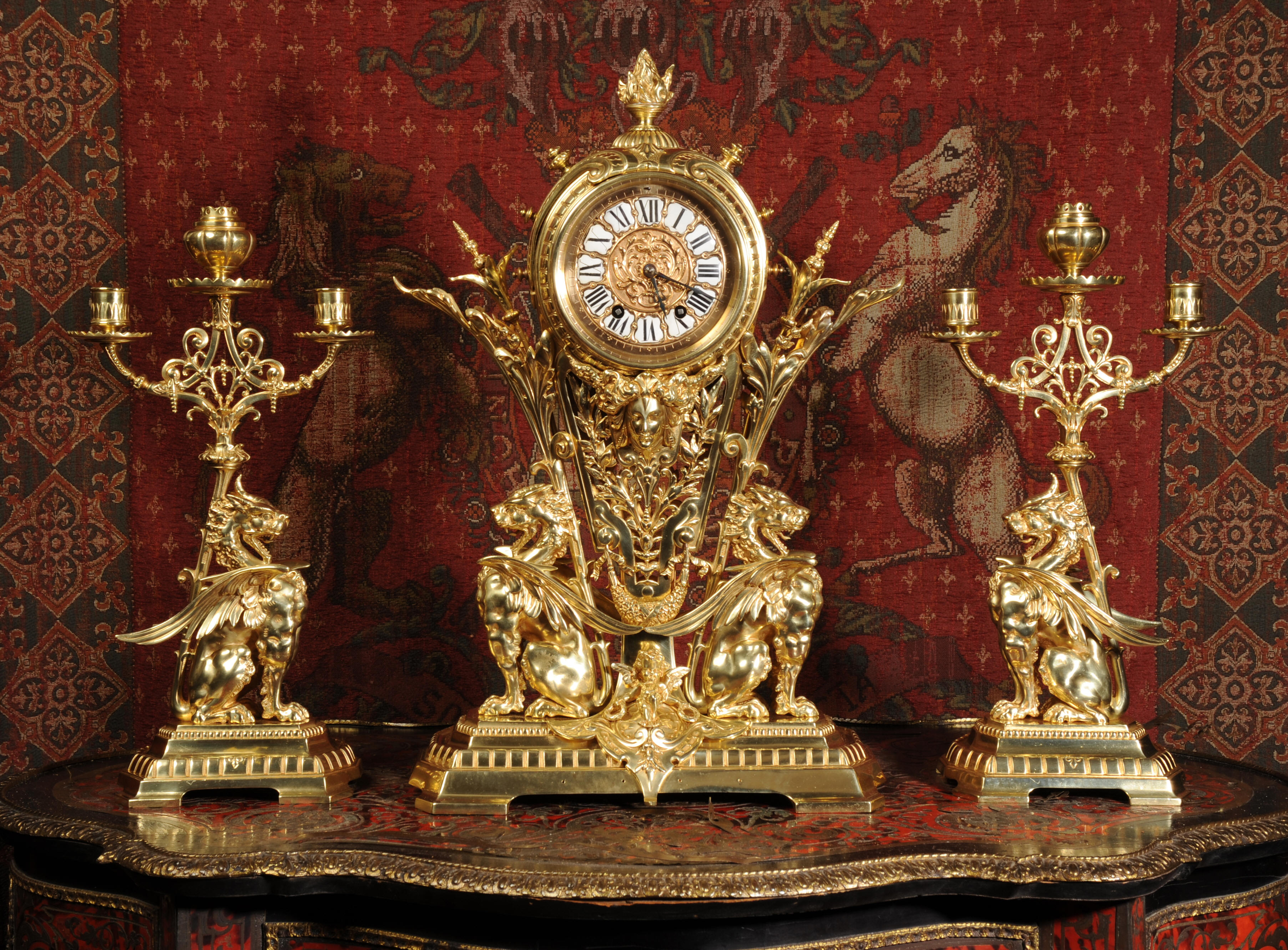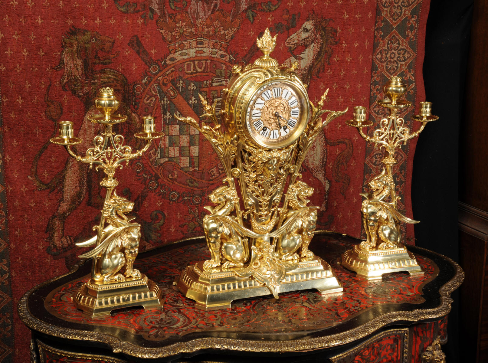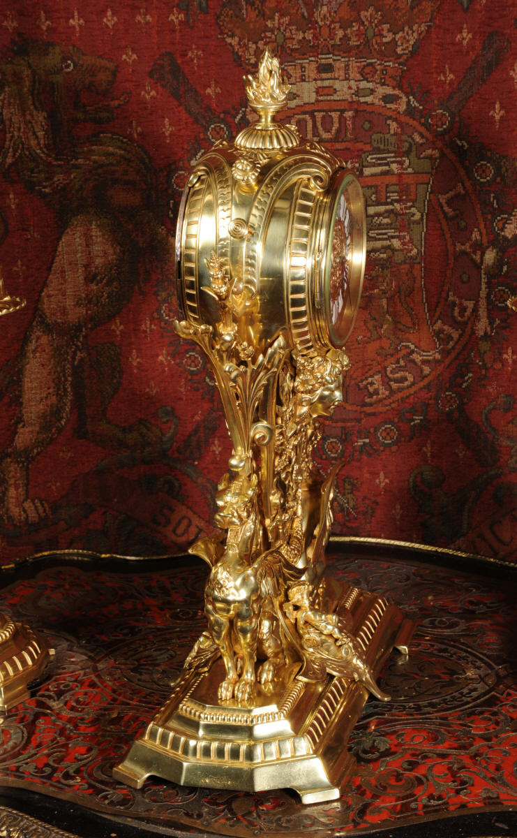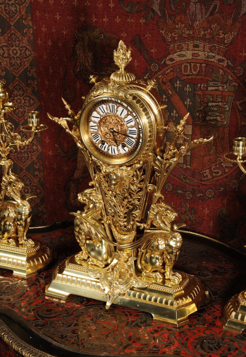 Condition of the case is excellent, the original gilding is beautifully clean and bright with just some slight wear and discolouration in places. The reverse of one dragon has a small piece of wing missing, this is at the rear of the clock case. The rear door has been re-built at some time. The dial is also in good condition, there is some slight restoration to some of the cartouches. The set makes a stunning display as you can see below.