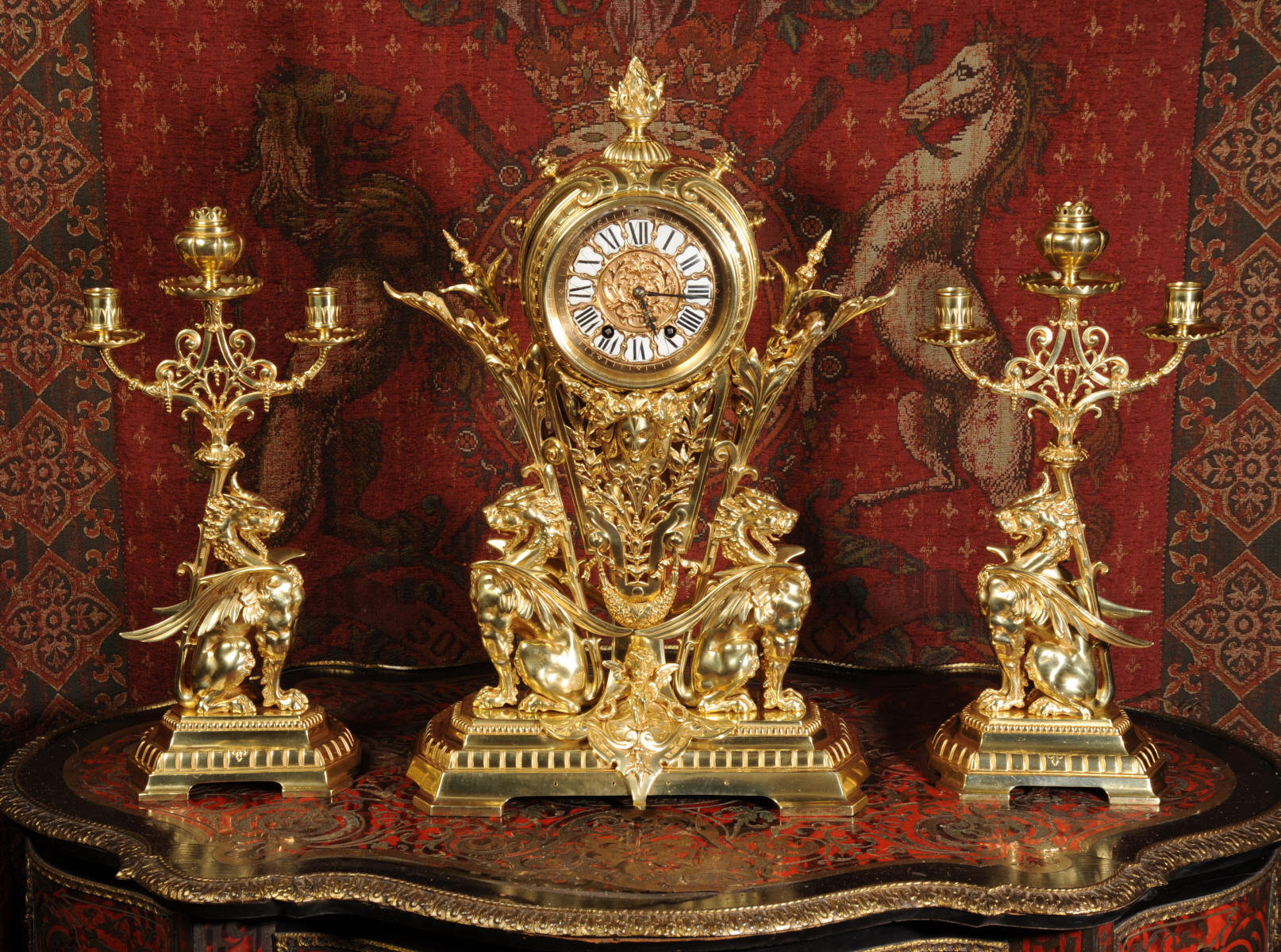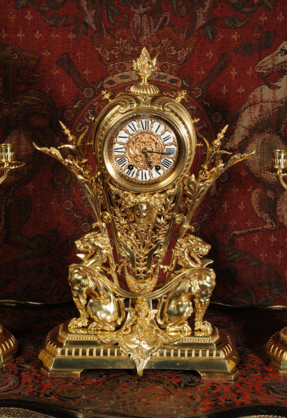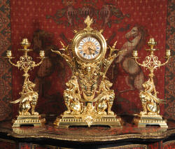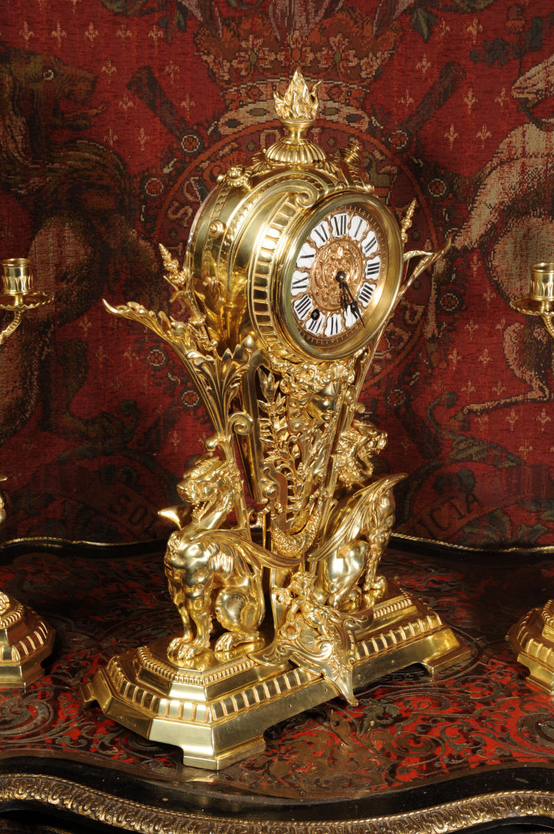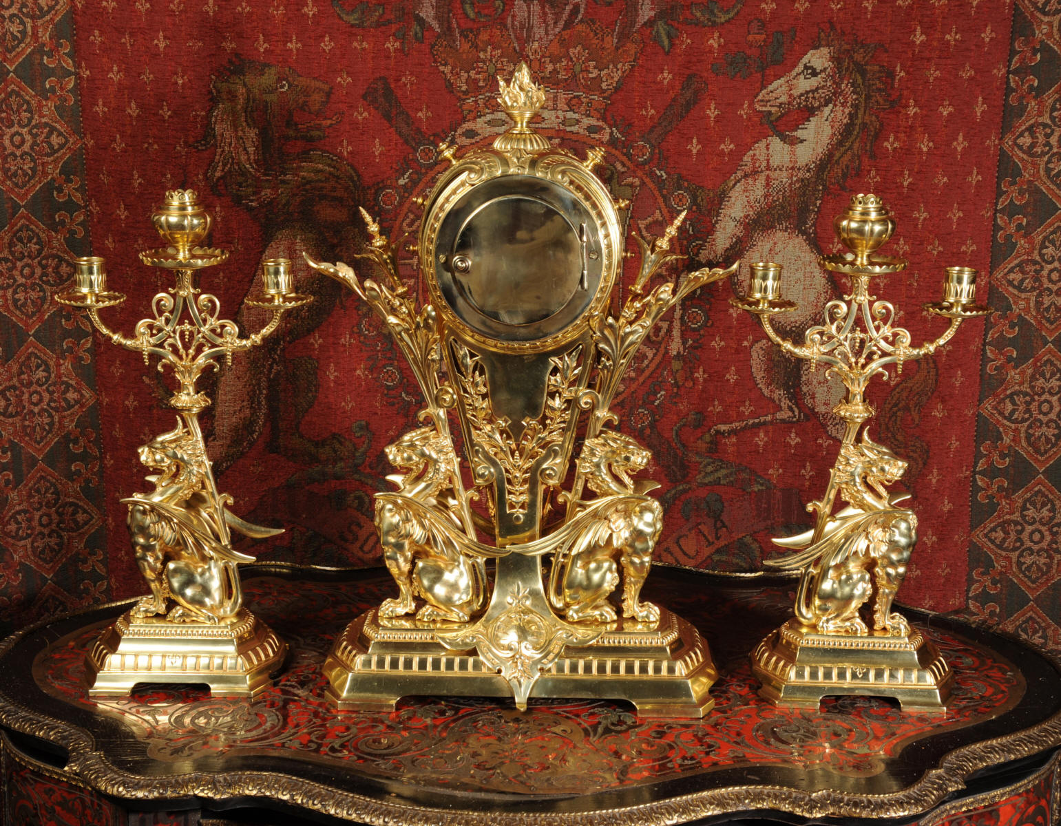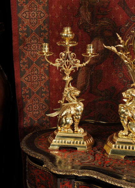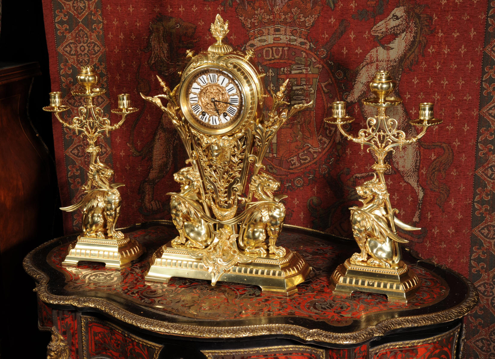 Condition of the case is excellent, the original gilding is beautifully clean and bright with just some slight wear and discolouration in places. The reverse of one dragon has a small piece of wing missing, this is at the rear of the clock case. The rear door has been re-built at some time. The dial is also in good condition, there is some slight restoration to some of the cartouches. The set makes a stunning display as you can see below.