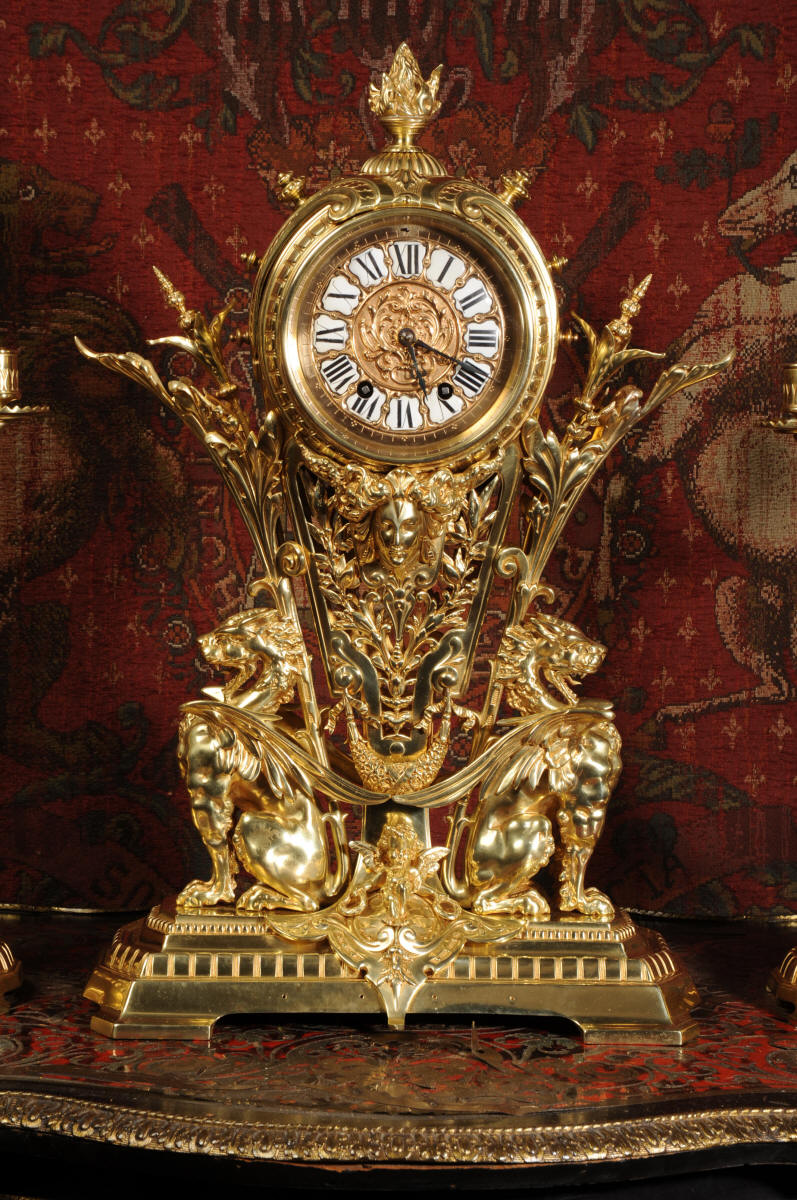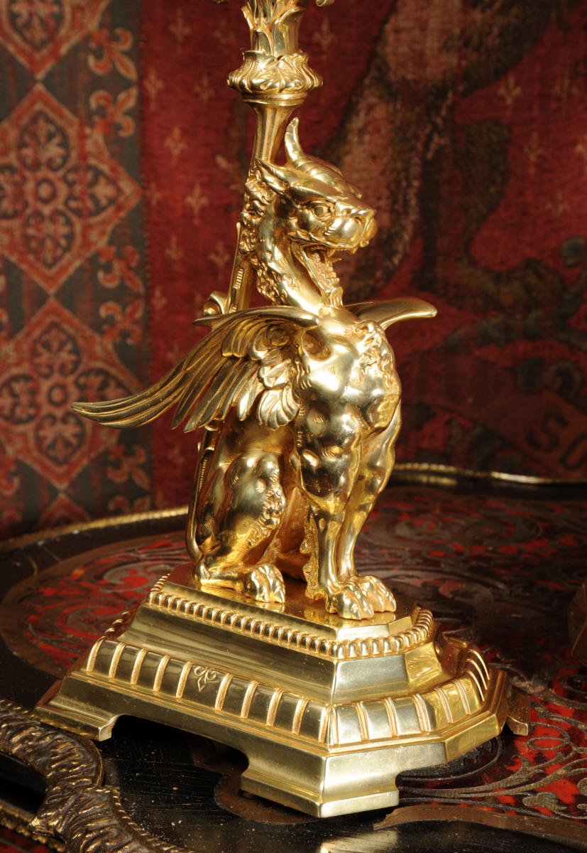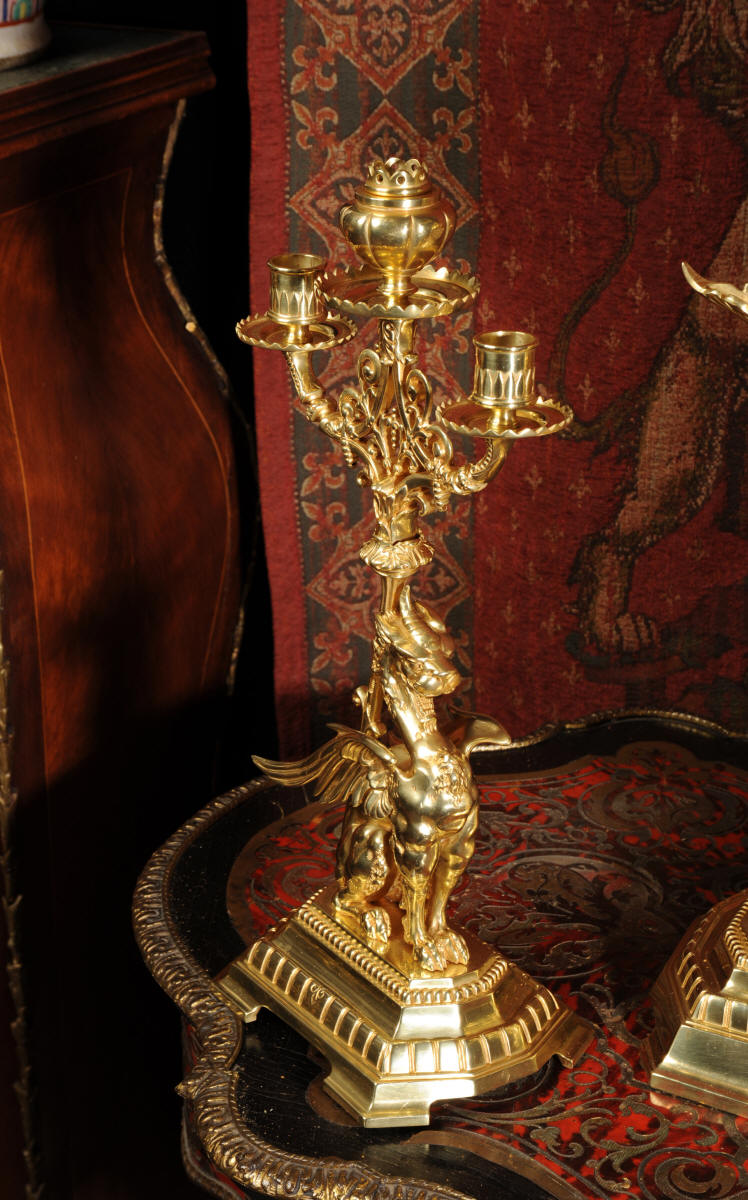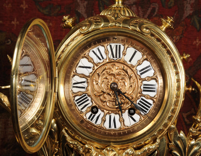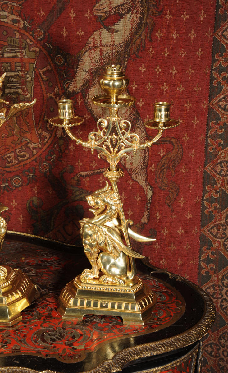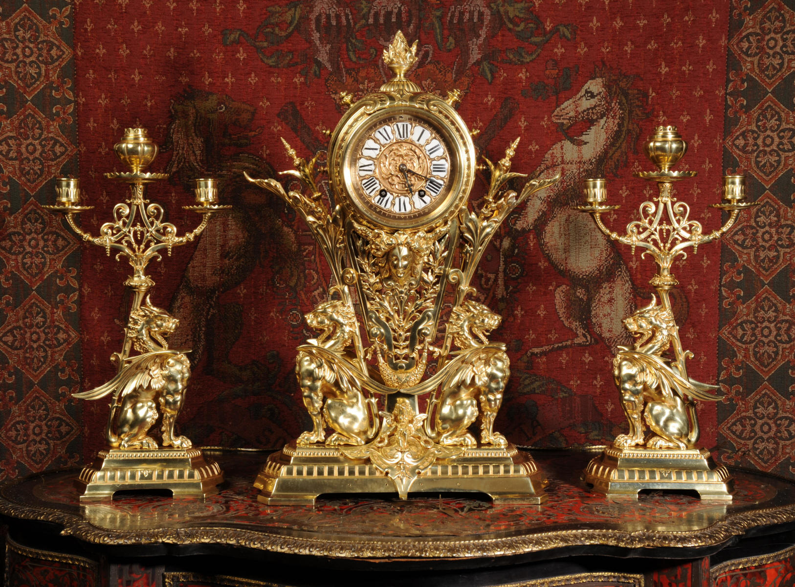 Condition of the case is excellent, the original gilding is beautifully clean and bright with just some slight wear and discolouration in places. The reverse of one dragon has a small piece of wing missing, this is at the rear of the clock case. The rear door has been re-built at some time. The dial is also in good condition, there is some slight restoration to some of the cartouches. The set makes a stunning display as you can see below.