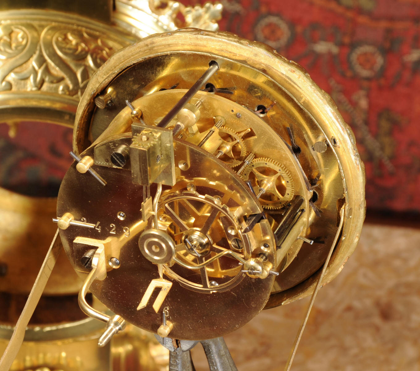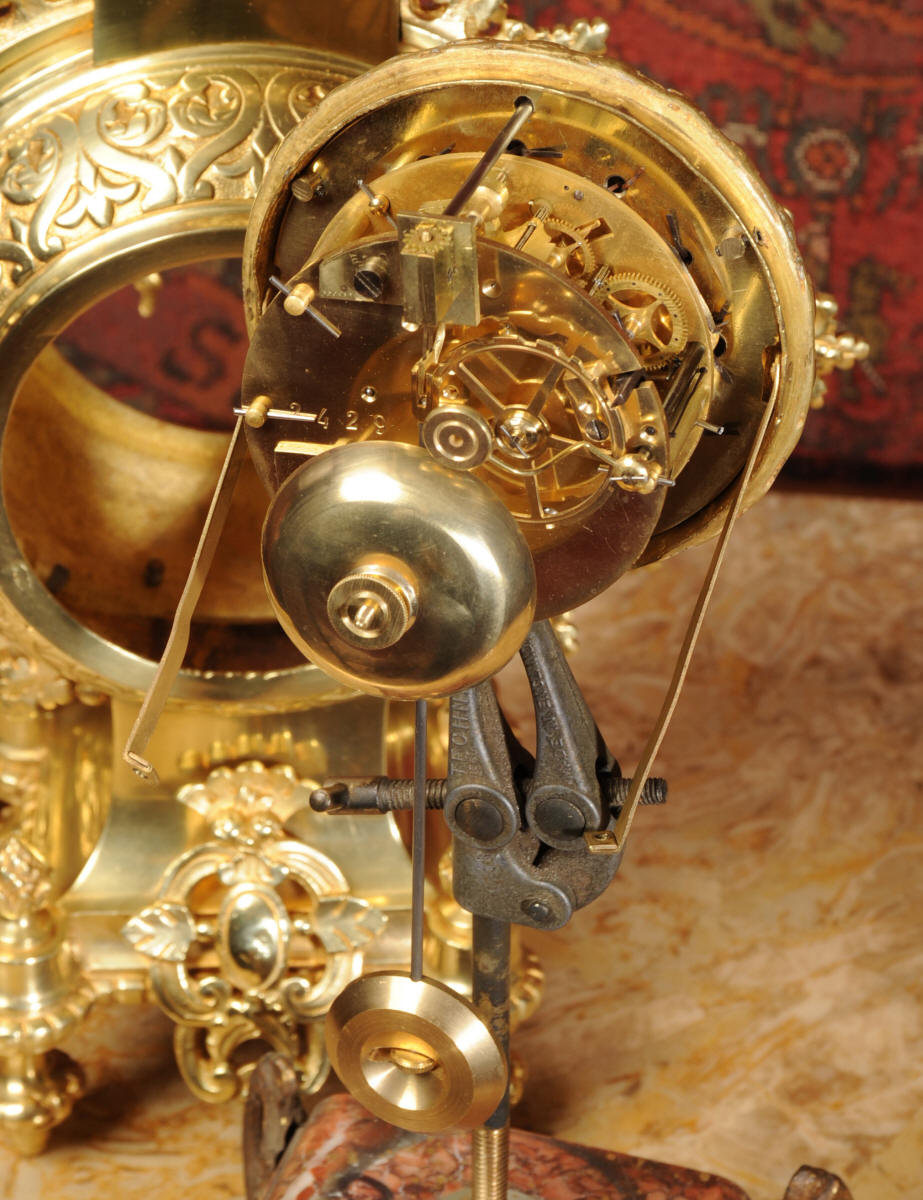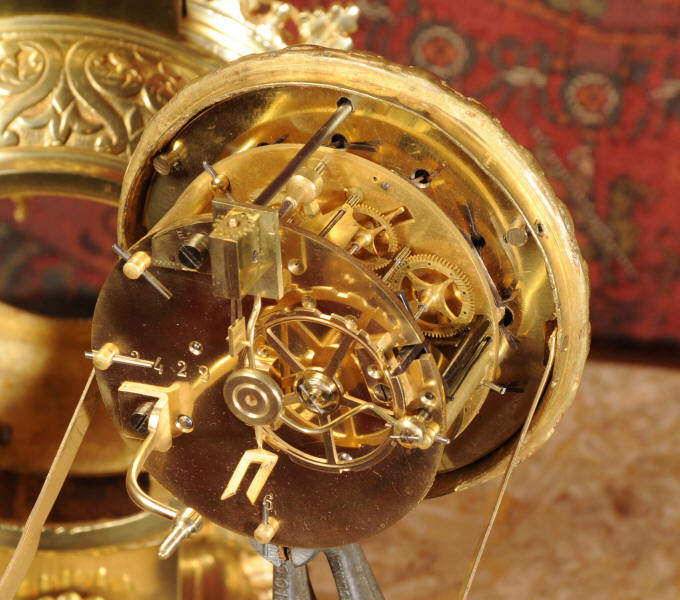 The French movement is of high quality and is in excellent clean and running condition having been fully overhauled by our clockmaker. Pendulum is a replacement. It runs for 8 days and strikes the hours and halves on a bell. Click the video clip below to hear the bell and watch the clock running!