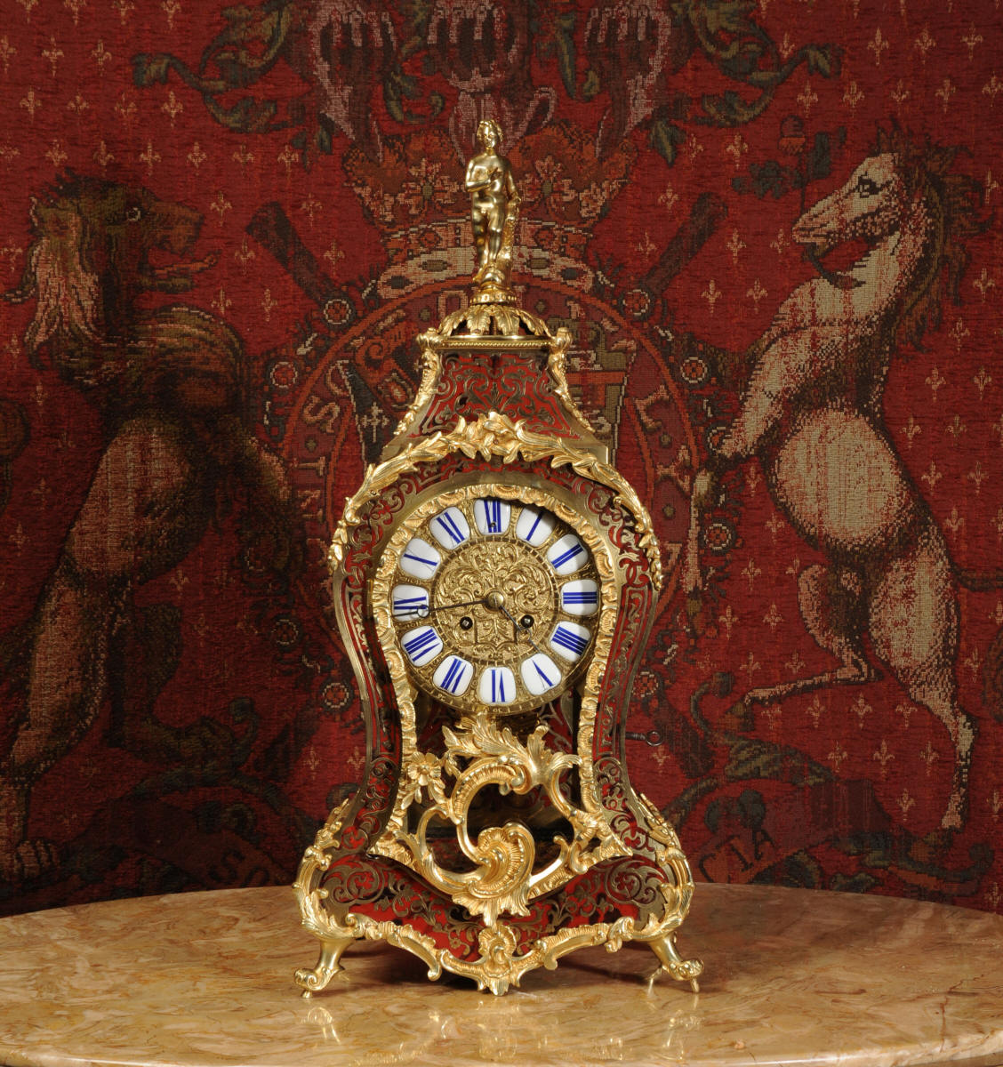The large and elaborate dial is also ormolu with 12 individual enamel cartouches and blued steel hands.