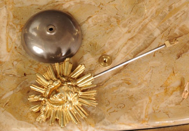 The French movement is of high quality and is by Japy Freres, the Japy Freres mark is on the movement backplate. It is in excellent clean and running condition having been fully overhauled by our clockmaker. Ormolu sunburst pendulum is original. It runs for 8 days and strikes the hours and halves on a bell. The front door lock is fully working with the original key. Click the video clip below to hear the bell and watch the clock running!