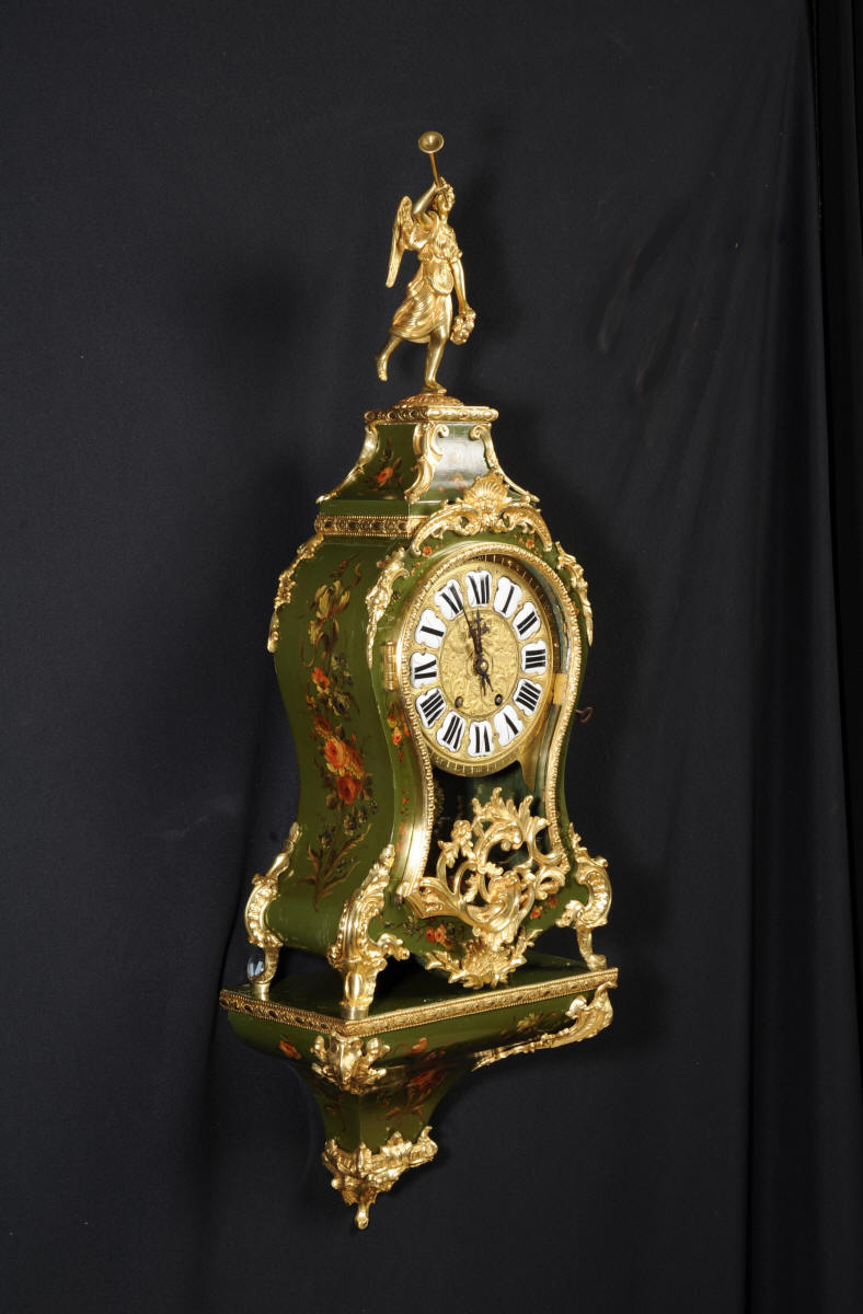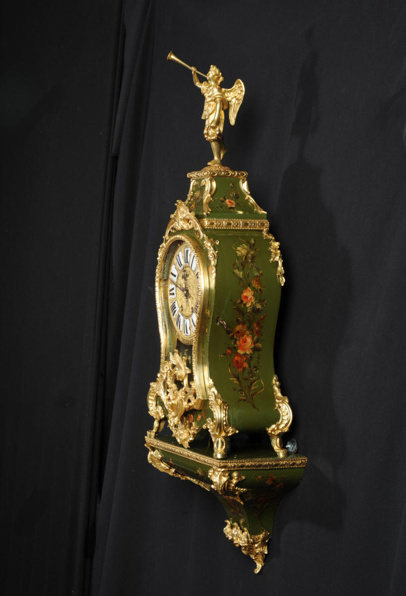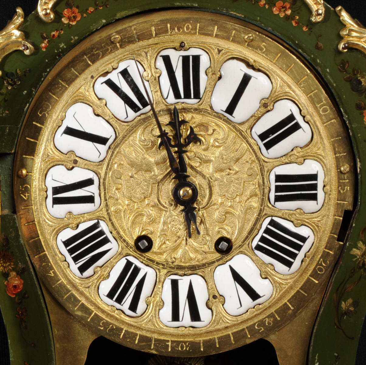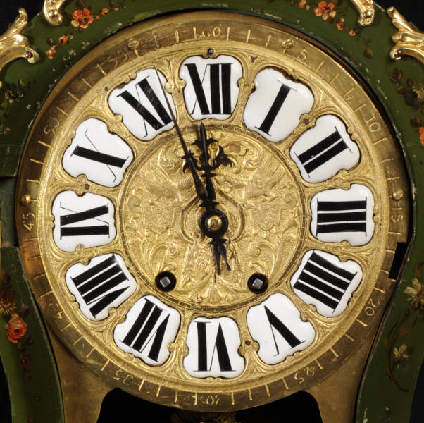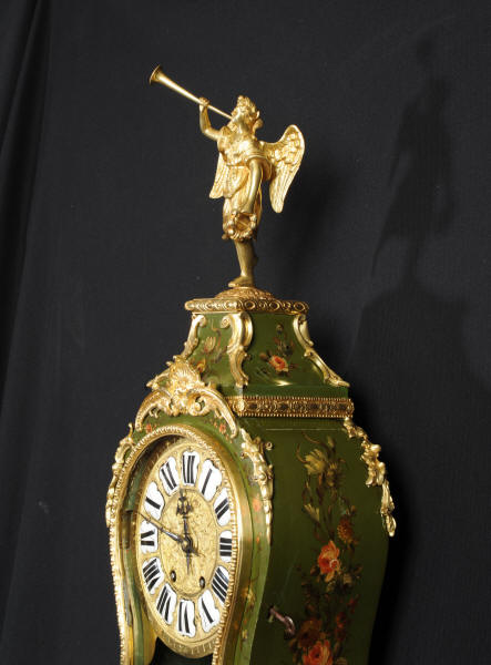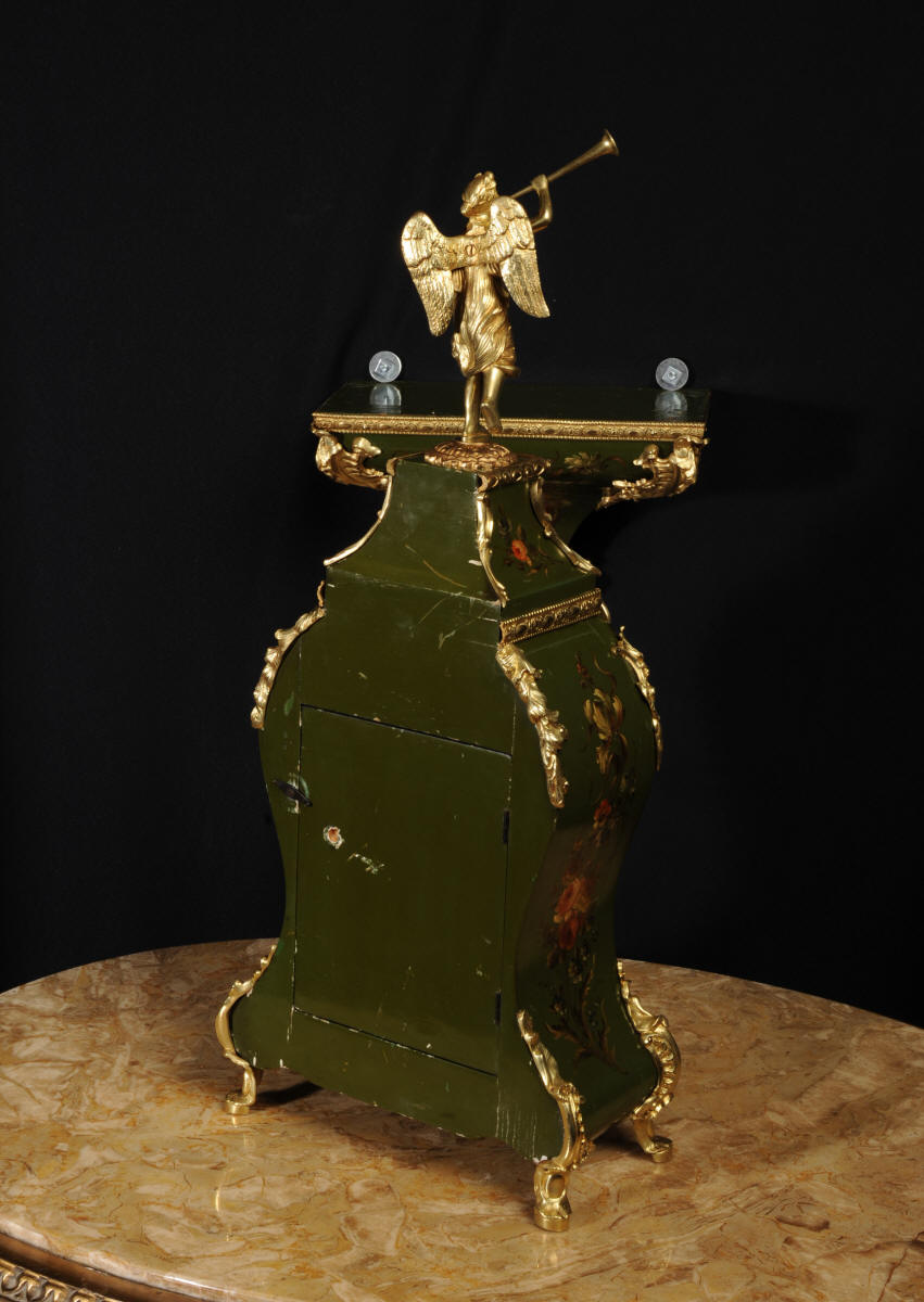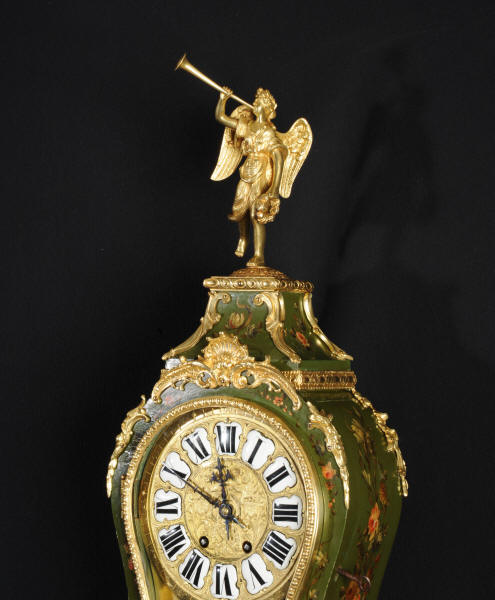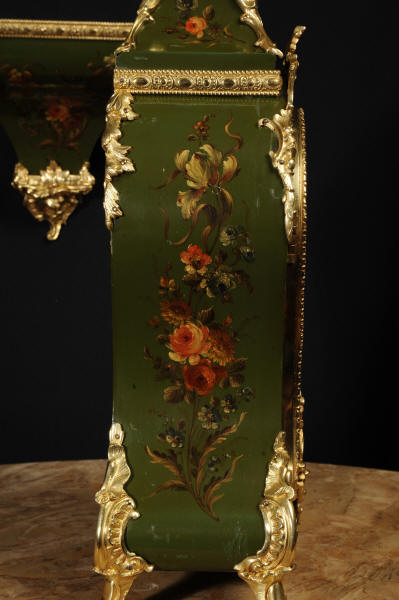 The very large dial is ormolu, mounted with 12 individual enamel cartouches for the hours. It is fitted with the original hand cut and blued steel hands. Both the inside of the rear door and the base of the inside are also decorated with Vernis Martin work and there is a pencil signature on the underside of the base, this may be that of the artist.