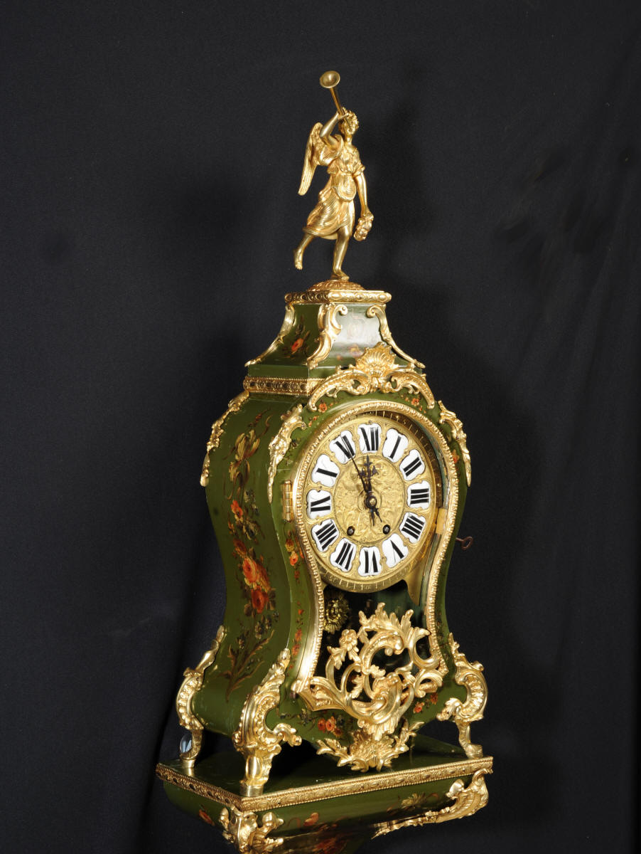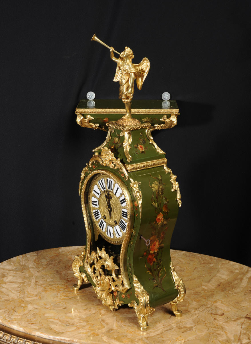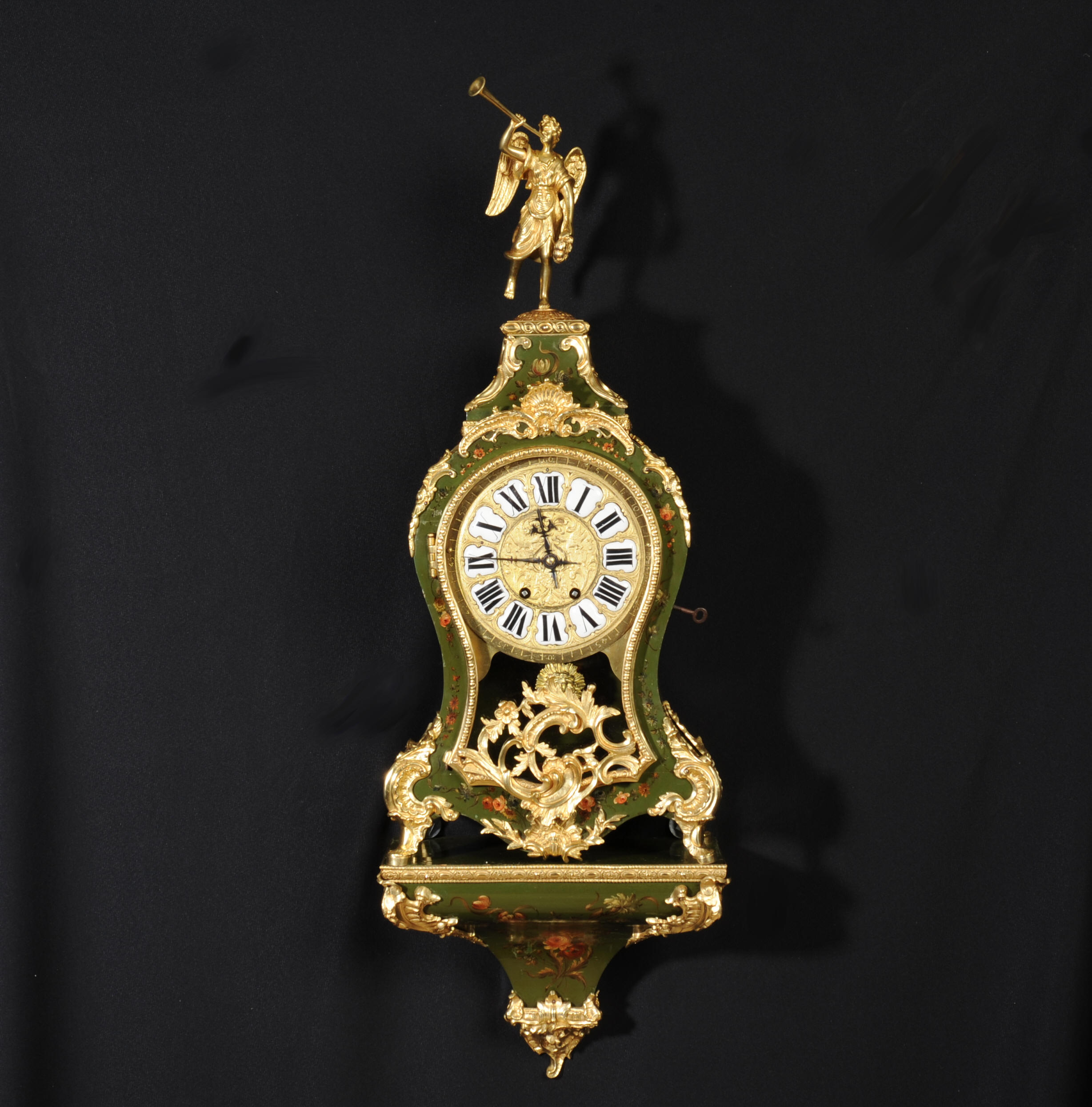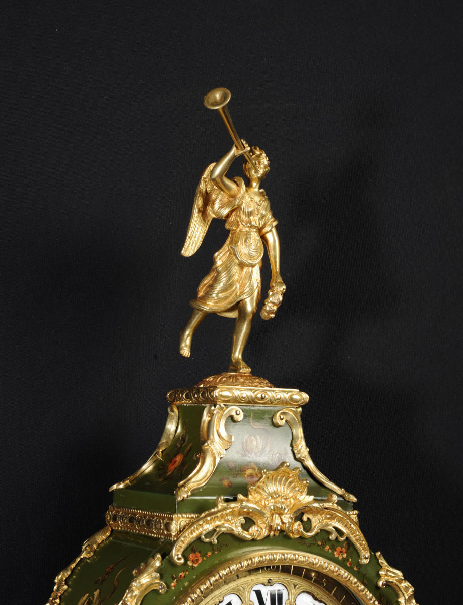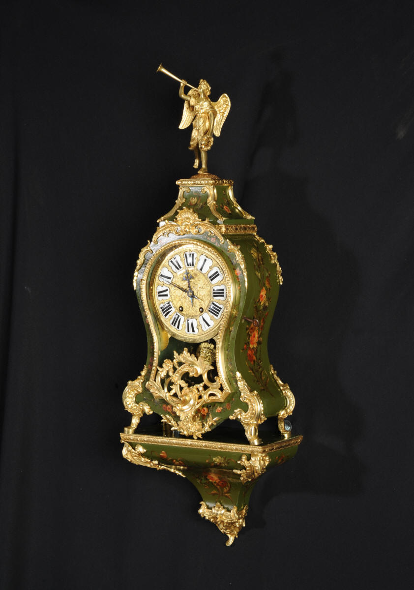 The very large dial is ormolu, mounted with 12 individual enamel cartouches for the hours. It is fitted with the original hand cut and blued steel hands. Both the inside of the rear door and the base of the inside are also decorated with Vernis Martin work and there is a pencil signature on the underside of the base, this may be that of the artist.