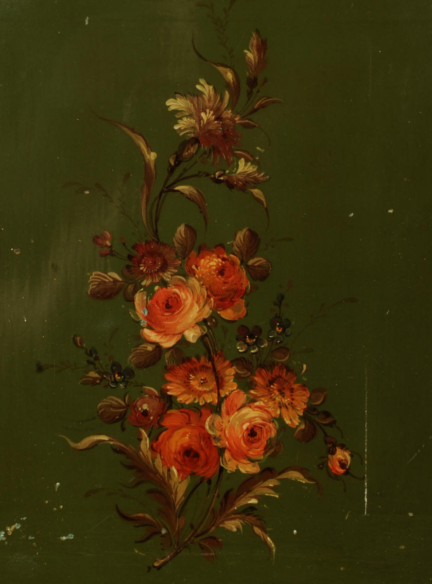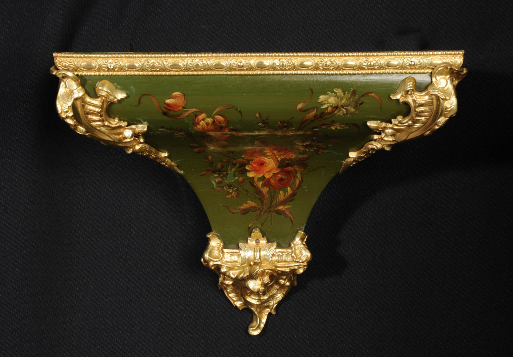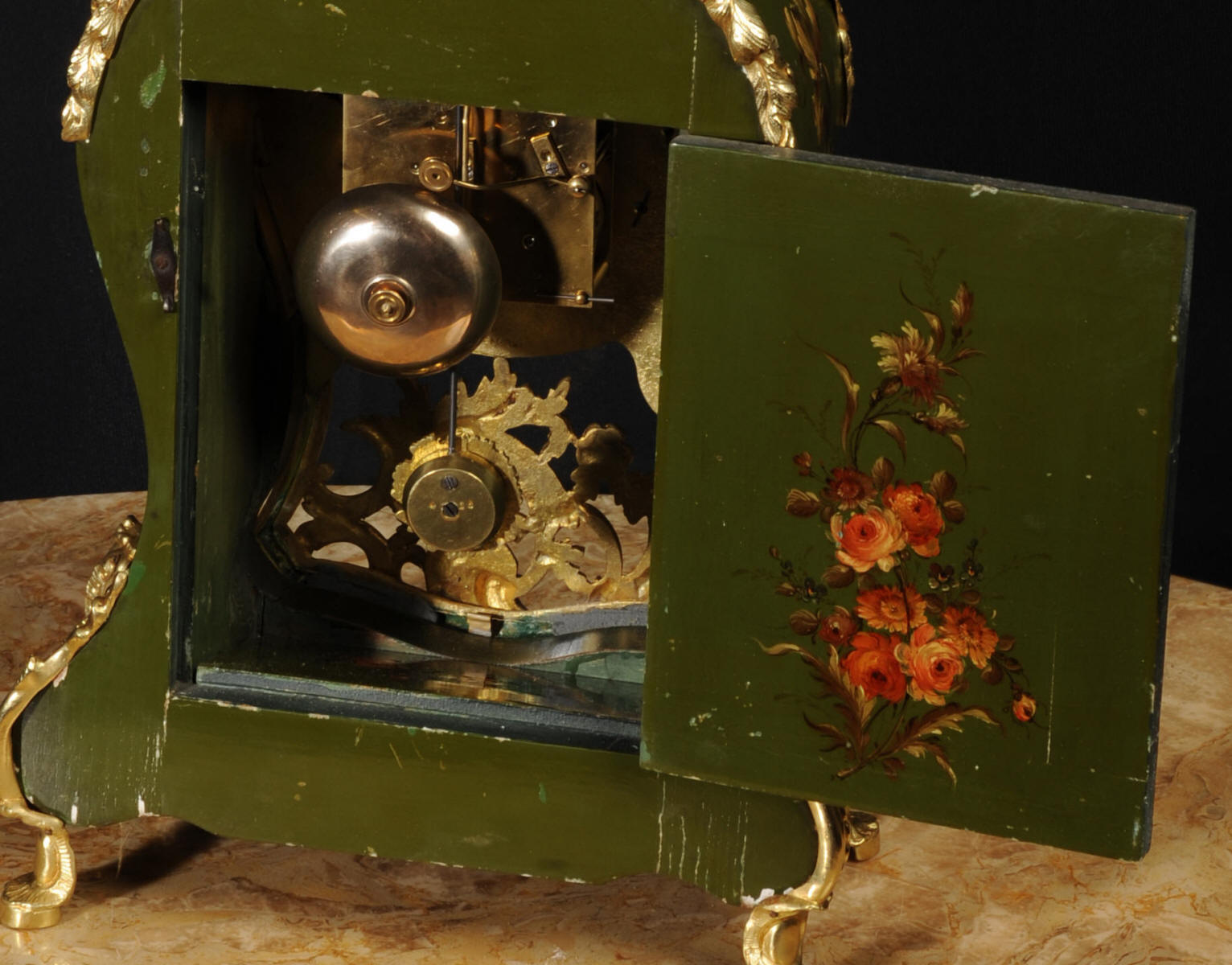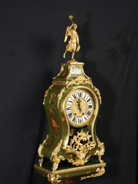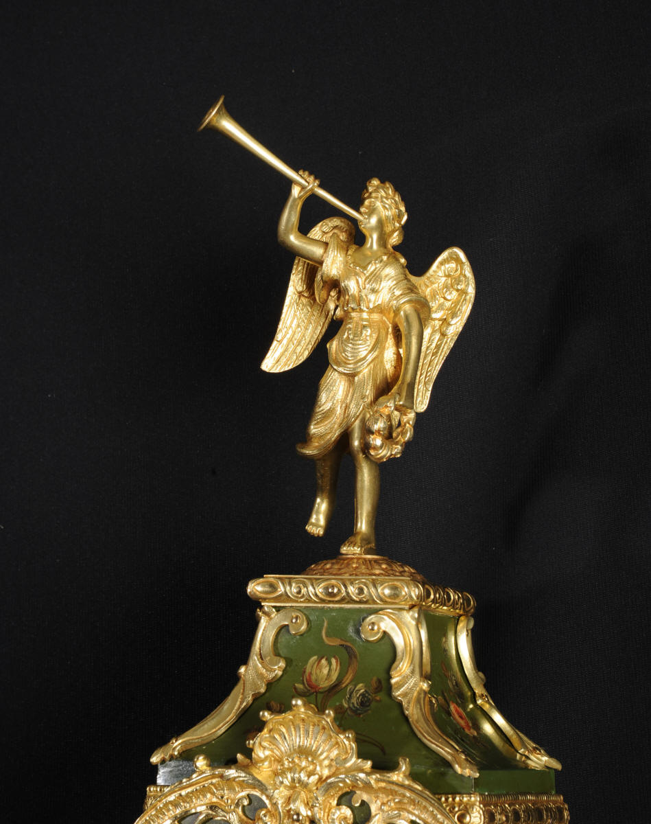 The very large dial is ormolu, mounted with 12 individual enamel cartouches for the hours. It is fitted with the original hand cut and blued steel hands. Both the inside of the rear door and the base of the inside are also decorated with Vernis Martin work and there is a pencil signature on the underside of the base, this may be that of the artist.