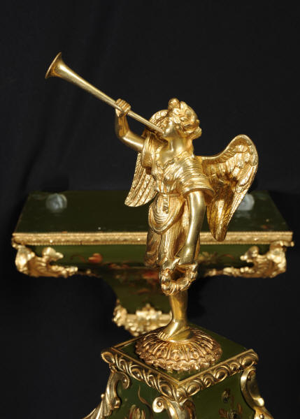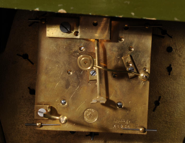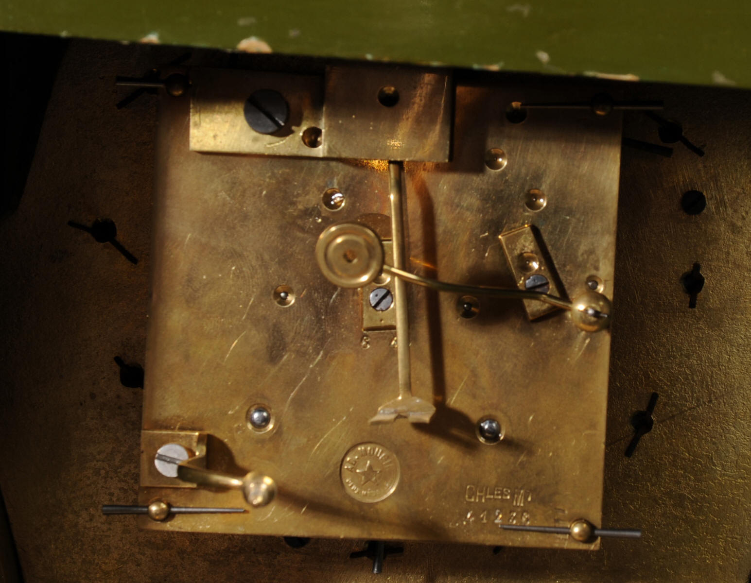 The French movement is of the highest quality and is by A. D. Mougin. The clockmakers mark is on the backplate along with that of the retailer. It is the large square plated version of the Pendule de Paris movement and has the benefit of pin-pallet escapement and rack striking. It is in excellent clean and running condition having been fully serviced by our clockmaker. Pendulum is original. It runs for 8 days on one wind and strikes the hours and halves on a large, sonorous bell. Click the video clip below to hear the bell and watch the clock running!
