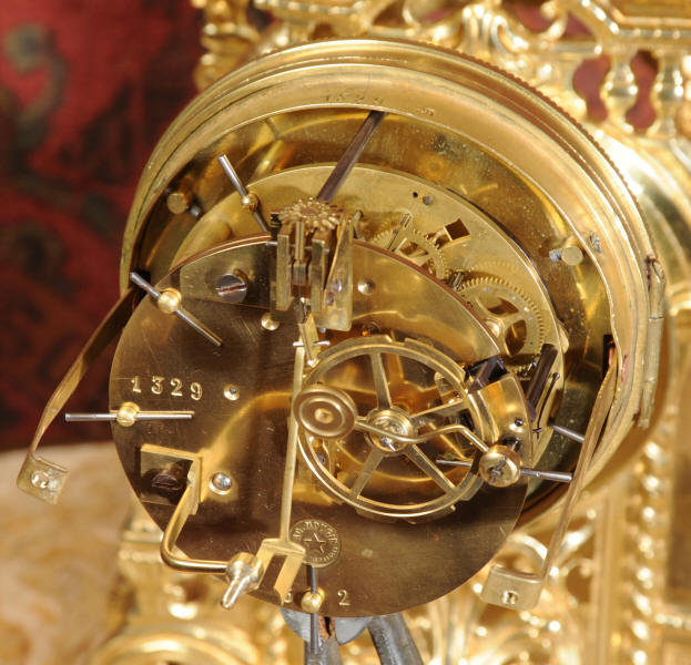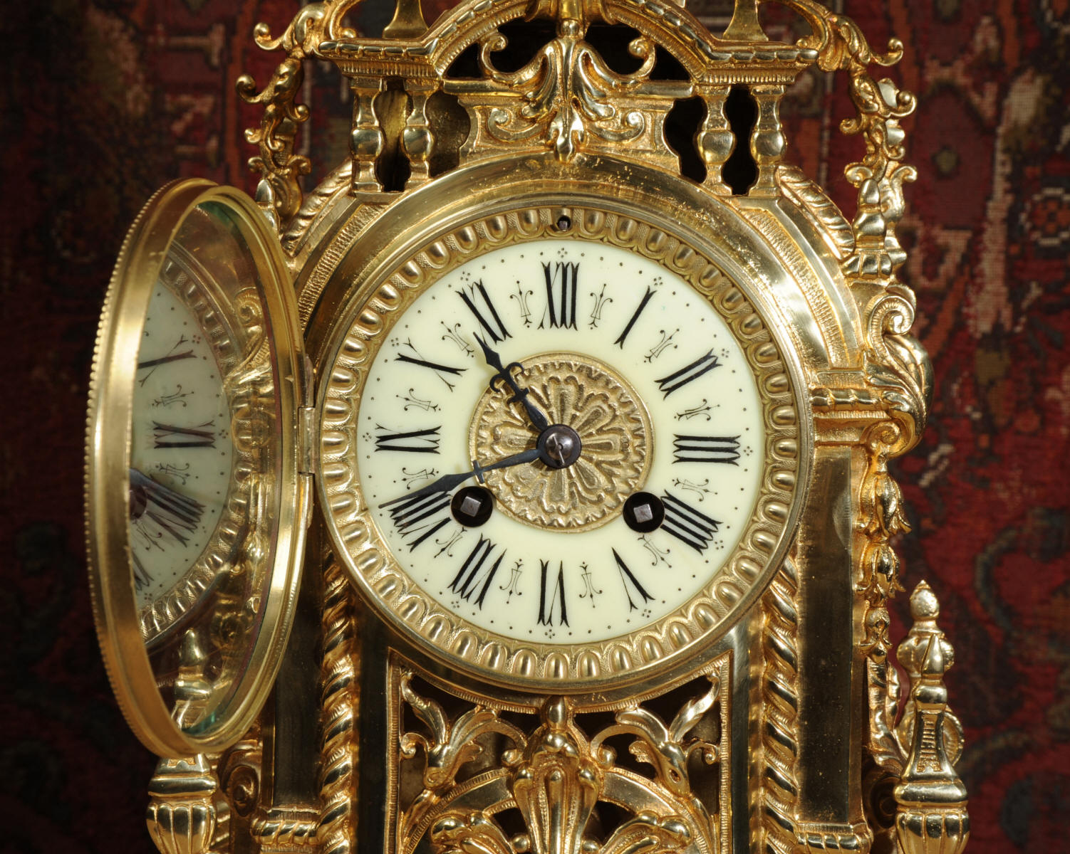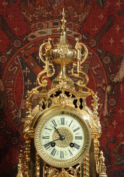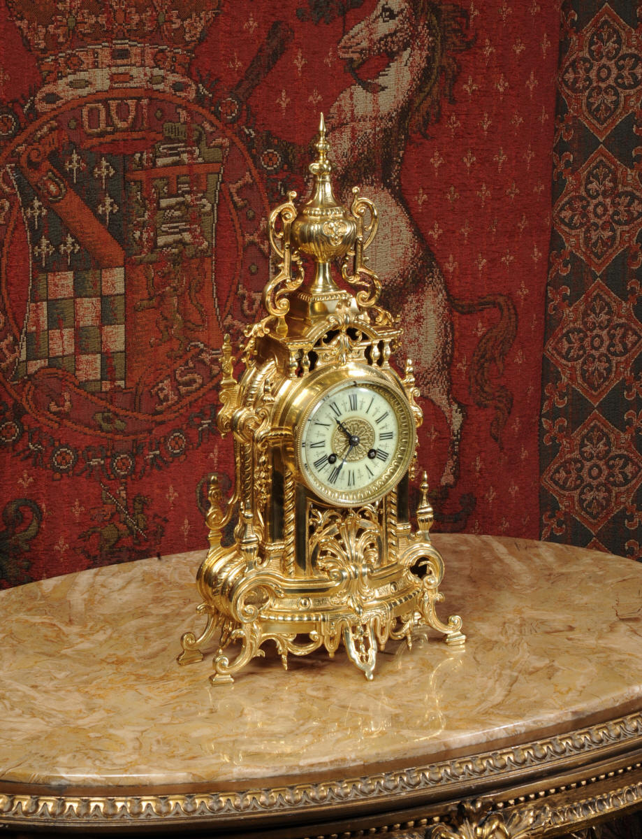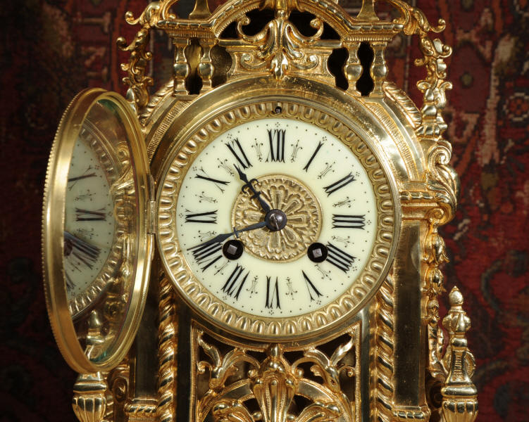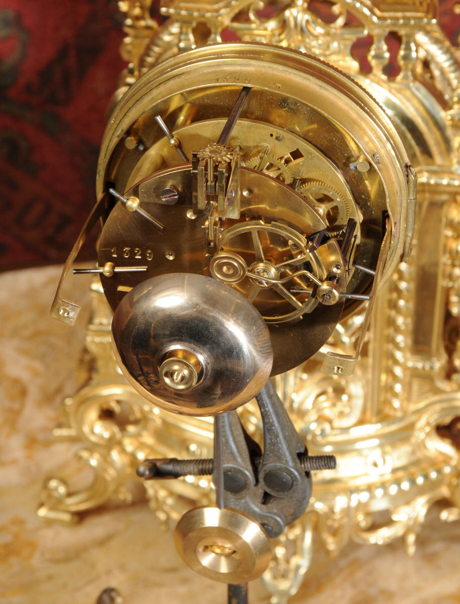 Condition of the case is excellent, the original gilding is beautifully clean and bright with hardly any wear or discolouration and there are no losses. The dial is also in excellent condition with just a faint hairline near the right hand winding hole. The clock makes a stunning display as you can see below.