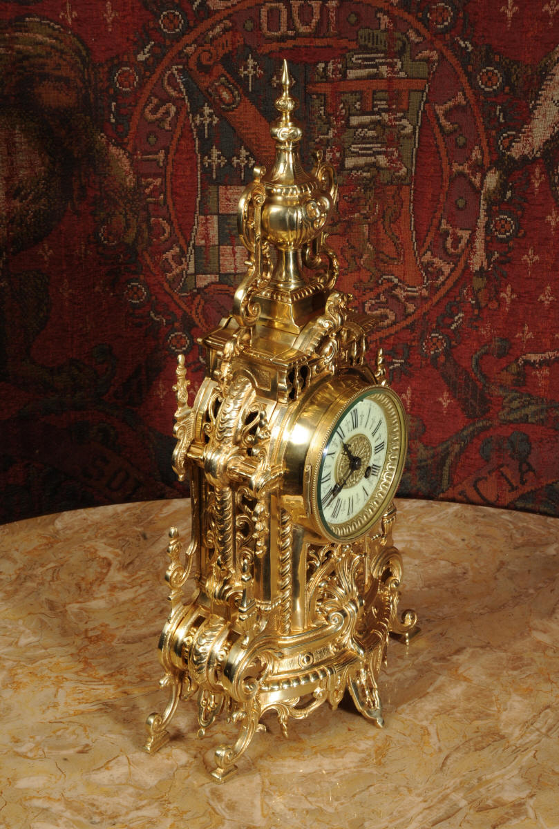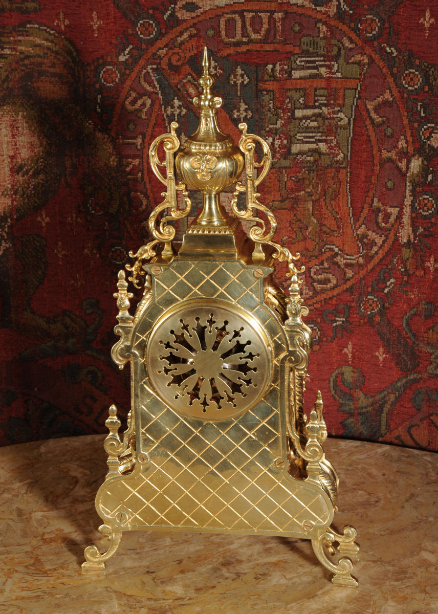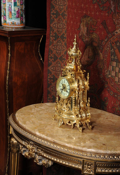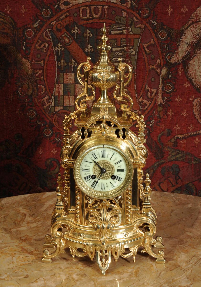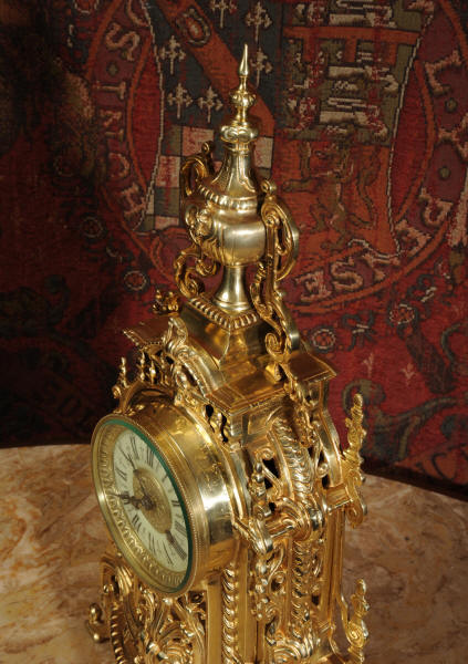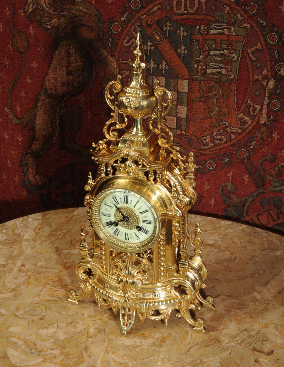 Condition of the case is excellent, the original gilding is beautifully clean and bright with hardly any wear or discolouration and there are no losses. The dial is also in excellent condition with just a faint hairline near the right hand winding hole. The clock makes a stunning display as you can see below.