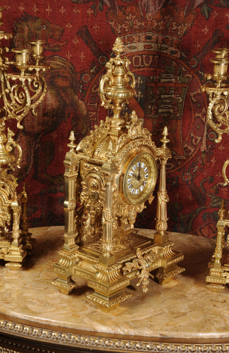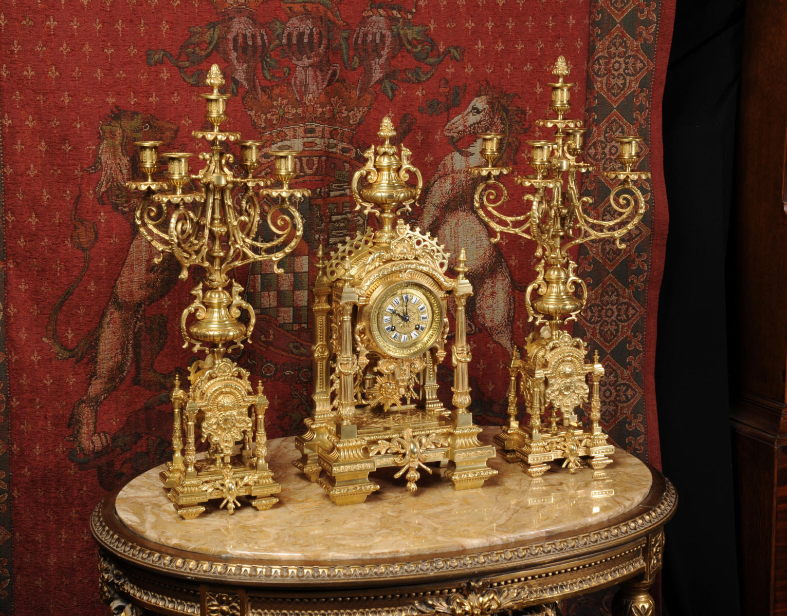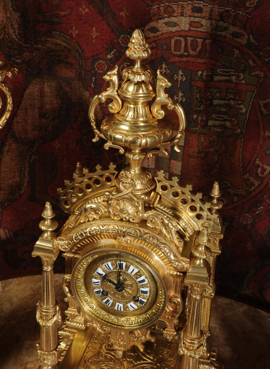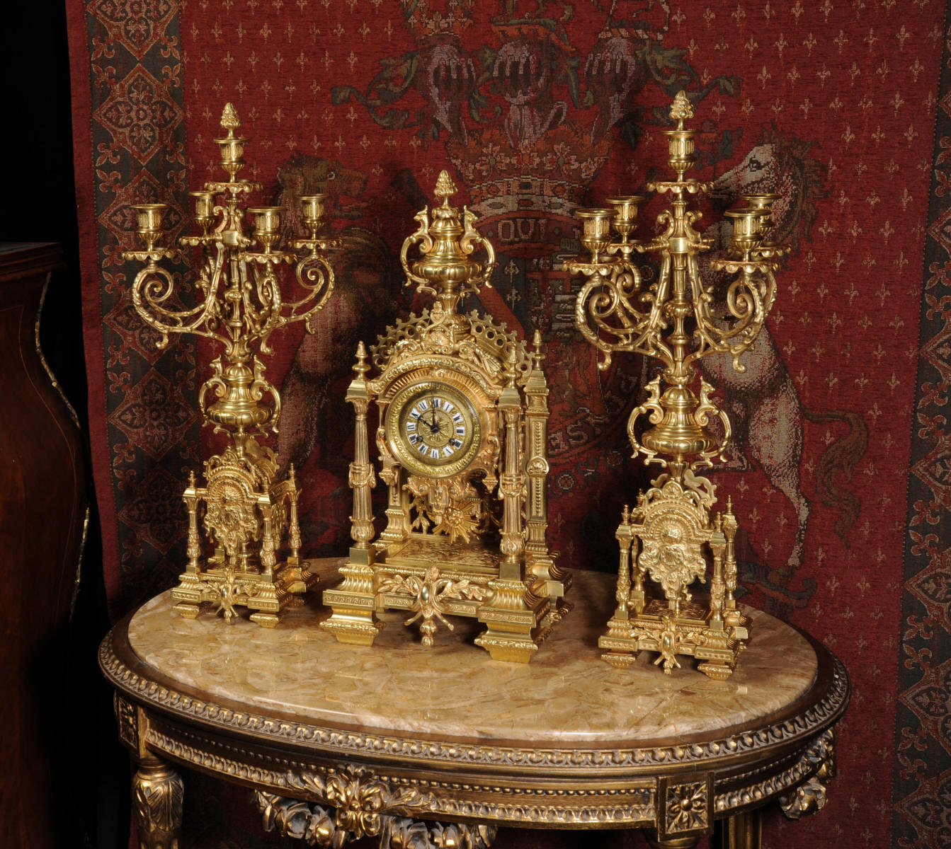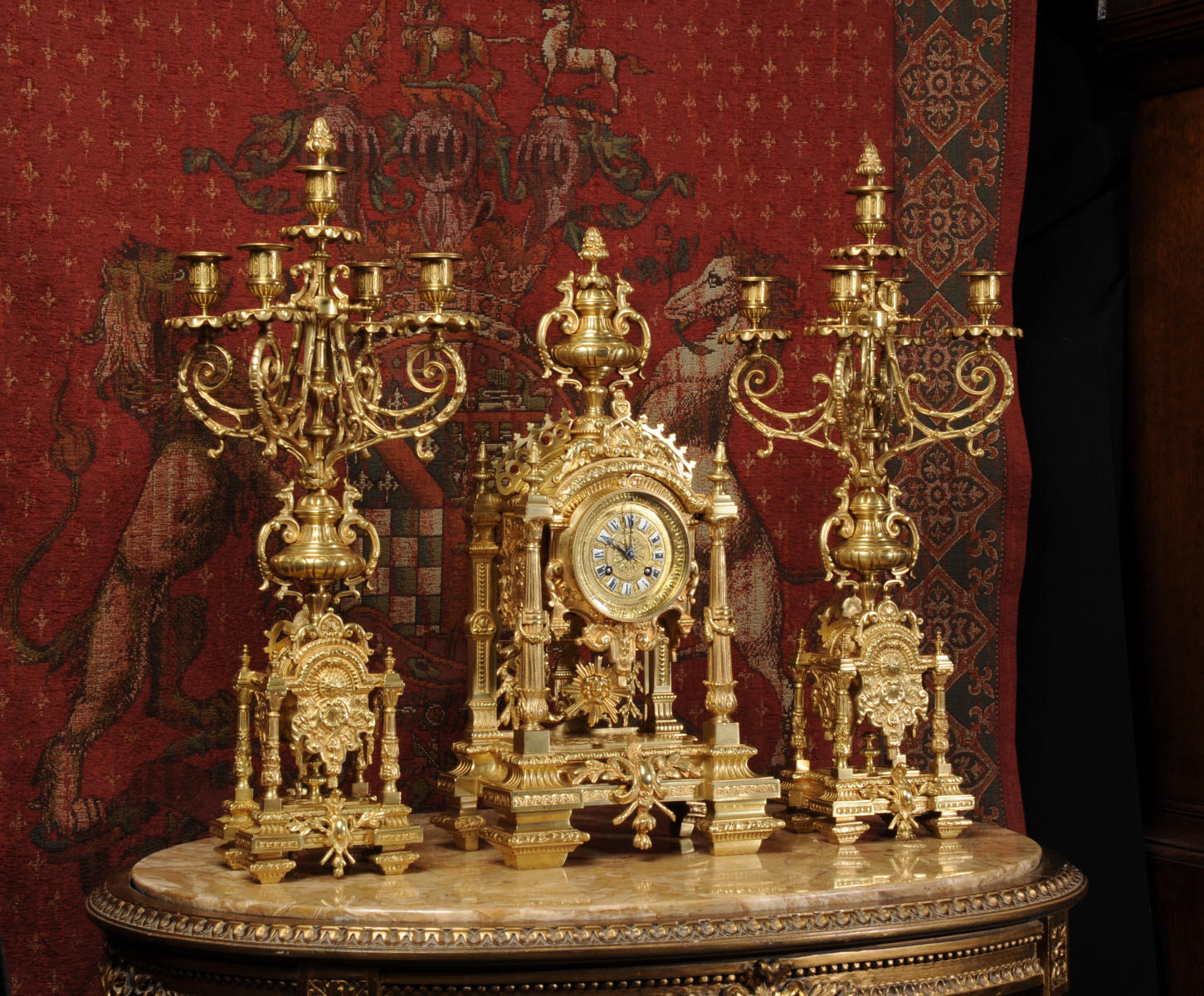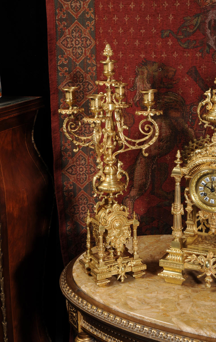 Condition of the case is excellent, the original gilding is beautifully clean and bright with just some slight wear and discolouration and there are no losses. The dial is also in excellent condition, just some chipping around the winding holes. Candelabra are slightly distorted A stunning clock set with visible pendulum.