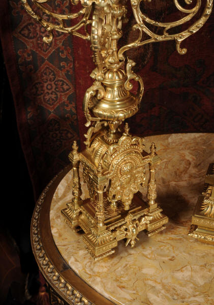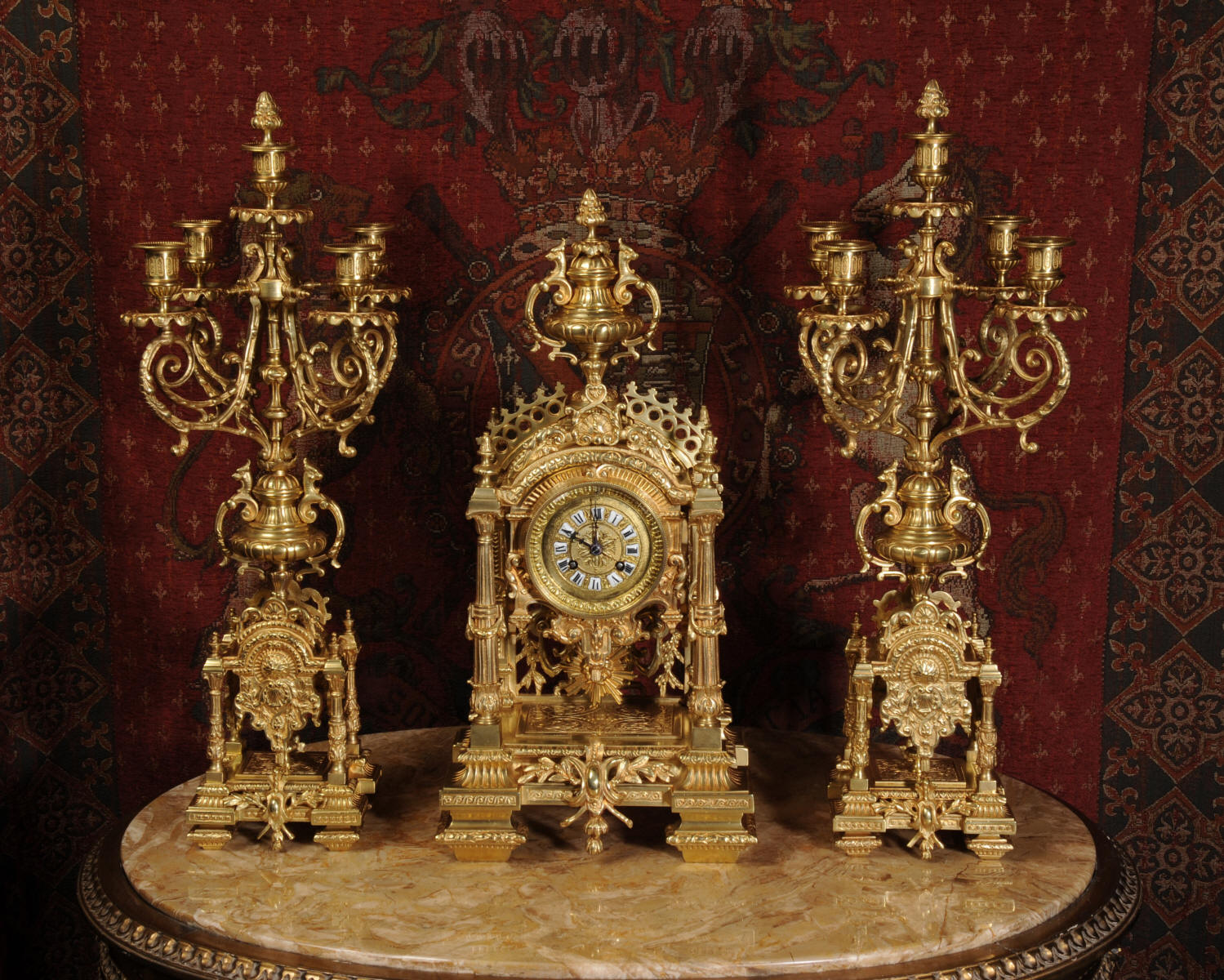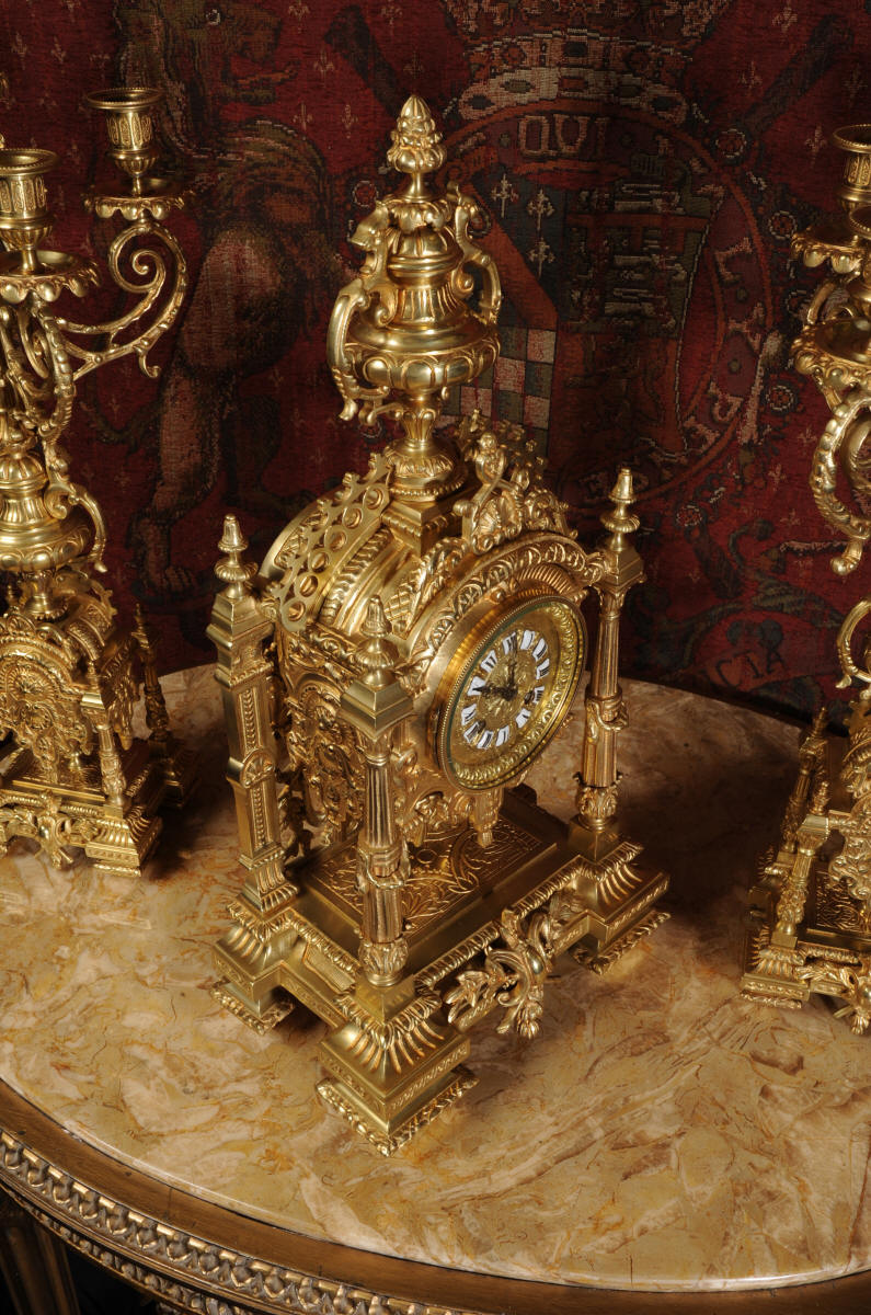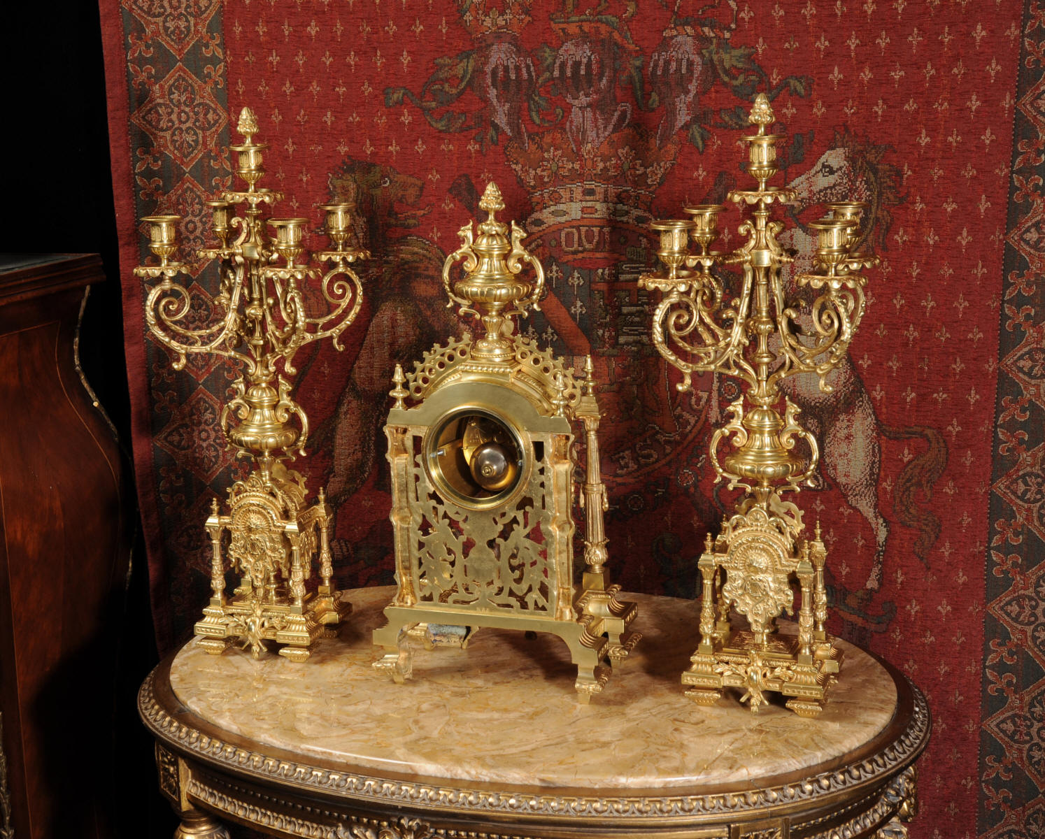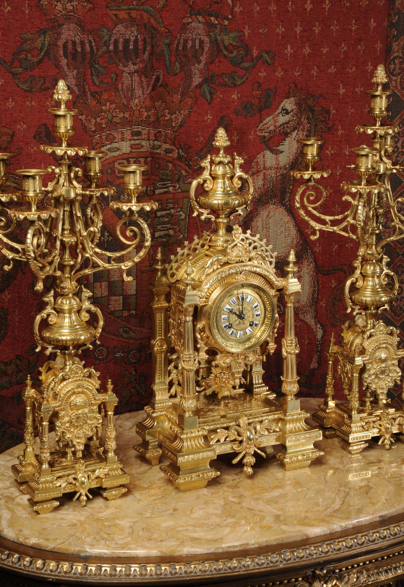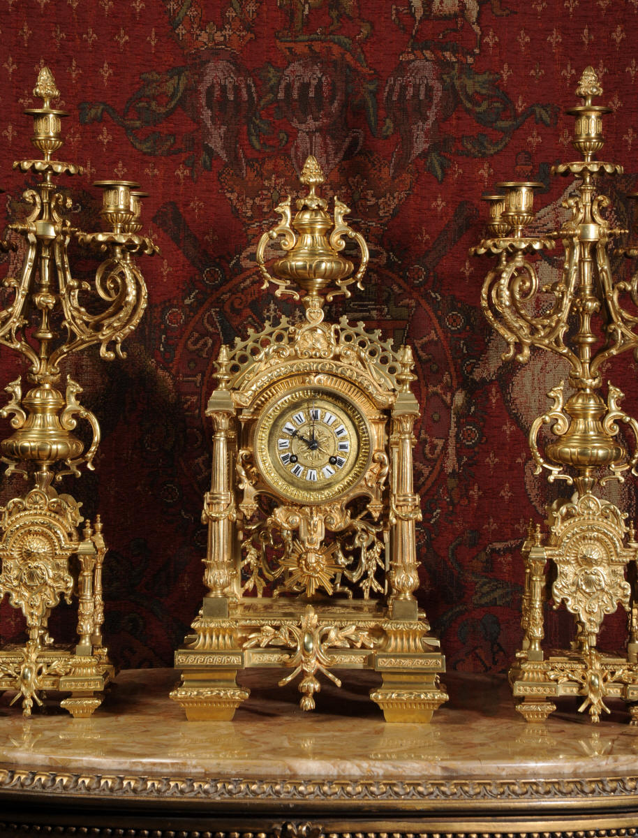 Condition of the case is excellent, the original gilding is beautifully clean and bright with just some slight wear and discolouration and there are no losses. The dial is also in excellent condition, just some chipping around the winding holes. Candelabra are slightly distorted A stunning clock set with visible pendulum.