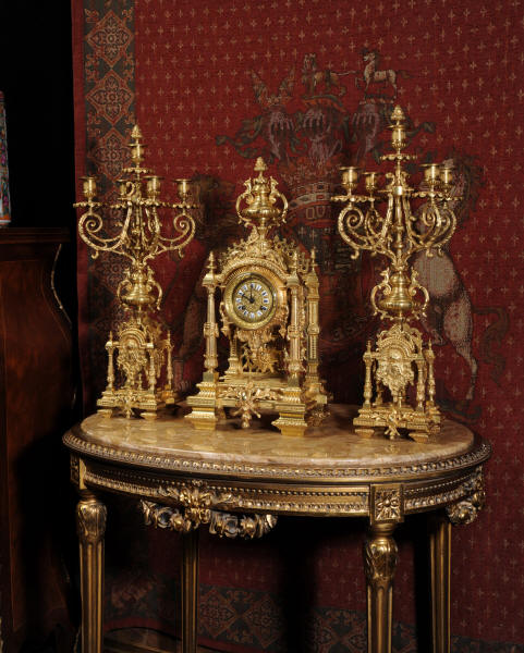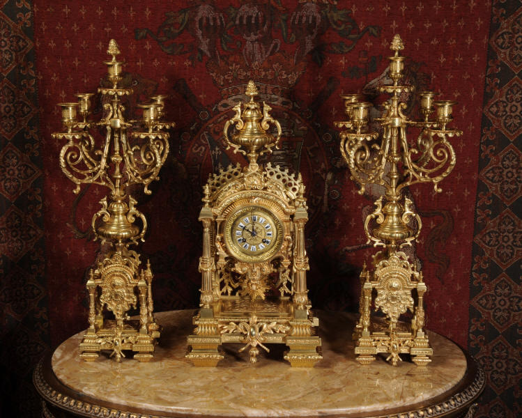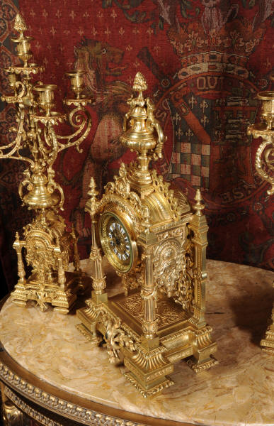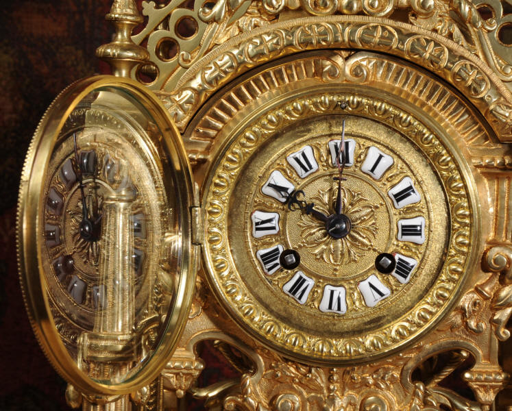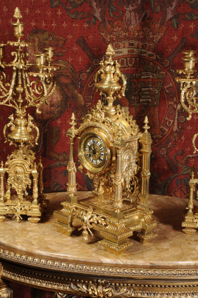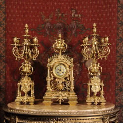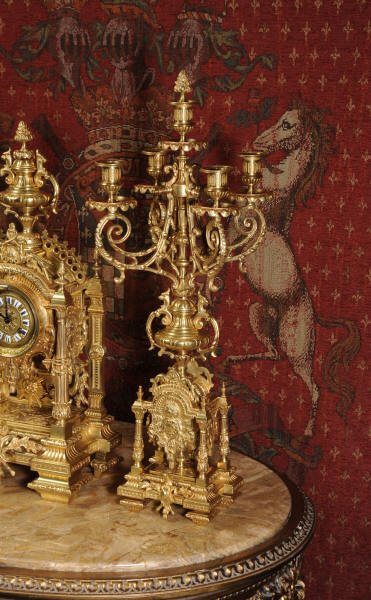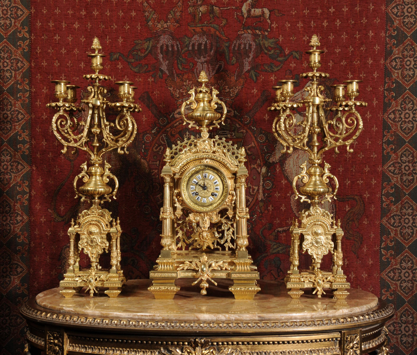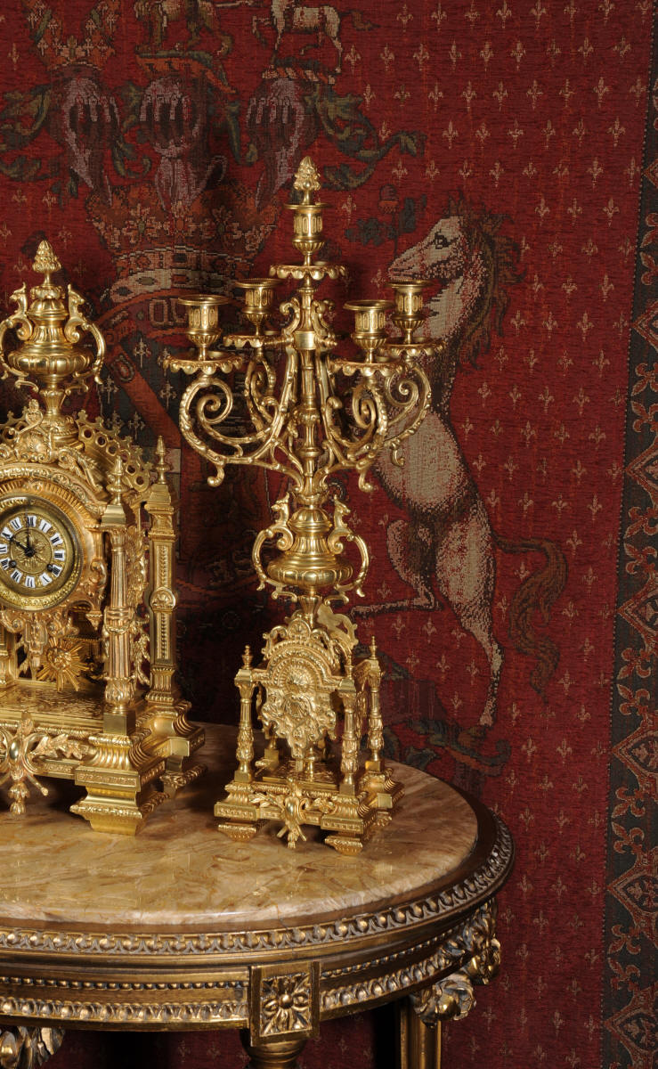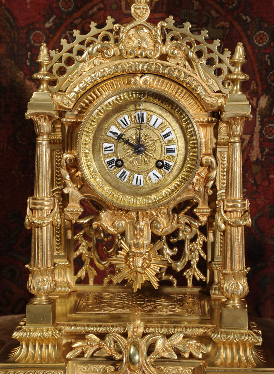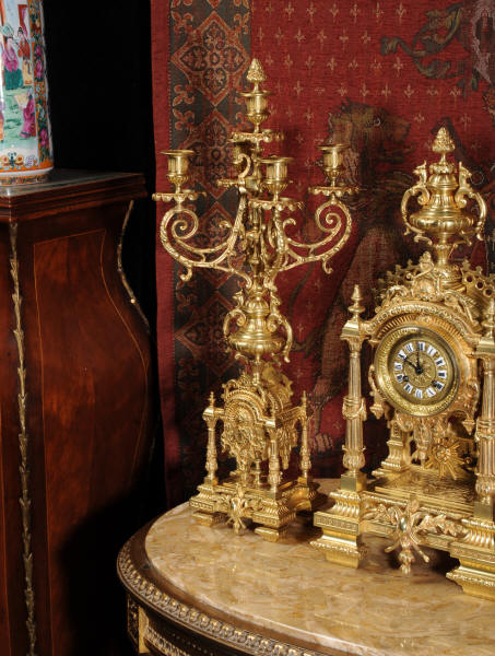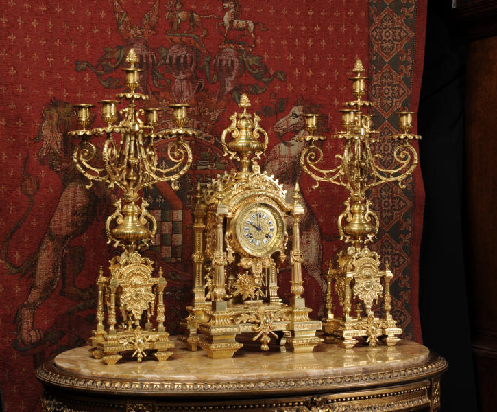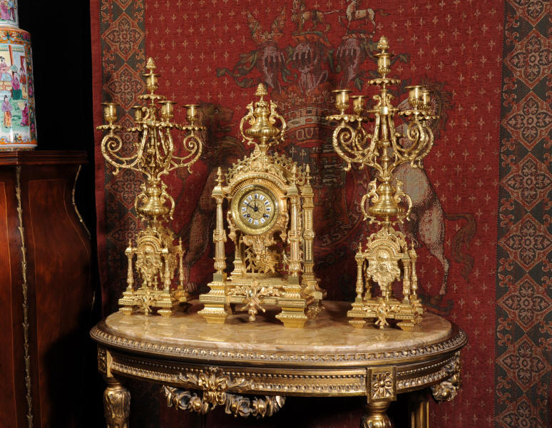 Condition of the case is excellent, the original gilding is beautifully clean and bright with just some slight wear and discolouration and there are no losses. The dial is also in excellent condition, just some chipping around the winding holes. Candelabra are slightly distorted A stunning clock set with visible pendulum.