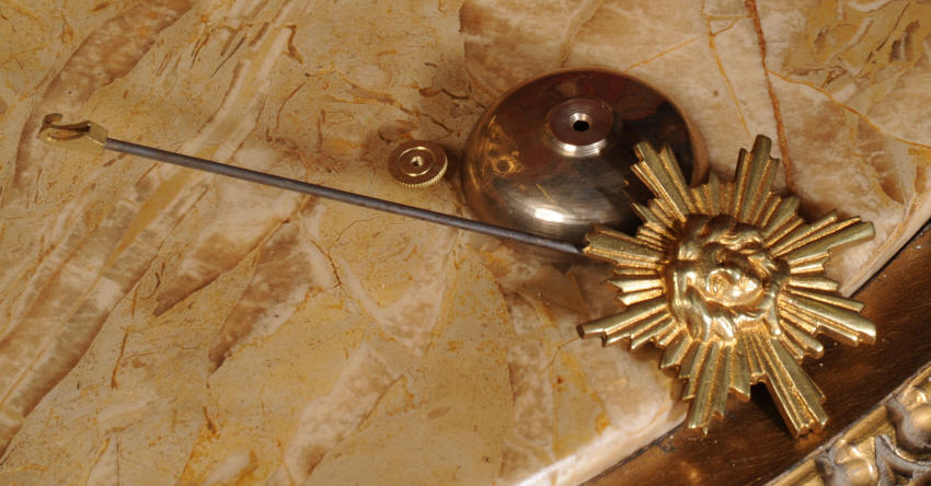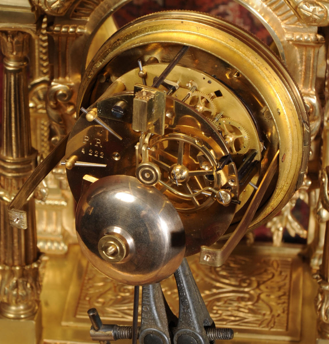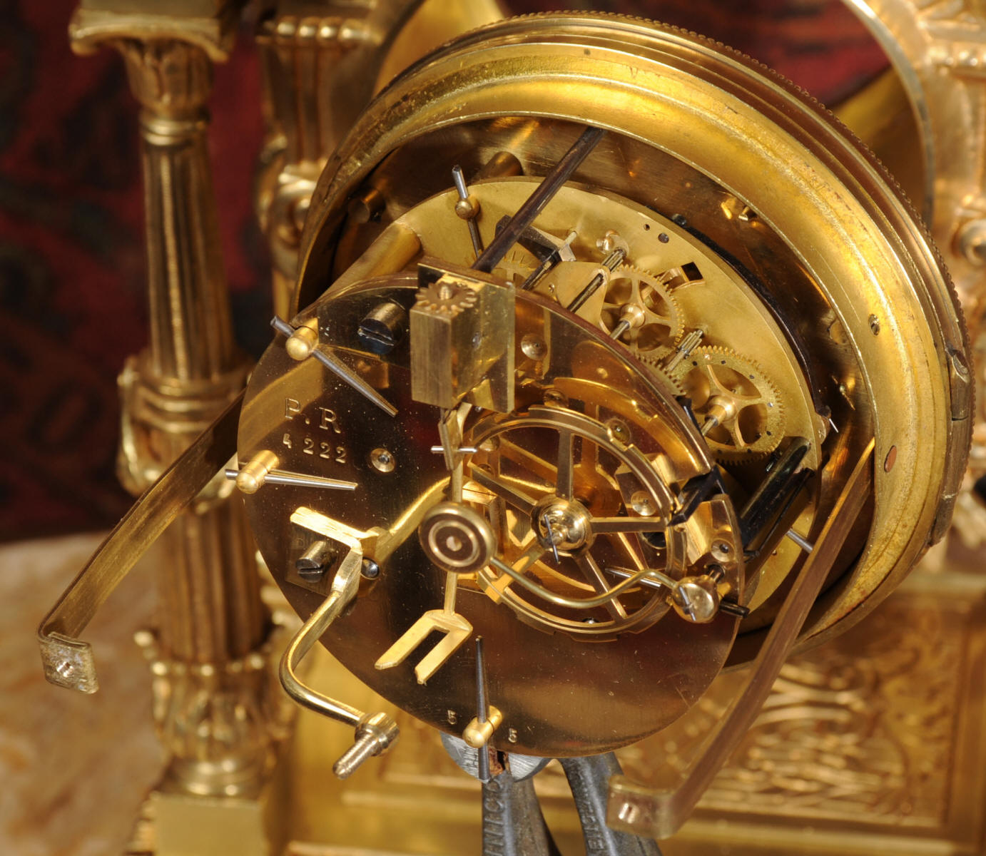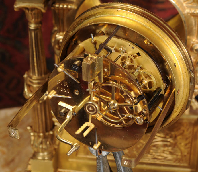 The French movement is of high quality and is in excellent clean and running condition having been fully overhauled by our clockmaker. The gilt bronze sun burst pendulum is probably original. It runs for 8 days and strikes the hours and halves on a bell. Click the video clip below to hear the bell and watch the clock running!