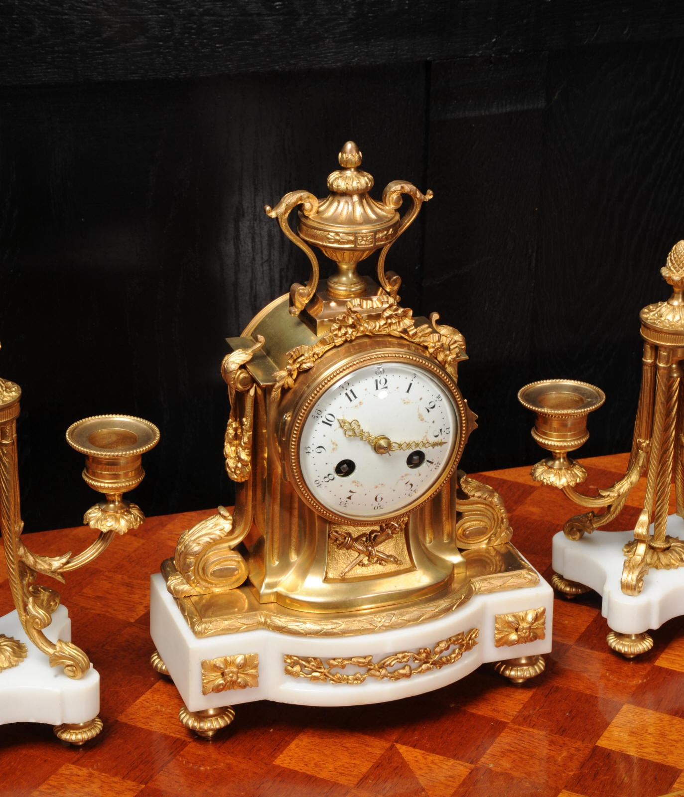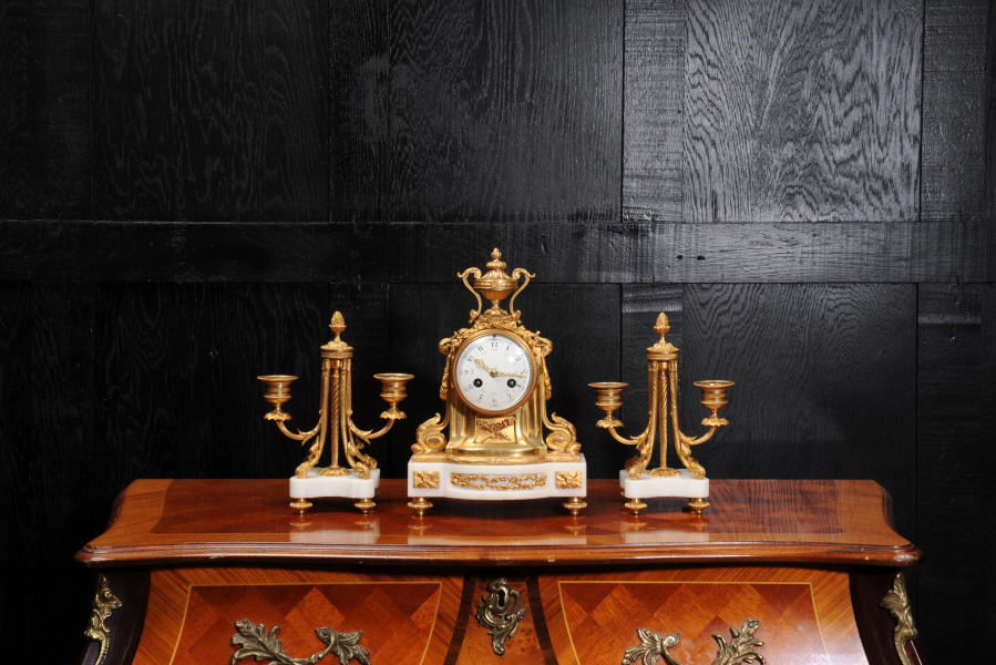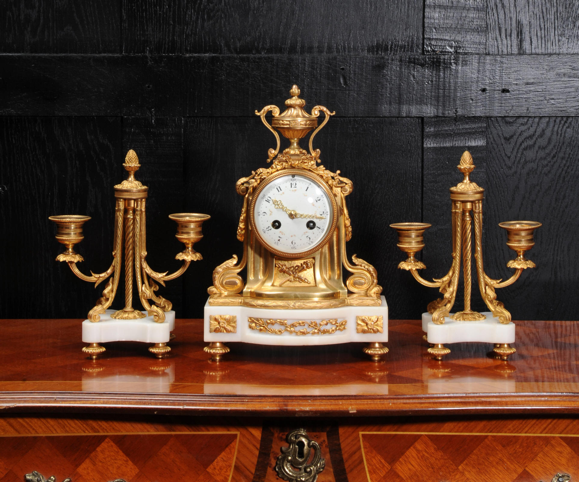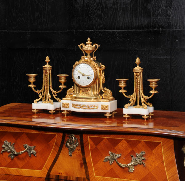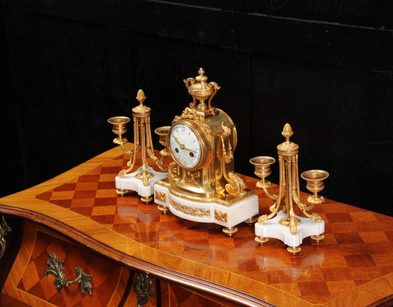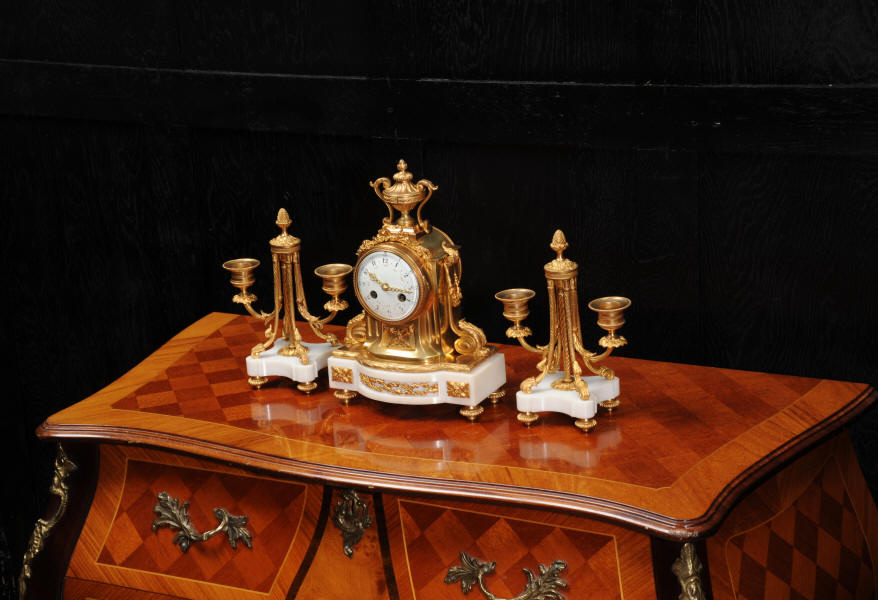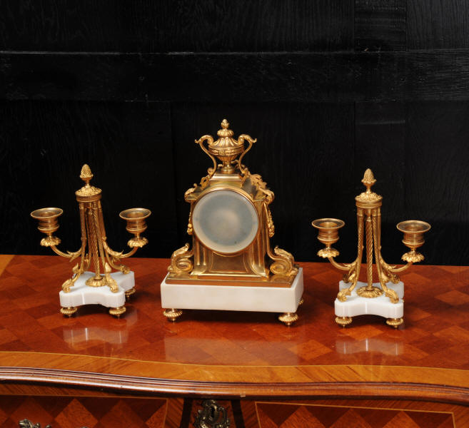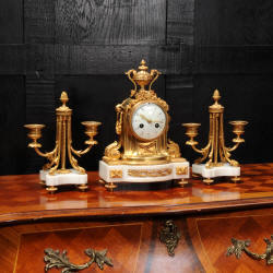 Candelabra are delicately modelled with acanthus supporting the two lights and a pineapple finial to the top. The dial is porcelain enamel with beautiful floral swags between the numbers and is complete with original finely fretted gilt hands and convex glass. The rear door is glazed with frosted glass and the clock set is modelled in the round for display from all angles. The French movement is of high quality and is by Samuel Marti. It is in excellent clean and running condition having been fully overhauled by our clockmaker. Pendulum is an old replacement. It runs for 8 days and strikes the hours and halves on a bell. Click the video clip below to hear the bell and watch the clock running. Condition of the case is excellent, the original gilding is beautifully clean and bright with some wear and discolouration. The dial is also in excellent condition just some slight chips to the winding holes. Marble has an excellent polish and just an occasional tiny nibble to the edges, one candelabra has a chip to the rear.