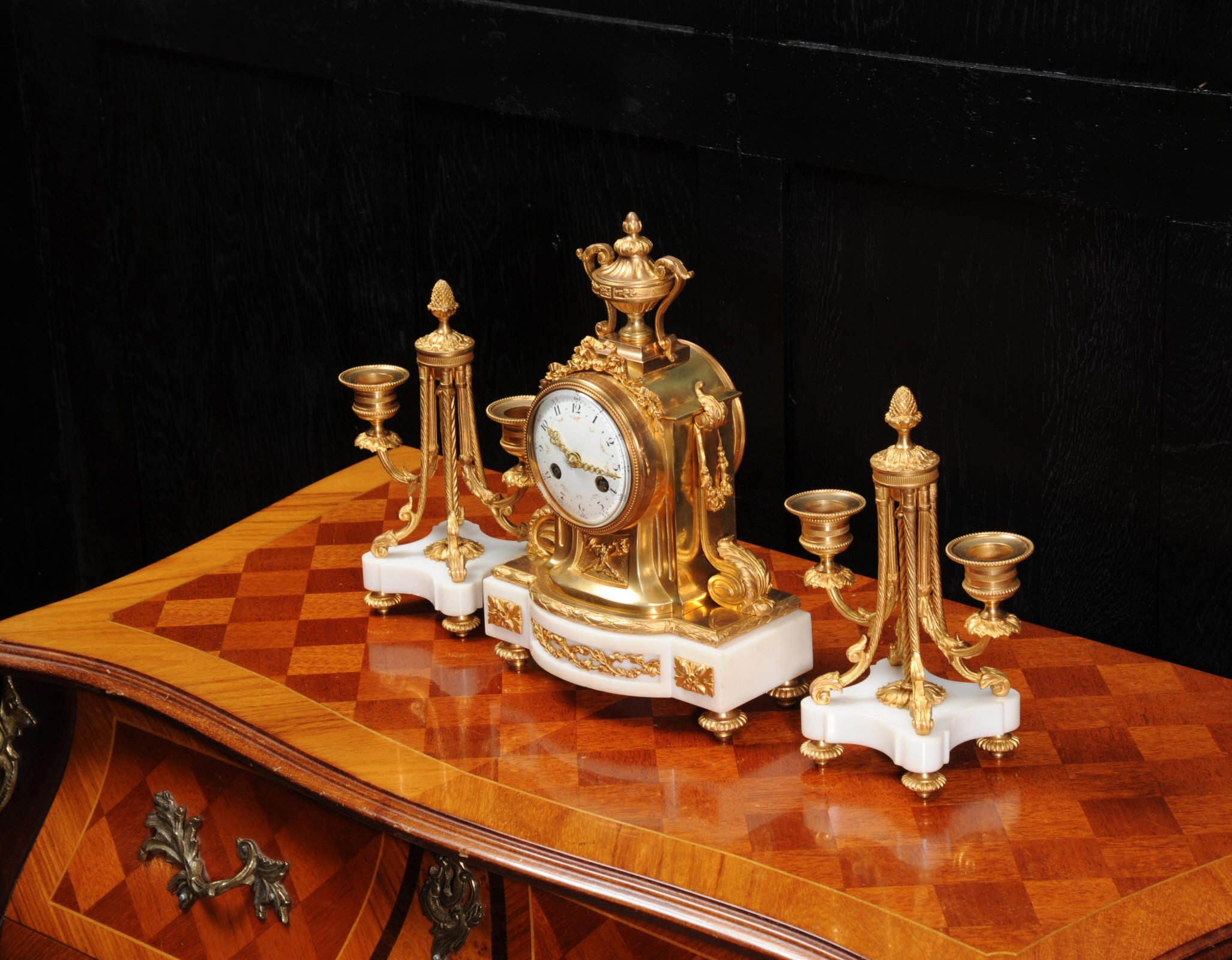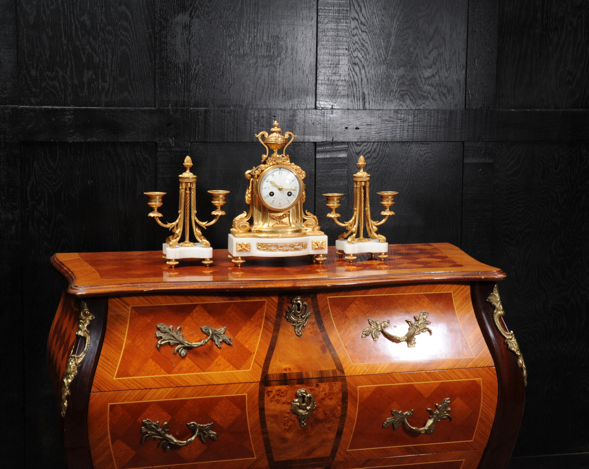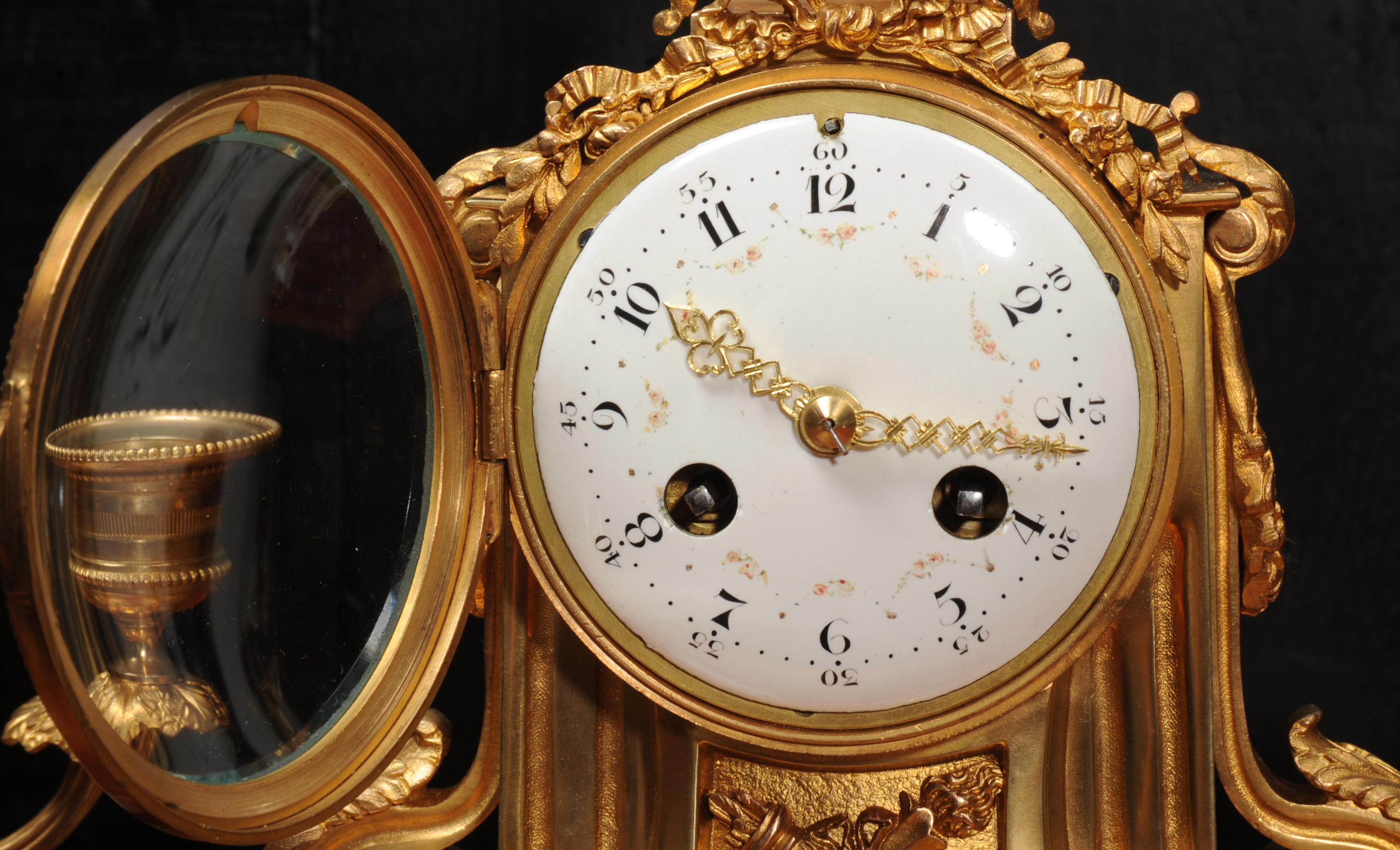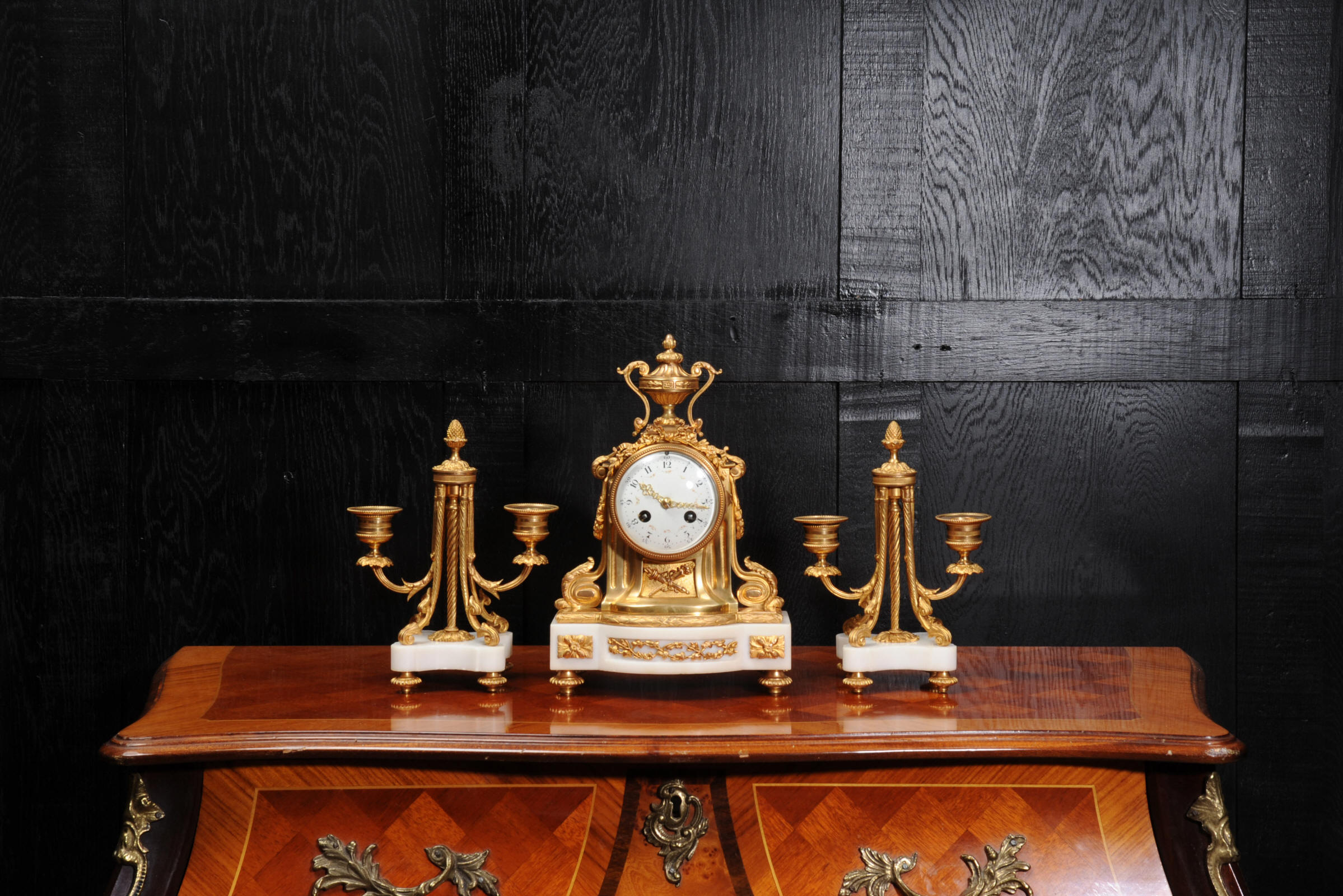 Candelabra are delicately modelled with acanthus supporting the two lights and a pineapple finial to the top. The dial is porcelain enamel with beautiful floral swags between the numbers and is complete with original finely fretted gilt hands and convex glass. The rear door is glazed with frosted glass and the clock set is modelled in the round for display from all angles. The French movement is of high quality and is by Samuel Marti. It is in excellent clean and running condition having been fully overhauled by our clockmaker. Pendulum is an old replacement. It runs for 8 days and strikes the hours and halves on a bell. Click the video clip below to hear the bell and watch the clock running. Condition of the case is excellent, the original gilding is beautifully clean and bright with some wear and discolouration. The dial is also in excellent condition just some slight chips to the winding holes. Marble has an excellent polish and just an occasional tiny nibble to the edges, one candelabra has a chip to the rear.