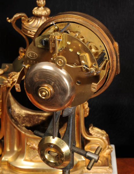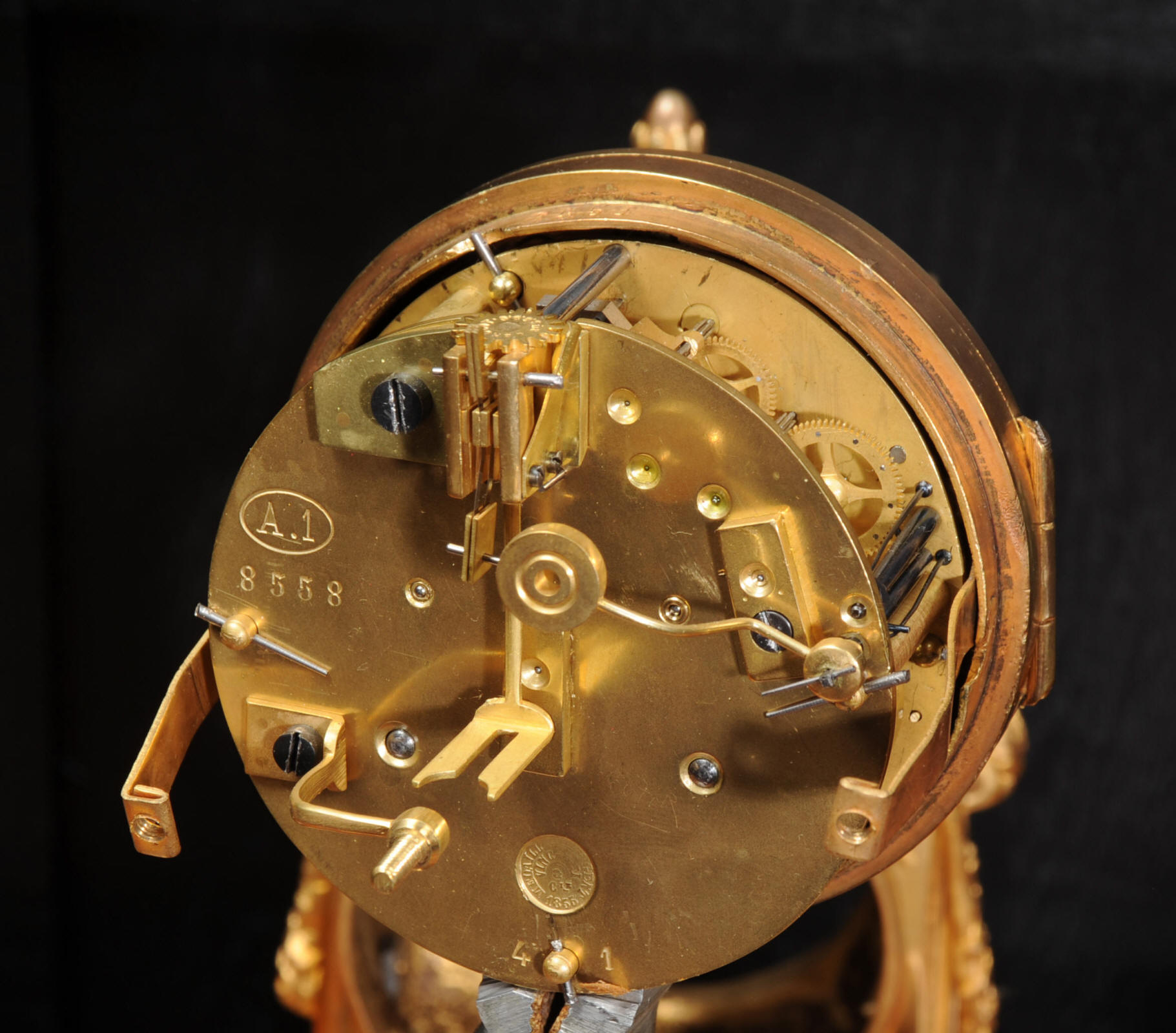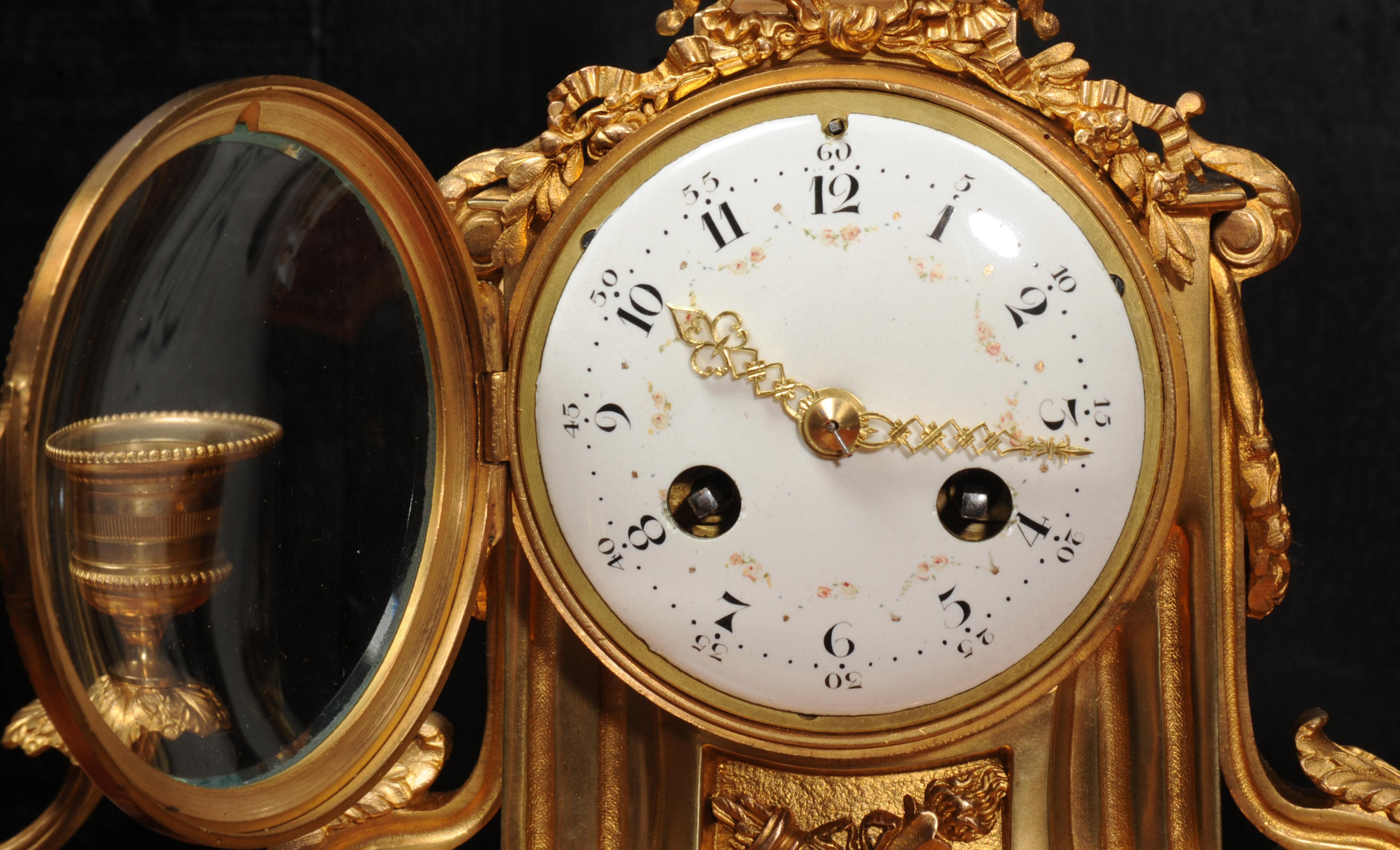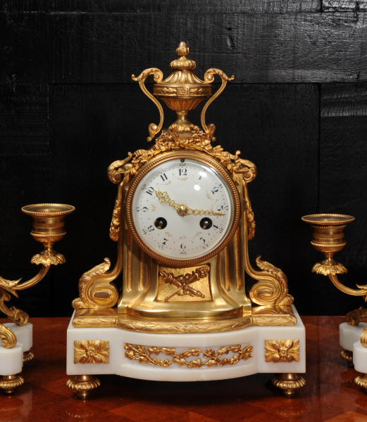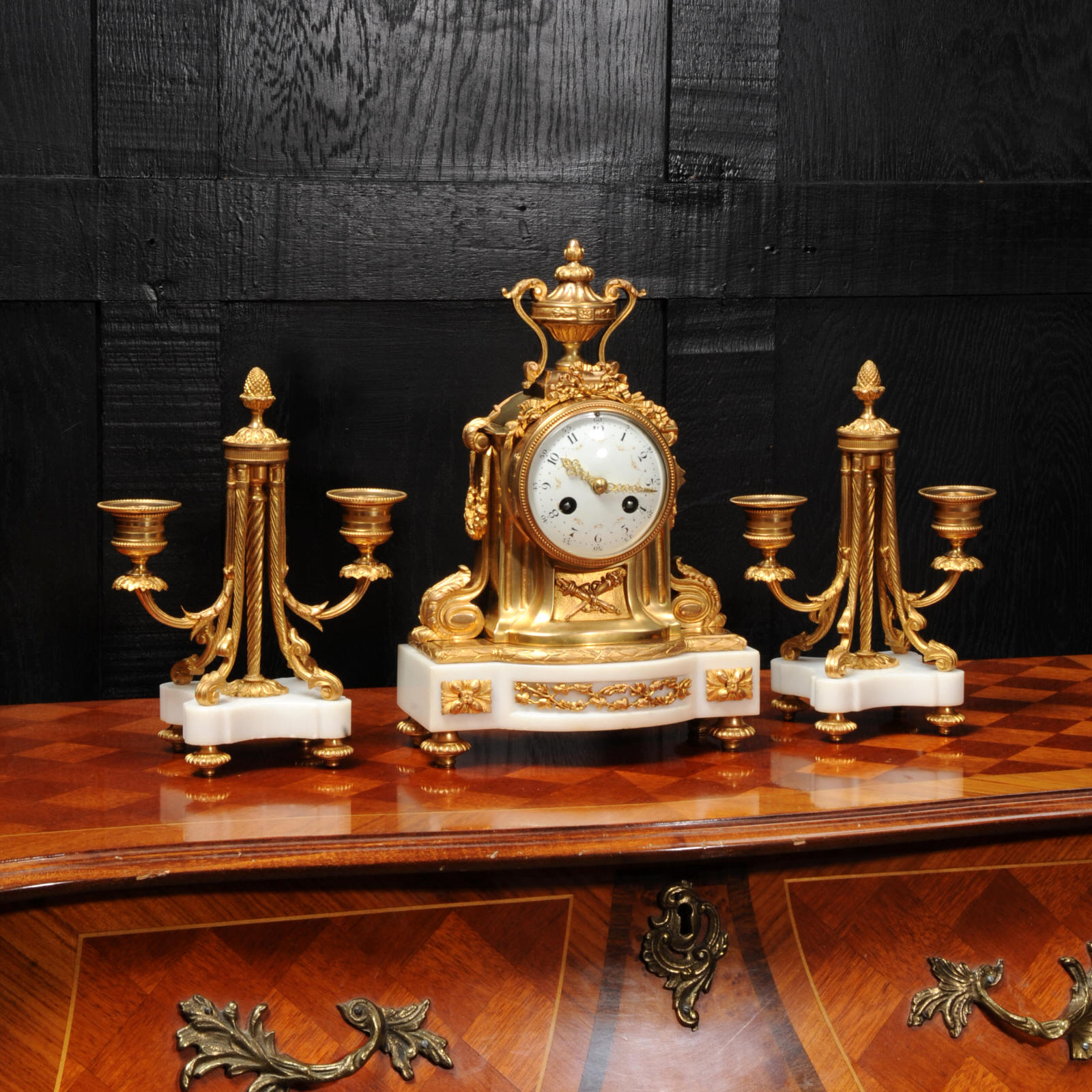 Candelabra are delicately modelled with acanthus supporting the two lights and a pineapple finial to the top. The dial is porcelain enamel with beautiful floral swags between the numbers and is complete with original finely fretted gilt hands and convex glass. The rear door is glazed with frosted glass and the clock set is modelled in the round for display from all angles. The French movement is of high quality and is by Samuel Marti. It is in excellent clean and running condition having been fully overhauled by our clockmaker. Pendulum is an old replacement. It runs for 8 days and strikes the hours and halves on a bell. Click the video clip below to hear the bell and watch the clock running. Condition of the case is excellent, the original gilding is beautifully clean and bright with some wear and discolouration. The dial is also in excellent condition just some slight chips to the winding holes. Marble has an excellent polish and just an occasional tiny nibble to the edges, one candelabra has a chip to the rear.