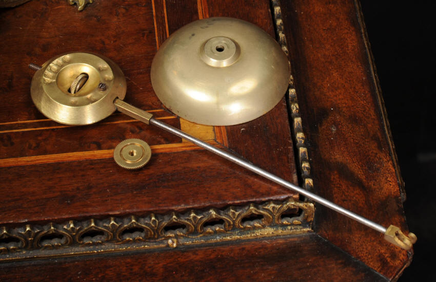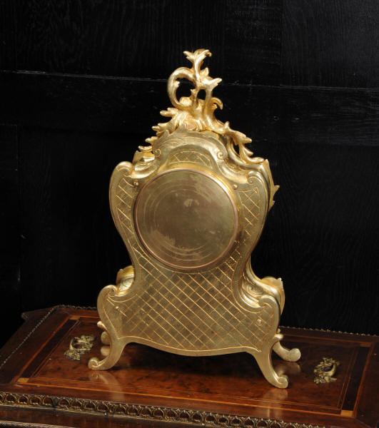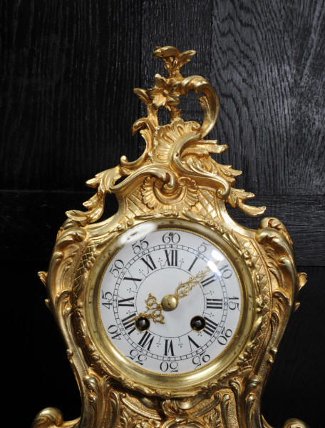 The large dial is porcelain enamel on copper with separate minute ring. It is complete with it's original finely fretted hands and Rococo bezel with convex glass. The French movement is of high quality and is in excellent clean and running condition having been fully overhauled by our clockmaker. The movement has the superior pin-pallet escapement. Pendulum is an old replacement. It runs for 8 days and strikes the hours and halves on a bell. Click the video clip below to hear the bell and watch the clock running!