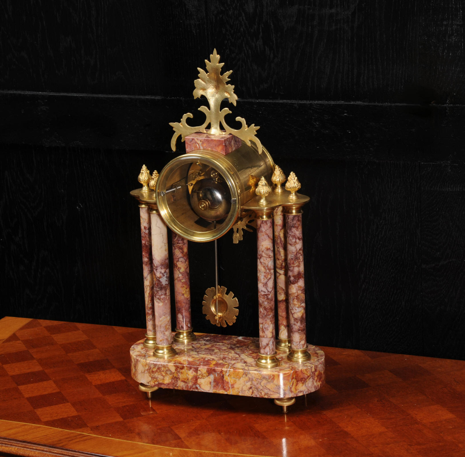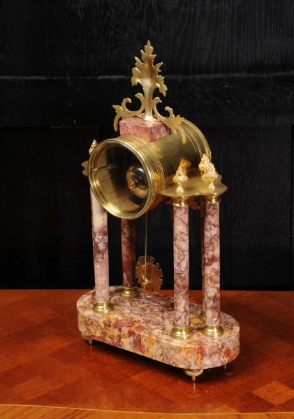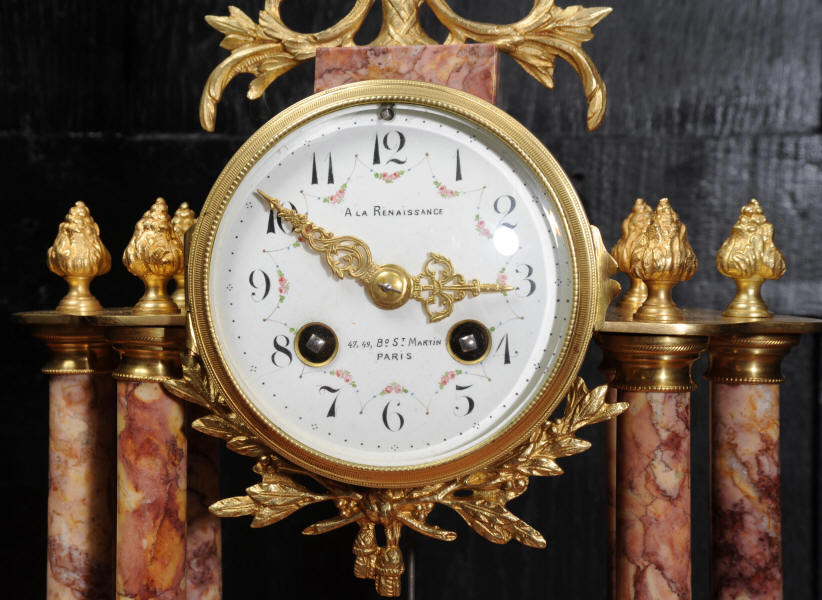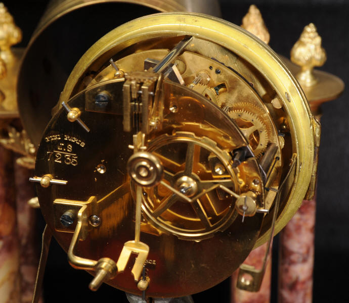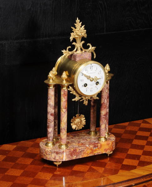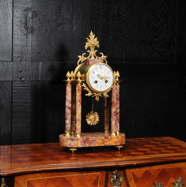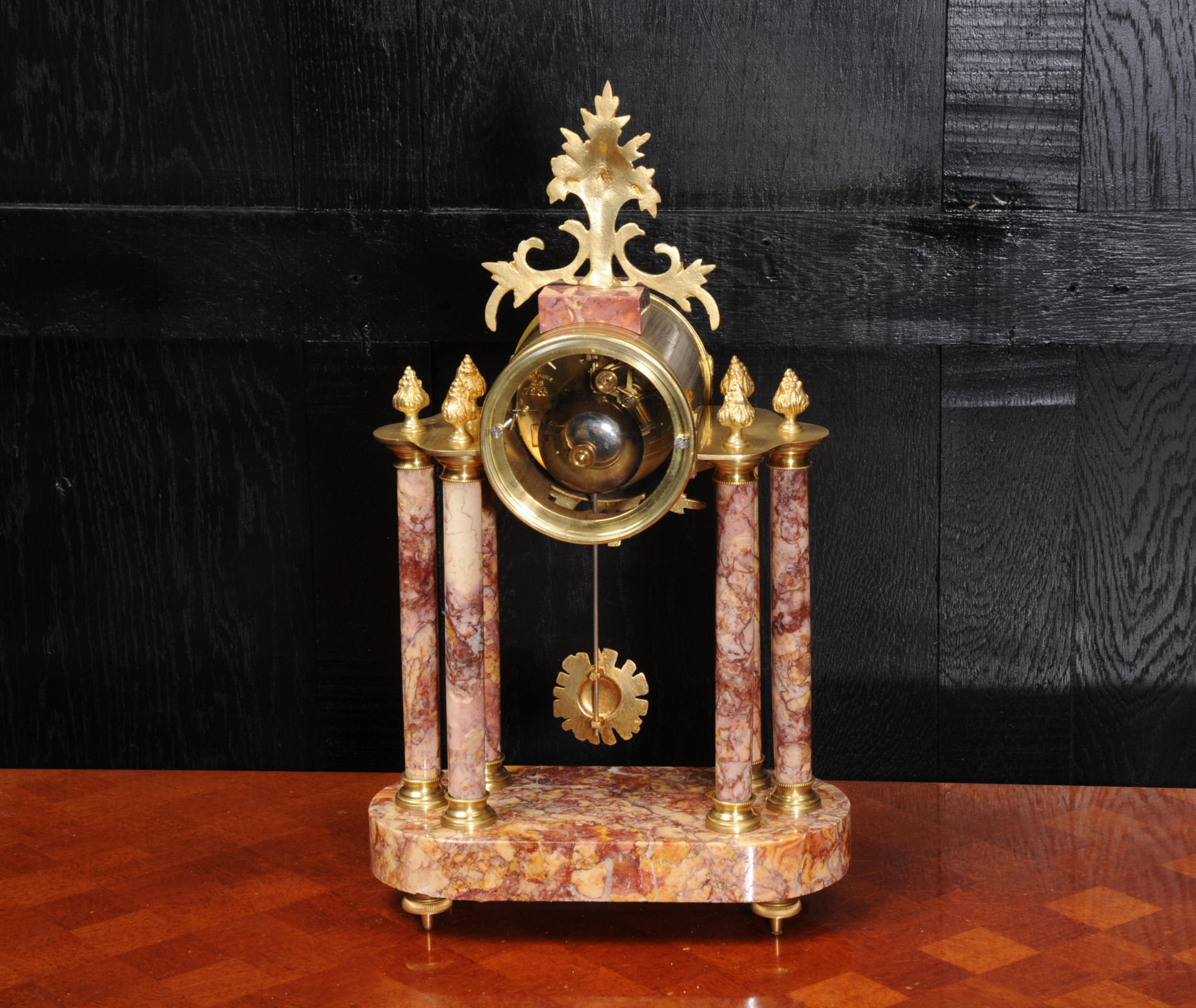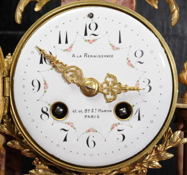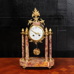 The dial is porcelain enamel on copper, exquisitely decorated with floral swags delicately painted between the numbers of the dial. Hands are gilded, fretted brass. The rear door is glazed to allow the pendulum to be seen. The French movement is of high quality and is in excellent clean and running condition having been fully overhauled by our clockmaker. Pendulum is a replacement. It runs for 8 days and strikes the hours and halves on a bell. Click the video clip below to hear the bell and watch the clock running! Condition of the case is excellent, marble has a very good polish with no major chips or scratches, just the usual tiny nibbles to the edges. Ormolu is also in very good condition with a bright and clean finish with some slight tarnish/discolouration. Dial is in very good condition with no chips or scratches just some minor hairlines.