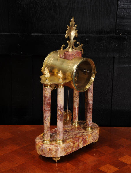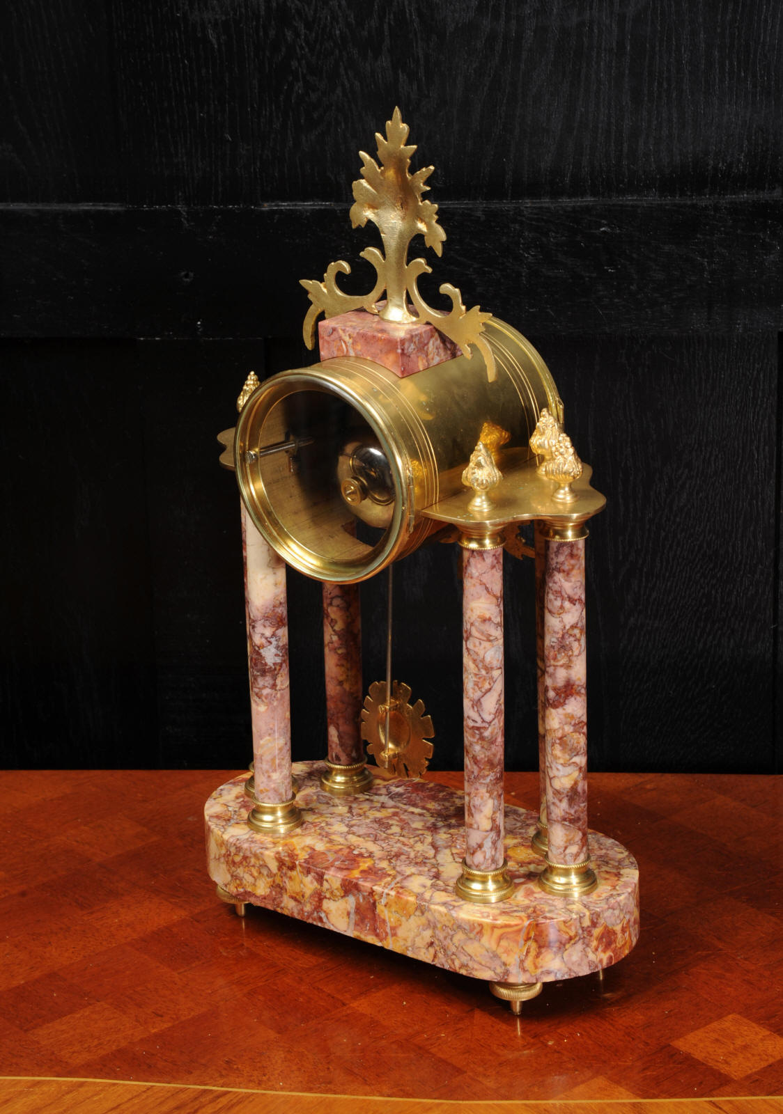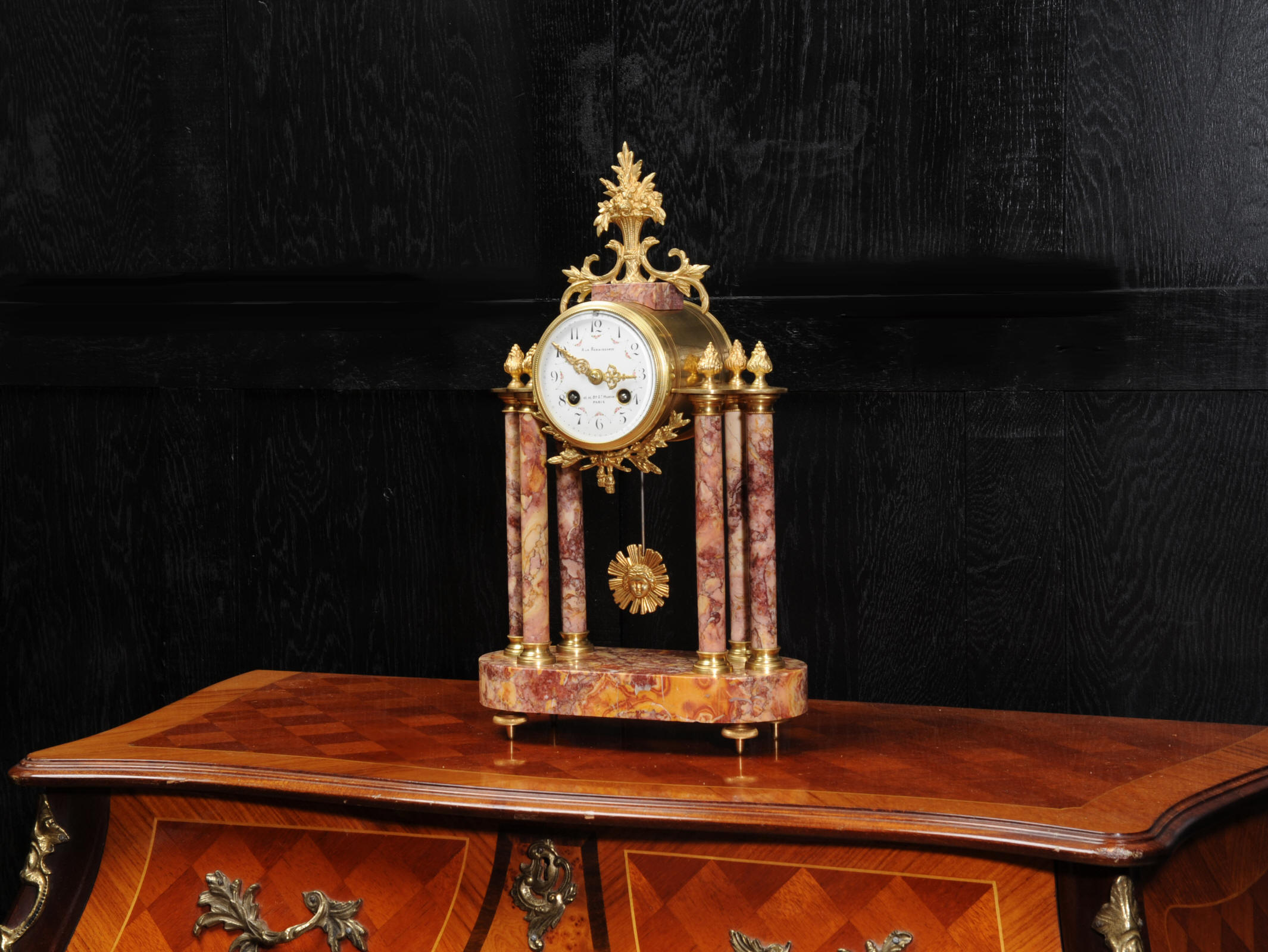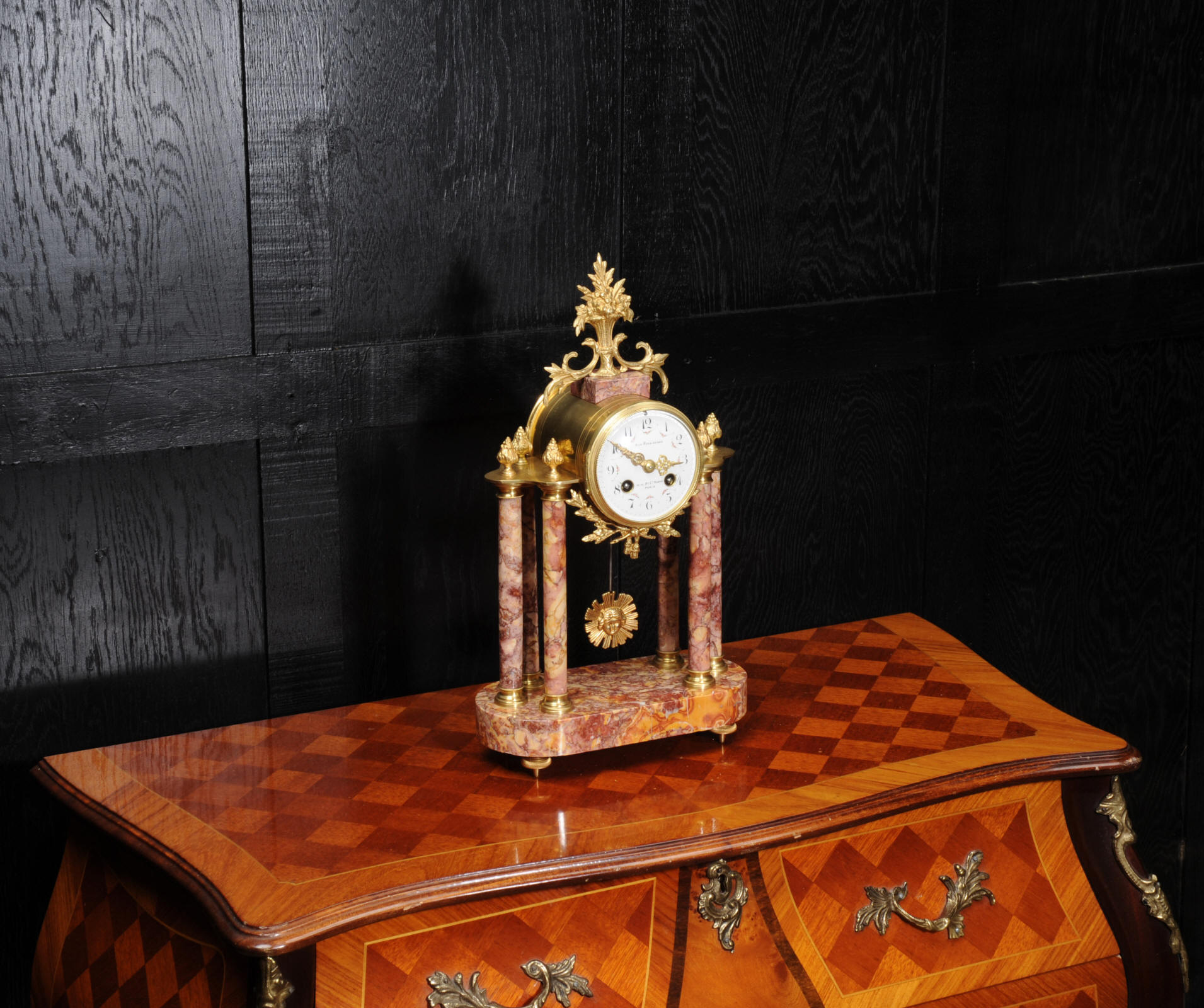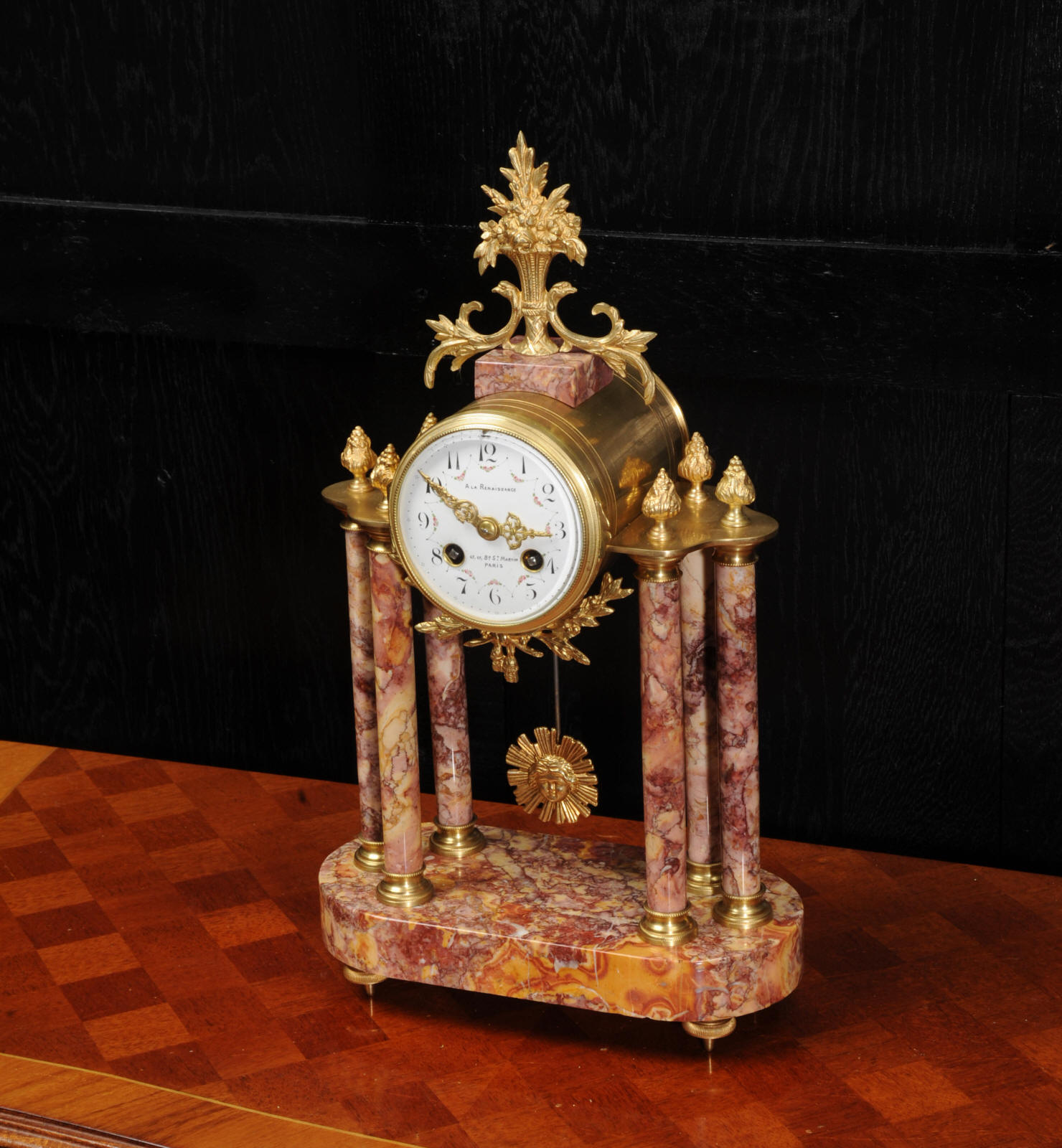 The dial is porcelain enamel on copper, exquisitely decorated with floral swags delicately painted between the numbers of the dial. Hands are gilded, fretted brass. The rear door is glazed to allow the pendulum to be seen. The French movement is of high quality and is in excellent clean and running condition having been fully overhauled by our clockmaker. Pendulum is a replacement. It runs for 8 days and strikes the hours and halves on a bell. Click the video clip below to hear the bell and watch the clock running! Condition of the case is excellent, marble has a very good polish with no major chips or scratches, just the usual tiny nibbles to the edges. Ormolu is also in very good condition with a bright and clean finish with some slight tarnish/discolouration. Dial is in very good condition with no chips or scratches just some minor hairlines.