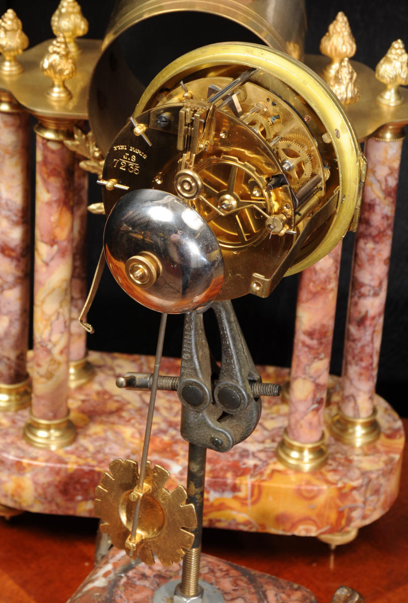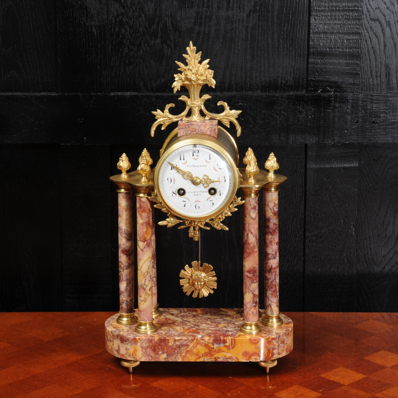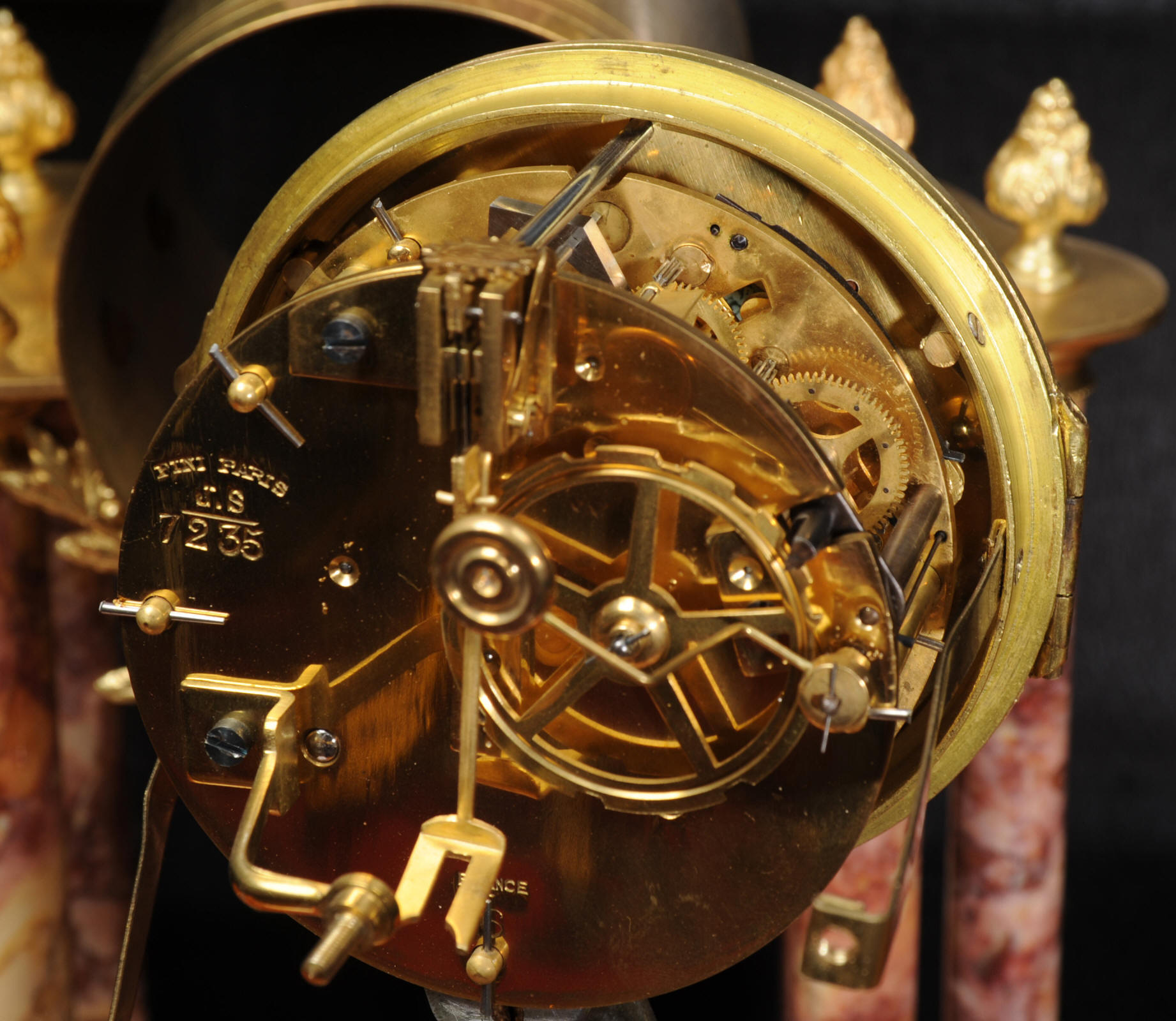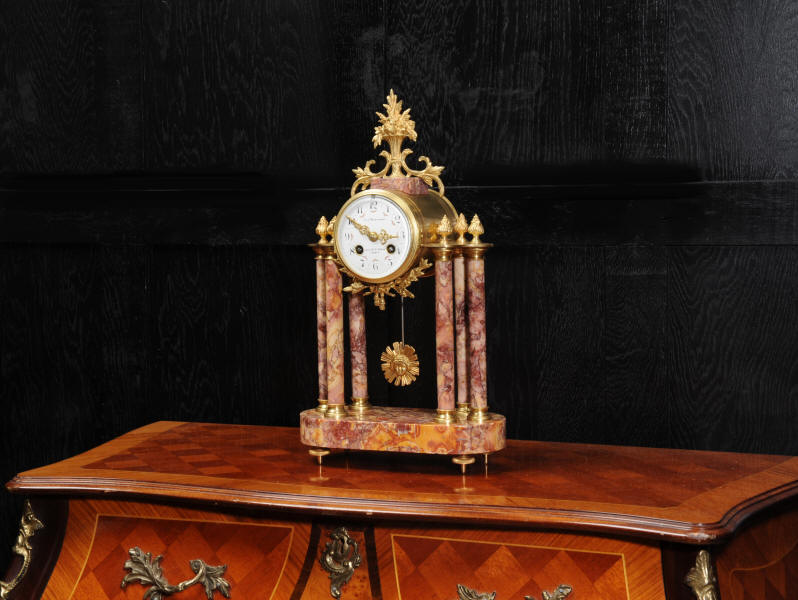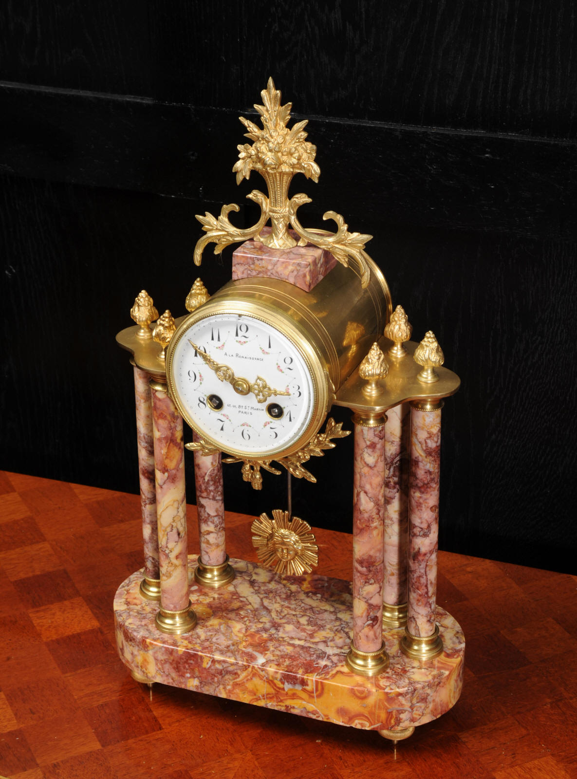 The dial is porcelain enamel on copper, exquisitely decorated with floral swags delicately painted between the numbers of the dial. Hands are gilded, fretted brass. The rear door is glazed to allow the pendulum to be seen. The French movement is of high quality and is in excellent clean and running condition having been fully overhauled by our clockmaker. Pendulum is a replacement. It runs for 8 days and strikes the hours and halves on a bell. Click the video clip below to hear the bell and watch the clock running! Condition of the case is excellent, marble has a very good polish with no major chips or scratches, just the usual tiny nibbles to the edges. Ormolu is also in very good condition with a bright and clean finish with some slight tarnish/discolouration. Dial is in very good condition with no chips or scratches just some minor hairlines.