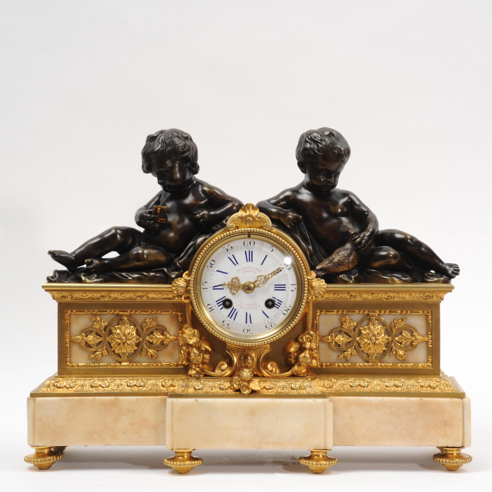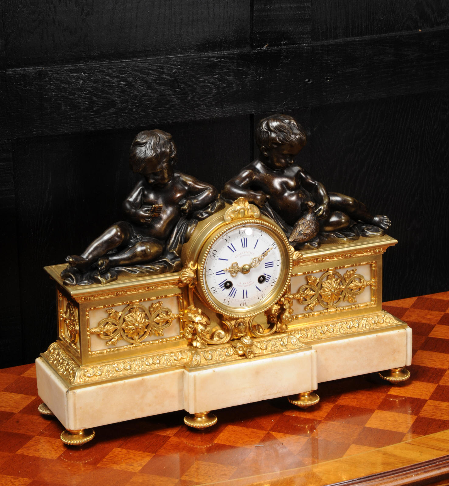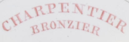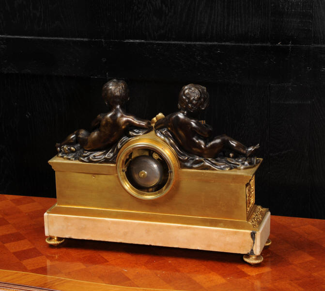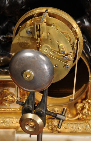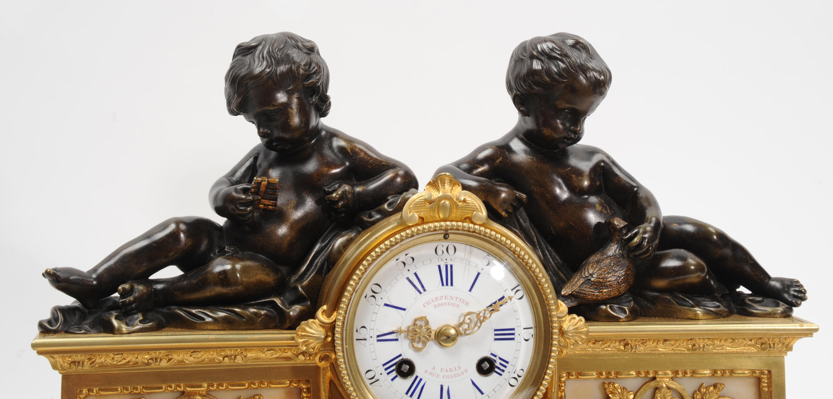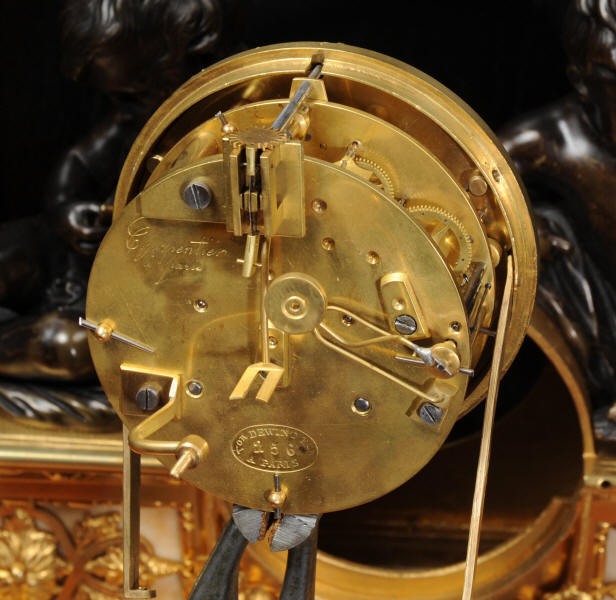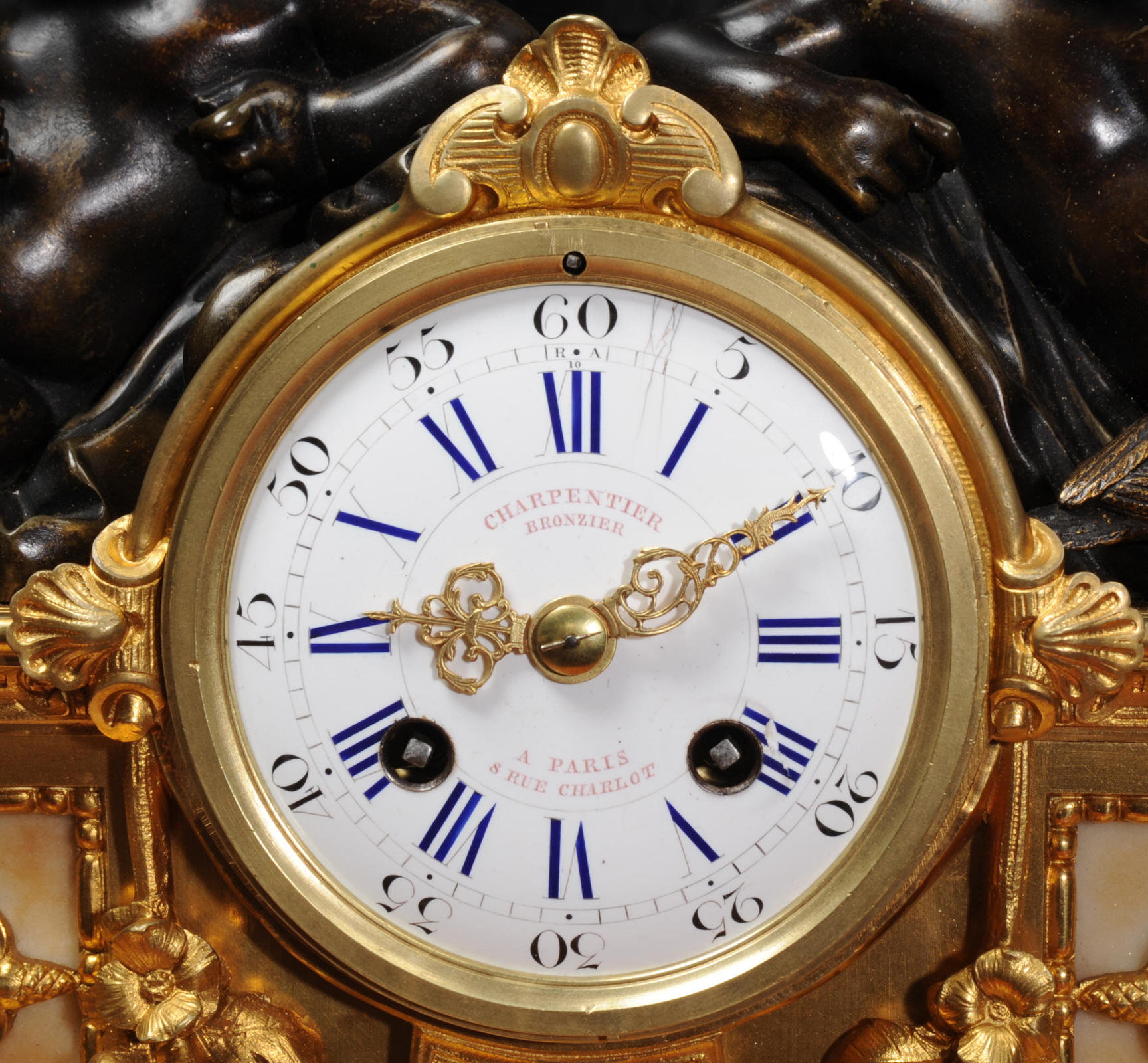 The dial is porcelain enamel on copper, lettered in blue and black and signed for Charpentier in red. The bezel is the early type with bayonet fitting rather then a hinge. The rear door is glazed to allow the pendulum to be seen. The French movement is of high quality and is by Victor Dewint. It is the early version of the Pendule de Paris movement with outside hammer spring. It is in excellent clean and running condition having been fully overhauled by our clockmaker. Pendulum is a replacement. It runs for 8 days and strikes the hours and halves on a bell. Click the video clip below to hear the bell and watch the clock running. Condition of the case is excellent, the original gilding is beautifully clean and bright some wear to the gilding on the high spots. One rear foot has been replaced with a cast copy. The bronze has a lovely antique patination with some discolouration and wear. The dial is also in very good condition with some hairlining and a chip near the right hand winding hole. The marble has a good polish with staining and discolouration to a mellow antique off-white colour. There are some small chips to the edges. There is a repair to the left hand side visible at the rear. Bronze founder Charpentier & Cie is listed in Tardy Dictionnaire Des Horologers. Charpentier began making bronze mounts in Paris (rue d'Orléans au Marais) in 1834. He exhibited at the Exposition Nationale des Produits de l'agriculture et de l'industrie of 1849, where he was awarded a silver medal and later at the Paris International Exhibition of 1855 where he won a Médaille de première classe for his bronze casts of sculptures by Fratin, Buhaut and Moreau. At the London 1862 International Exhibtion he again received a First Classe Medal for a magnificent pair of torchères, also in the Neo-Gréc taste, after models by A.E. Carrier-Belleuse. Charpentier & Cie was located at 8, Rue Charlot, Paris in 1860, and was later known as Lemerle-Charpentier & Cie, circa 1870 to 1890. Clockmaker Victor Dewint is listed in Tardy as working in Rue Vieille-du-Temple in 1850, although I feel that this particular clock is earlier then 1850 due to the outside hammer spring, the early style of signing the movement by Charpentier (later movements were stamped) and the early style bayonet fit bezel. The date listed by Tardy is a "know to be working" date rather than a start date and therefore I think a date of 1840 is appropriate. It can not be much earlier then this as Charpentier was working from Rue D'Orleans in 1834.