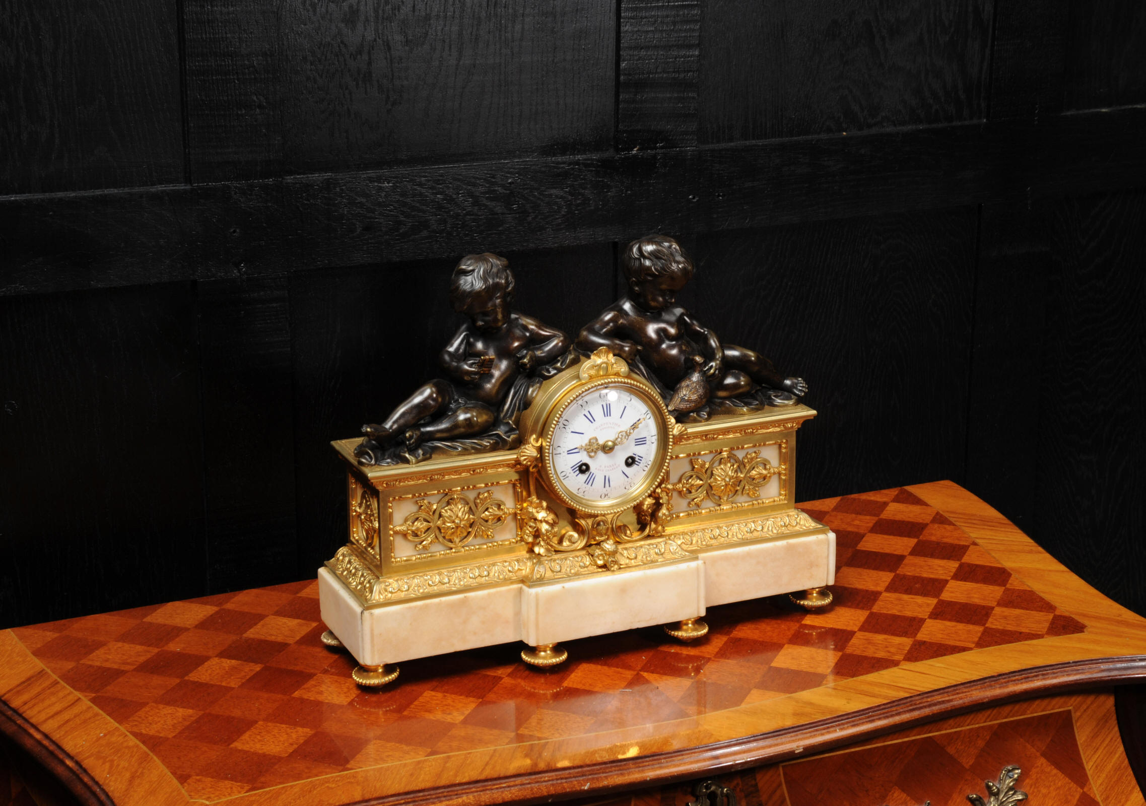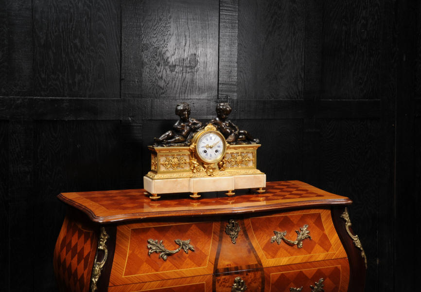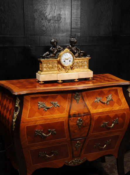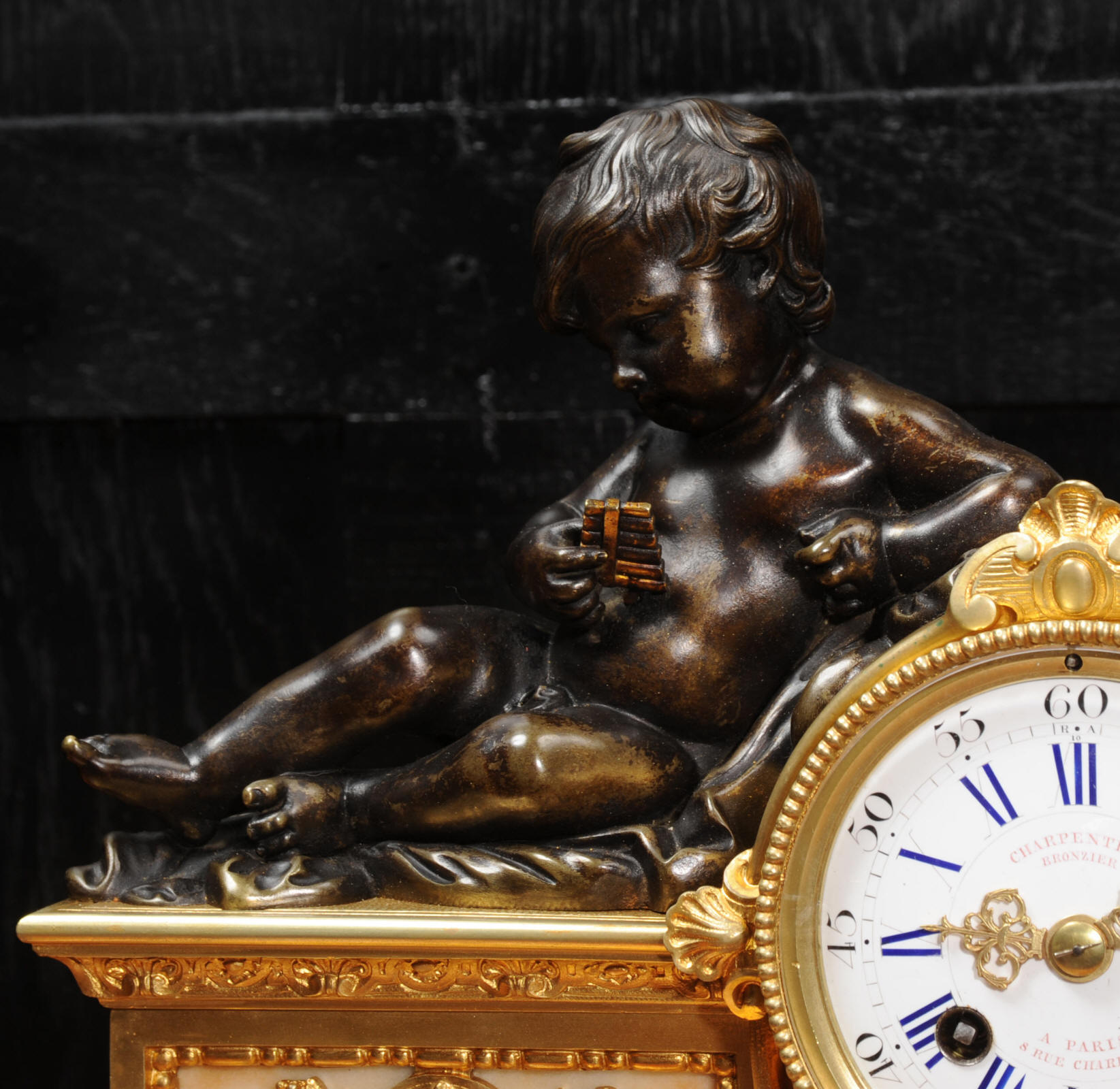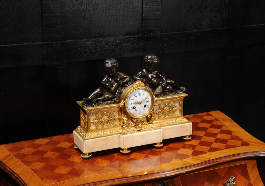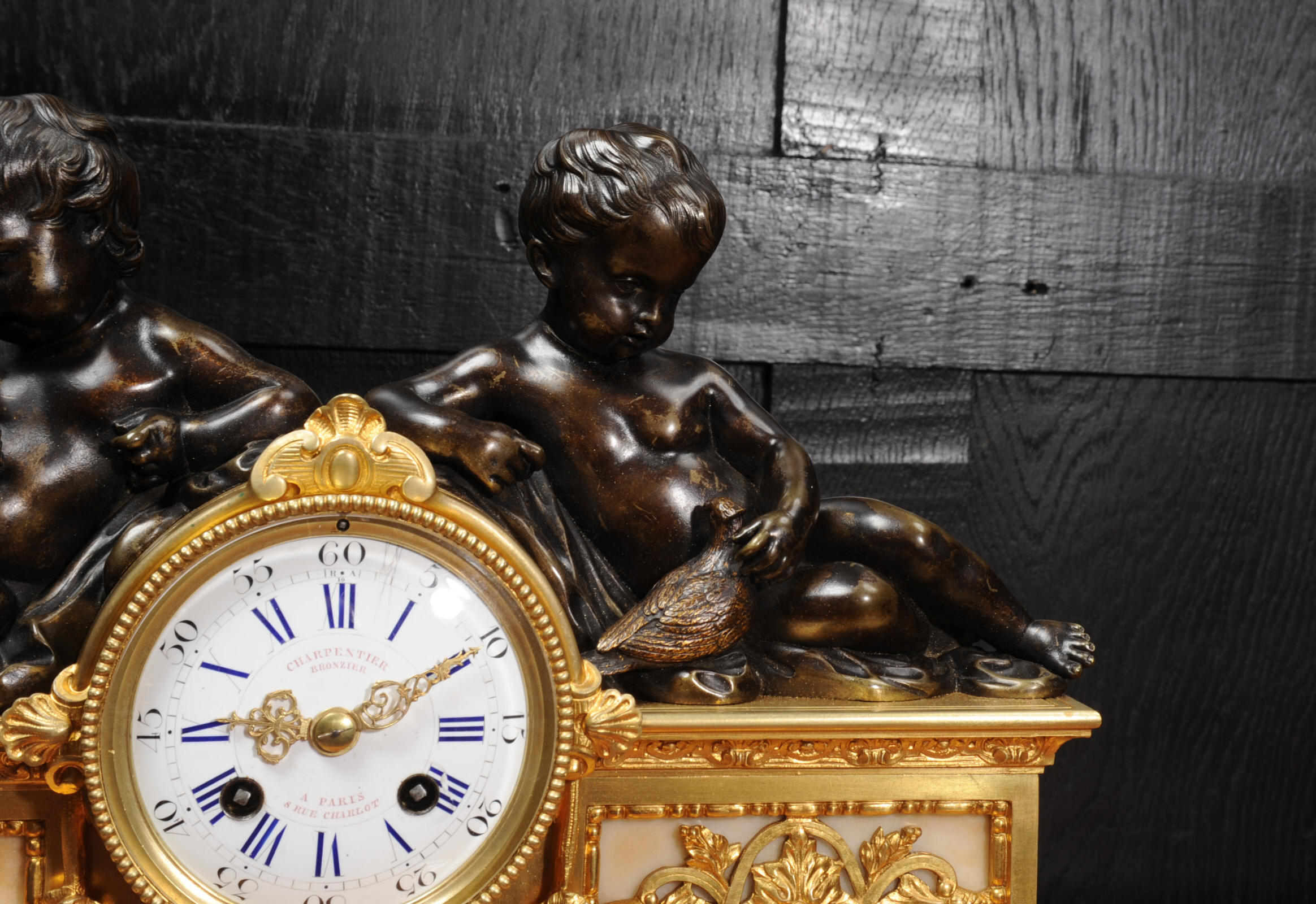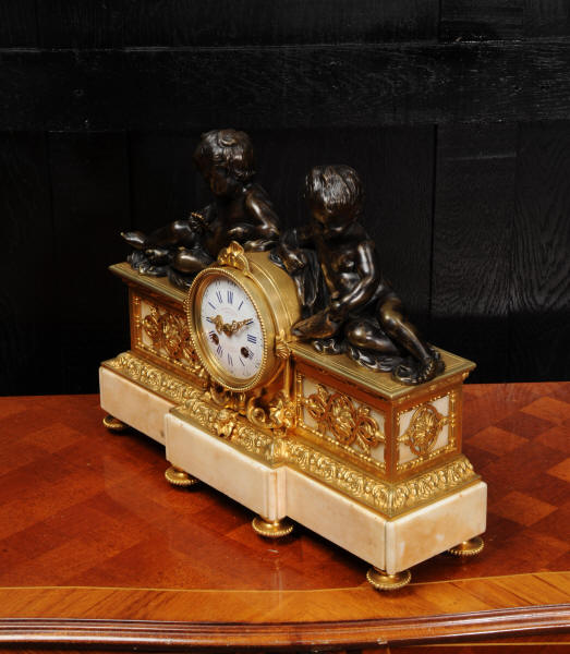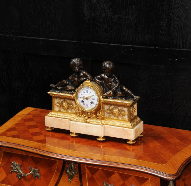 The dial is porcelain enamel on copper, lettered in blue and black and signed for Charpentier in red. The bezel is the early type with bayonet fitting rather then a hinge. The rear door is glazed to allow the pendulum to be seen. The French movement is of high quality and is by Victor Dewint. It is the early version of the Pendule de Paris movement with outside hammer spring. It is in excellent clean and running condition having been fully overhauled by our clockmaker. Pendulum is a replacement. It runs for 8 days and strikes the hours and halves on a bell. Click the video clip below to hear the bell and watch the clock running. Condition of the case is excellent, the original gilding is beautifully clean and bright some wear to the gilding on the high spots. One rear foot has been replaced with a cast copy. The bronze has a lovely antique patination with some discolouration and wear. The dial is also in very good condition with some hairlining and a chip near the right hand winding hole. The marble has a good polish with staining and discolouration to a mellow antique off-white colour. There are some small chips to the edges. There is a repair to the left hand side visible at the rear. Bronze founder Charpentier & Cie is listed in Tardy Dictionnaire Des Horologers. Charpentier began making bronze mounts in Paris (rue d'Orléans au Marais) in 1834. He exhibited at the Exposition Nationale des Produits de l'agriculture et de l'industrie of 1849, where he was awarded a silver medal and later at the Paris International Exhibition of 1855 where he won a Médaille de première classe for his bronze casts of sculptures by Fratin, Buhaut and Moreau. At the London 1862 International Exhibtion he again received a First Classe Medal for a magnificent pair of torchères, also in the Neo-Gréc taste, after models by A.E. Carrier-Belleuse. Charpentier & Cie was located at 8, Rue Charlot, Paris in 1860, and was later known as Lemerle-Charpentier & Cie, circa 1870 to 1890. Clockmaker Victor Dewint is listed in Tardy as working in Rue Vieille-du-Temple in 1850, although I feel that this particular clock is earlier then 1850 due to the outside hammer spring, the early style of signing the movement by Charpentier (later movements were stamped) and the early style bayonet fit bezel. The date listed by Tardy is a "know to be working" date rather than a start date and therefore I think a date of 1840 is appropriate. It can not be much earlier then this as Charpentier was working from Rue D'Orleans in 1834.
