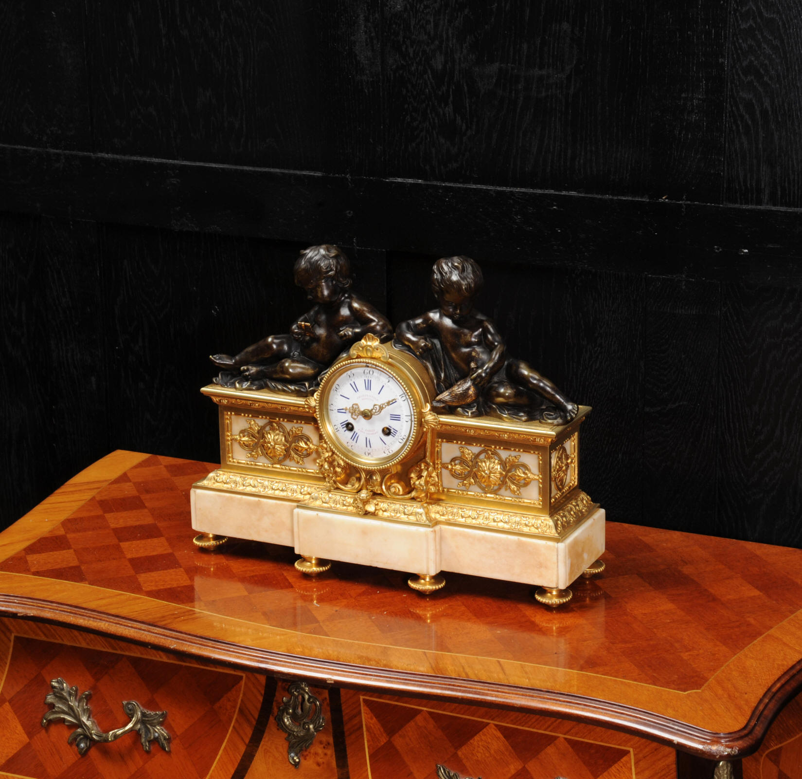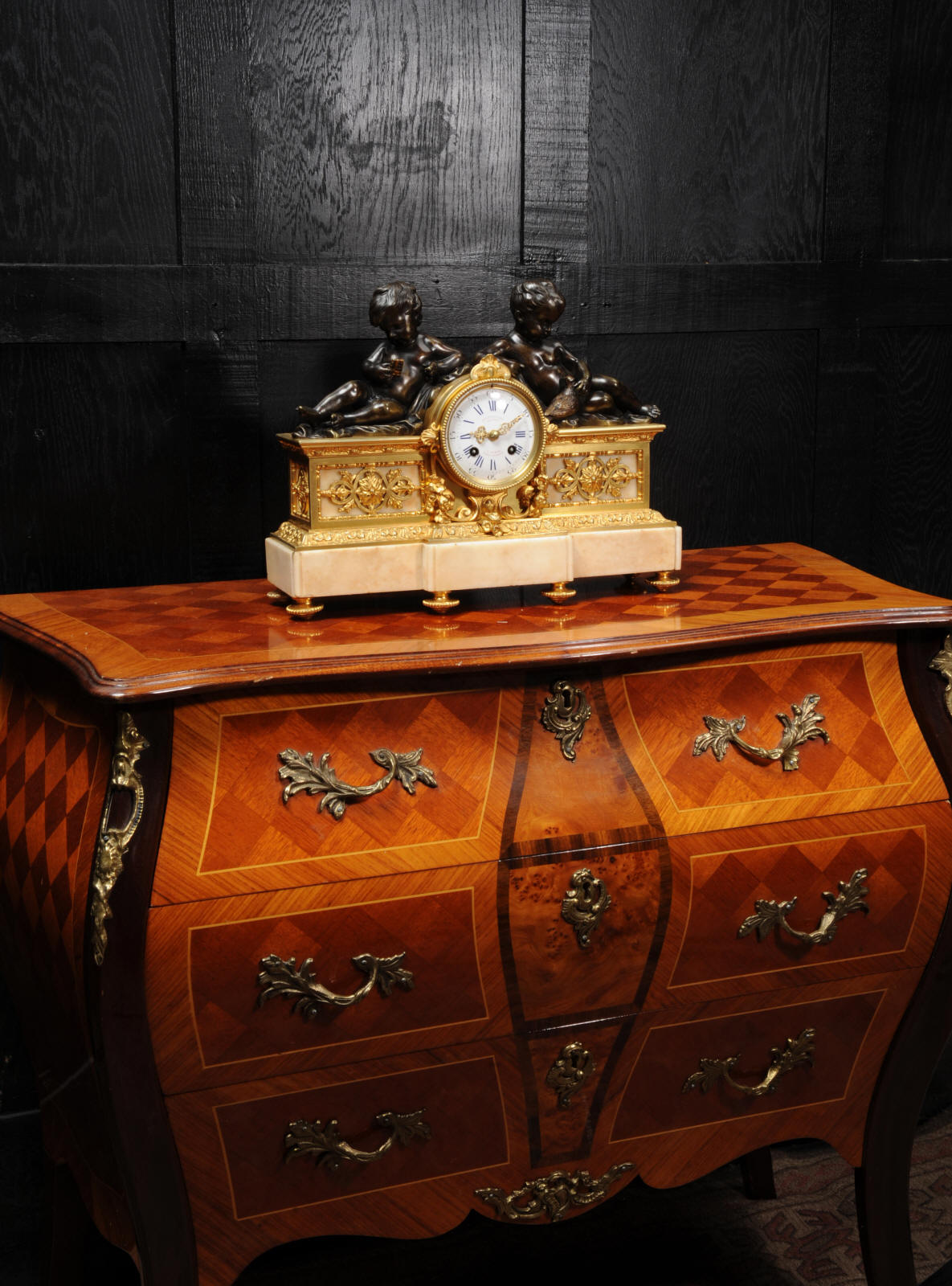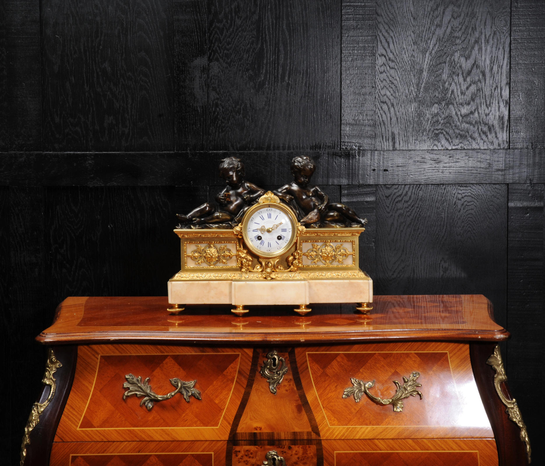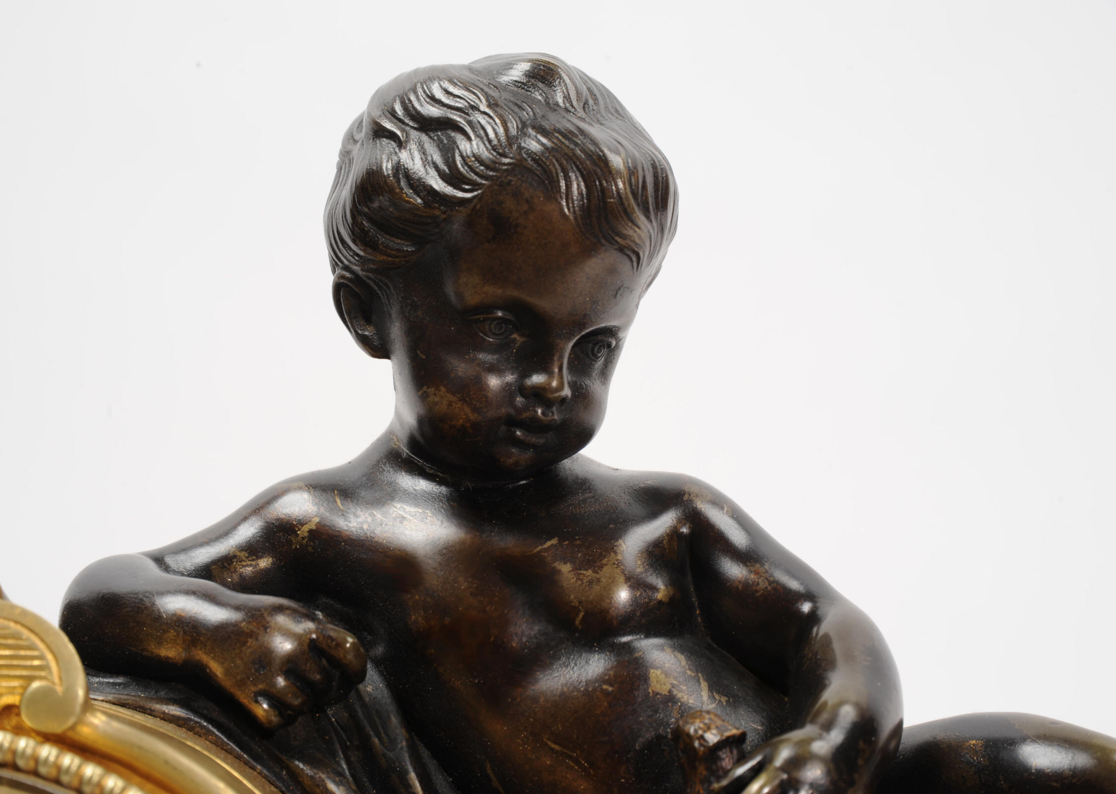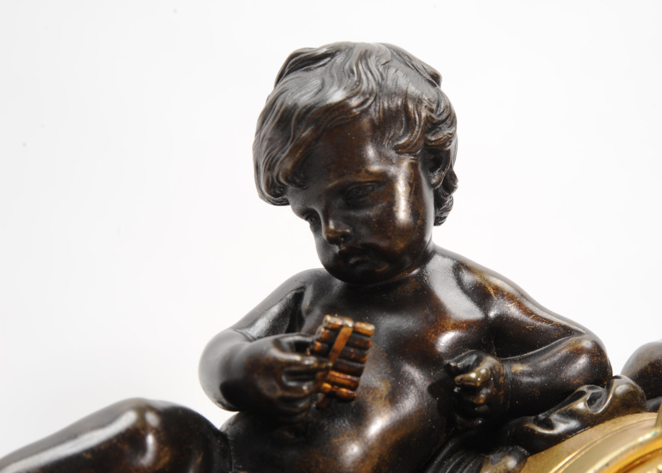 The dial is porcelain enamel on copper, lettered in blue and black and signed for Charpentier in red. The bezel is the early type with bayonet fitting rather then a hinge. The rear door is glazed to allow the pendulum to be seen. The French movement is of high quality and is by Victor Dewint. It is the early version of the Pendule de Paris movement with outside hammer spring. It is in excellent clean and running condition having been fully overhauled by our clockmaker. Pendulum is a replacement. It runs for 8 days and strikes the hours and halves on a bell. Click the video clip below to hear the bell and watch the clock running. Condition of the case is excellent, the original gilding is beautifully clean and bright some wear to the gilding on the high spots. One rear foot has been replaced with a cast copy. The bronze has a lovely antique patination with some discolouration and wear. The dial is also in very good condition with some hairlining and a chip near the right hand winding hole. The marble has a good polish with staining and discolouration to a mellow antique off-white colour. There are some small chips to the edges. There is a repair to the left hand side visible at the rear. Bronze founder Charpentier & Cie is listed in Tardy Dictionnaire Des Horologers. Charpentier began making bronze mounts in Paris (rue d'Orléans au Marais) in 1834. He exhibited at the Exposition Nationale des Produits de l'agriculture et de l'industrie of 1849, where he was awarded a silver medal and later at the Paris International Exhibition of 1855 where he won a Médaille de première classe for his bronze casts of sculptures by Fratin, Buhaut and Moreau. At the London 1862 International Exhibtion he again received a First Classe Medal for a magnificent pair of torchères, also in the Neo-Gréc taste, after models by A.E. Carrier-Belleuse. Charpentier & Cie was located at 8, Rue Charlot, Paris in 1860, and was later known as Lemerle-Charpentier & Cie, circa 1870 to 1890. Clockmaker Victor Dewint is listed in Tardy as working in Rue Vieille-du-Temple in 1850, although I feel that this particular clock is earlier then 1850 due to the outside hammer spring, the early style of signing the movement by Charpentier (later movements were stamped) and the early style bayonet fit bezel. The date listed by Tardy is a "know to be working" date rather than a start date and therefore I think a date of 1840 is appropriate. It can not be much earlier then this as Charpentier was working from Rue D'Orleans in 1834.