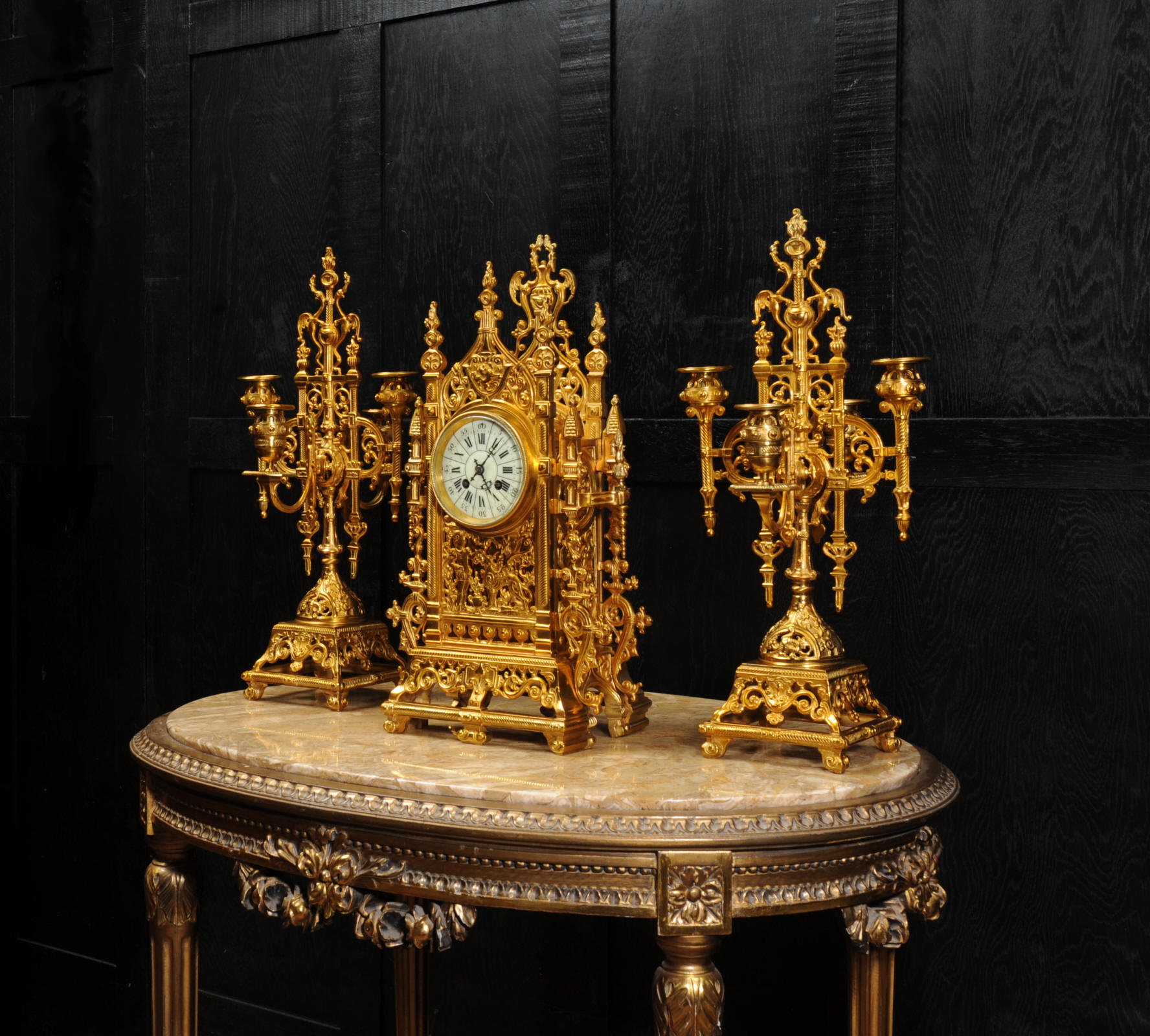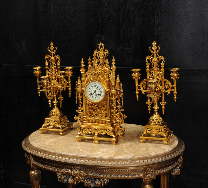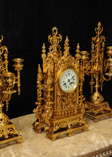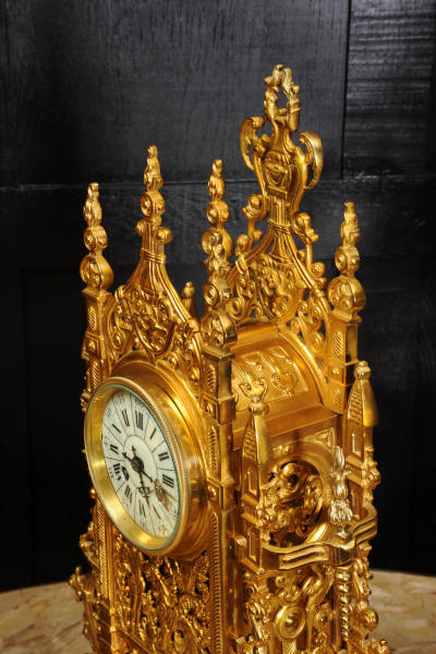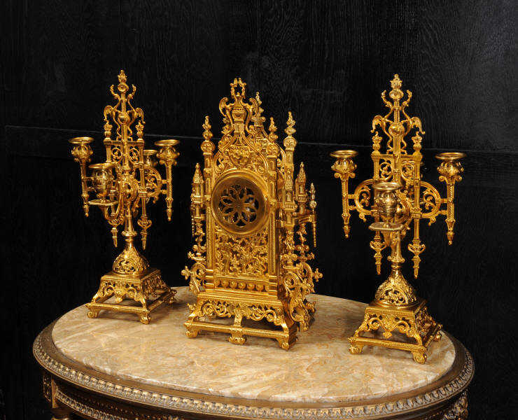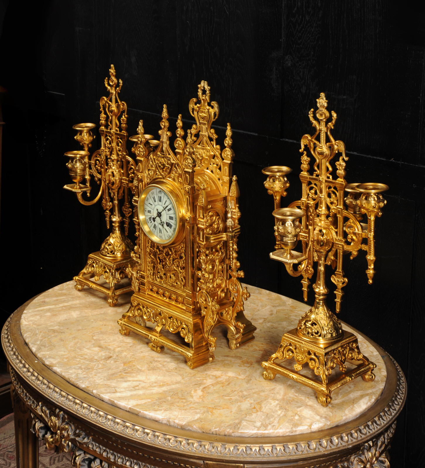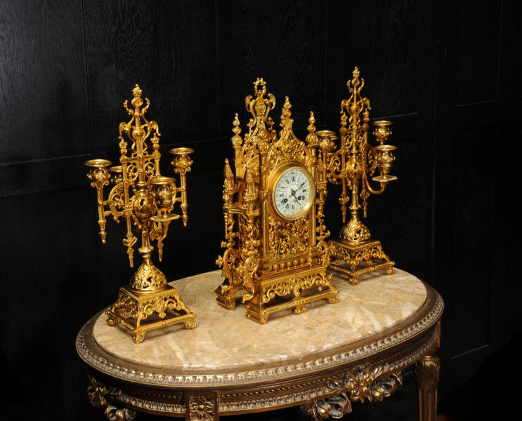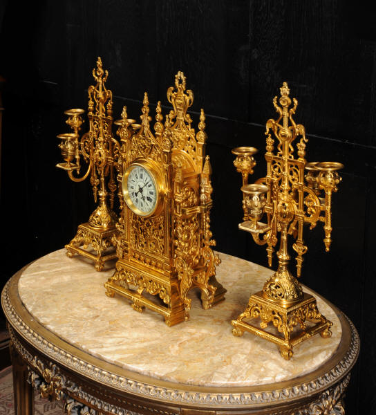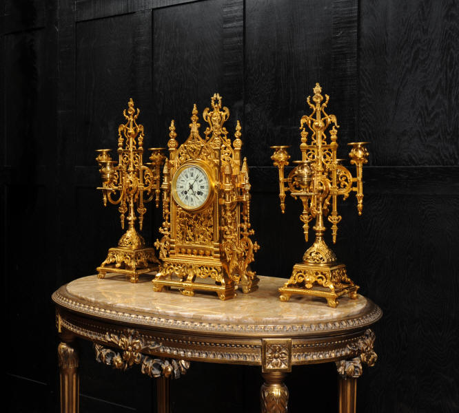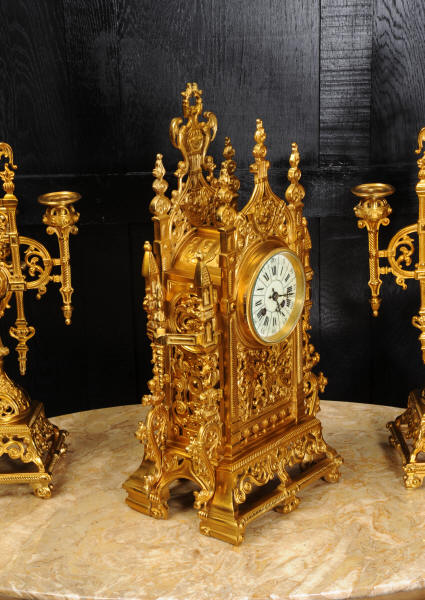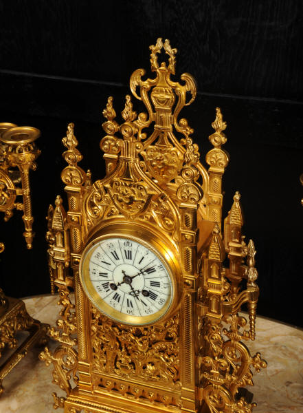 The dial is cream porcelain enamel on copper and is slightly sculptured. The bezel has a lovely rope design. It is complete with it's original blued steel hands. The French movement is of high quality and has the 'Japy Freres Grande Medaille D'Honneur' mark on the movement backplate. It is in excellent running condition and has been fully tested by our clockmaker. Pendulum is an old replacement. It runs for 8 days on one wind and strikes the hours and halves on a bell. Click the video clip below to hear the bell and watch the clock running. Condition of the case is excellent with a clean and bright finish protected by lacquer. There is some very minor wear and tarnish. The dial has some very slight nibbles around the winding holes. Candelabra arms are slightly distorted. A lovely and unusual Gothic clock set to add to your collection.
