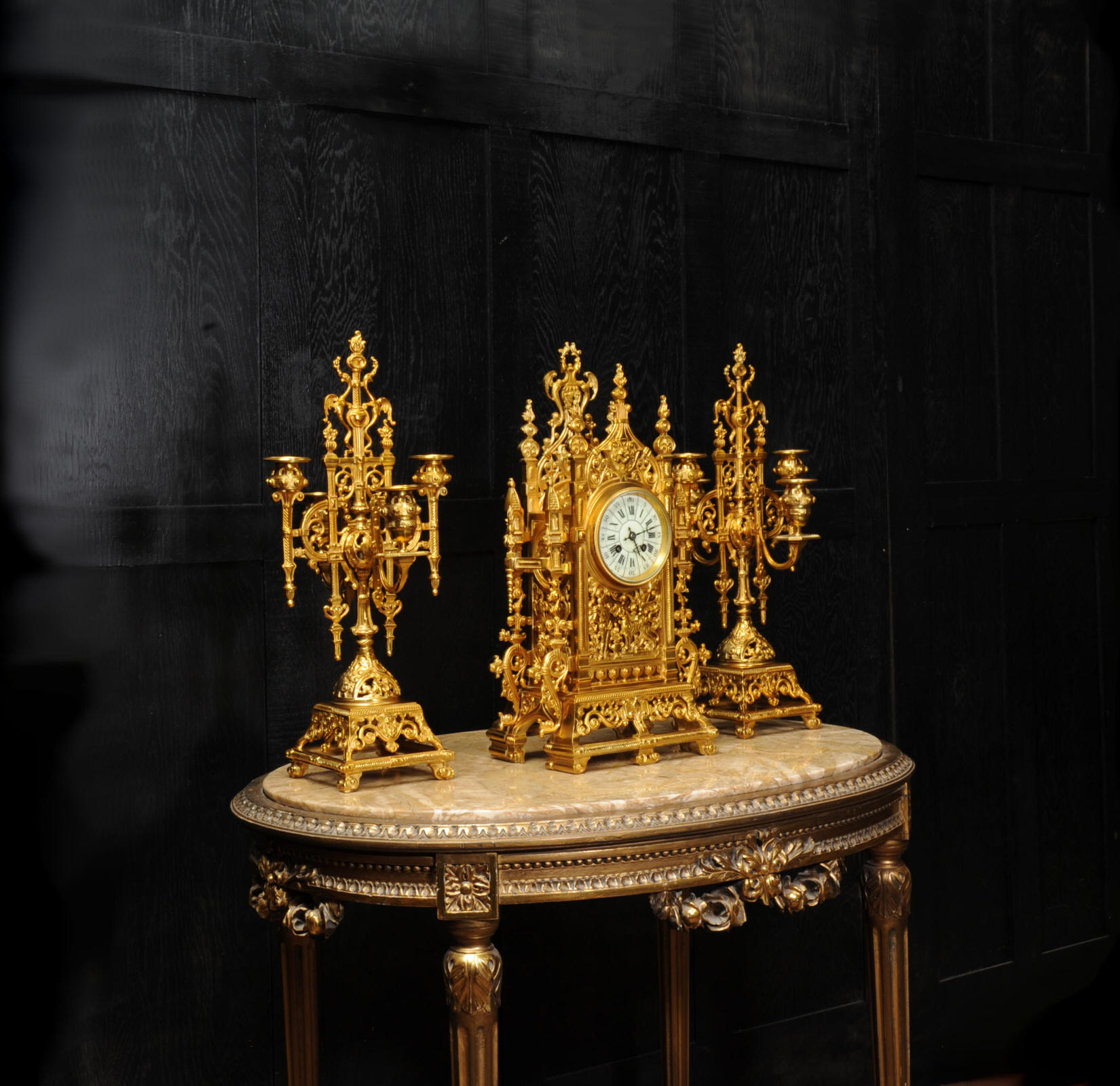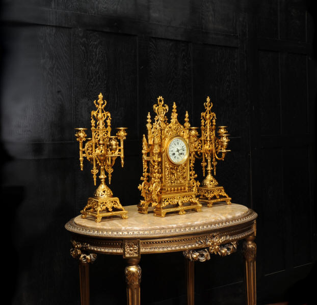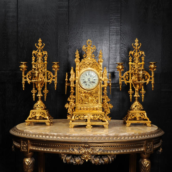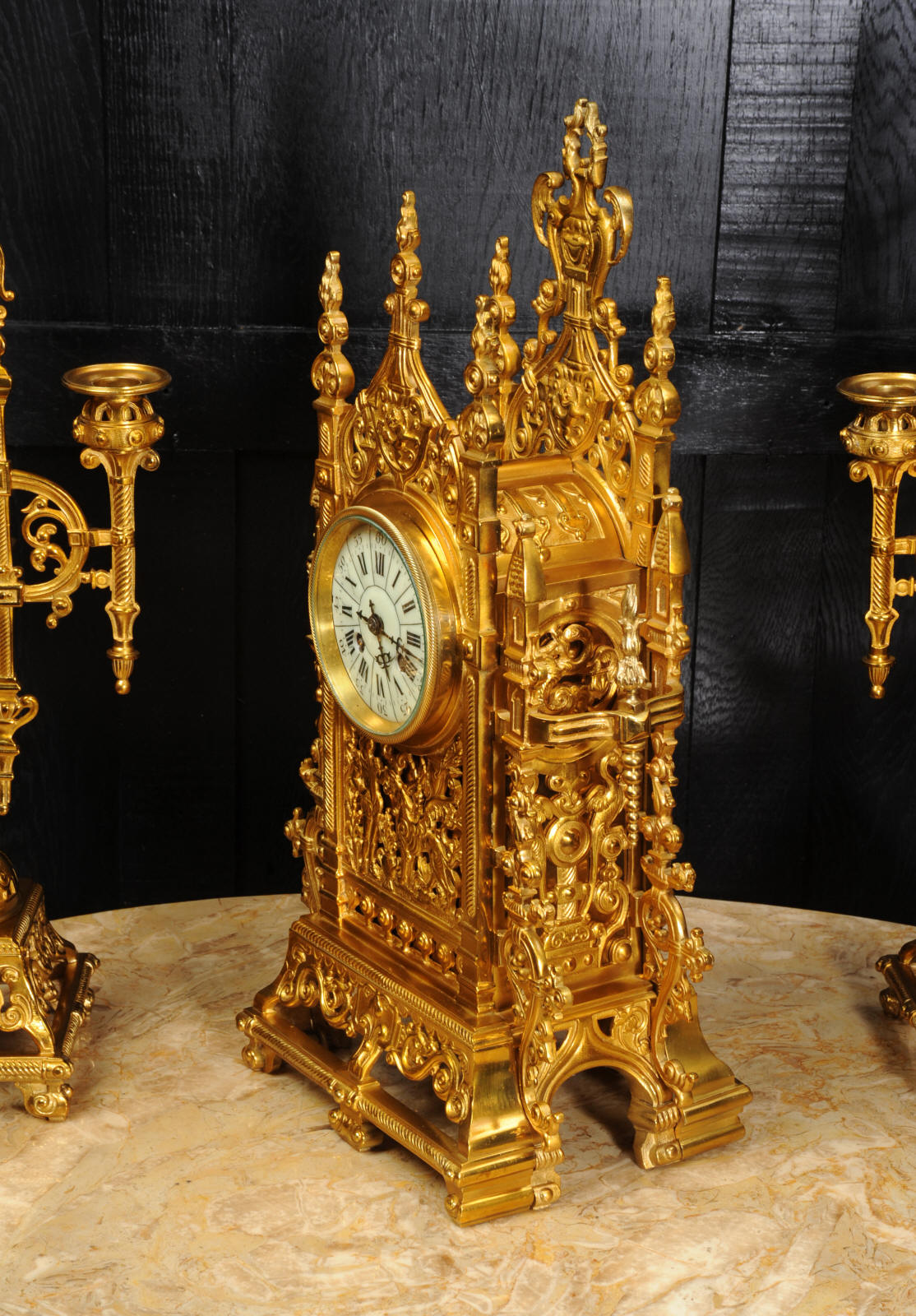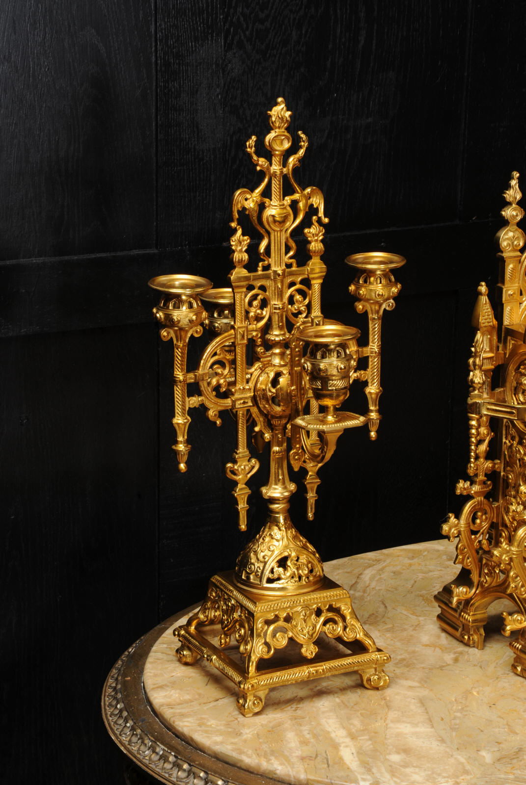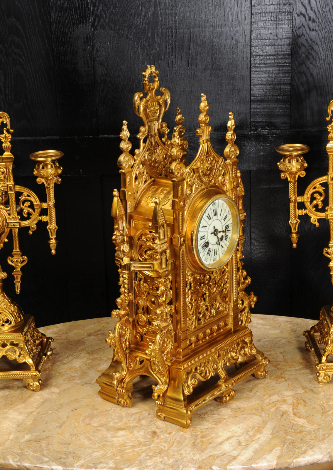 The dial is cream porcelain enamel on copper and is slightly sculptured. The bezel has a lovely rope design. It is complete with it's original blued steel hands. The French movement is of high quality and has the 'Japy Freres Grande Medaille D'Honneur' mark on the movement backplate. It is in excellent running condition and has been fully tested by our clockmaker. Pendulum is an old replacement. It runs for 8 days on one wind and strikes the hours and halves on a bell. Click the video clip below to hear the bell and watch the clock running. Condition of the case is excellent with a clean and bright finish protected by lacquer. There is some very minor wear and tarnish. The dial has some very slight nibbles around the winding holes. Candelabra arms are slightly distorted. A lovely and unusual Gothic clock set to add to your collection.