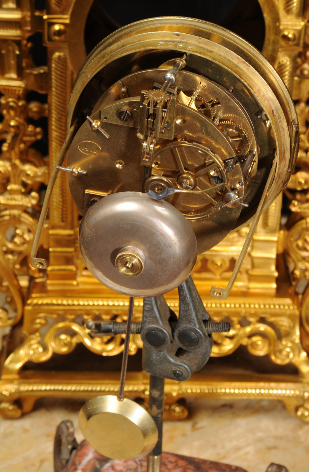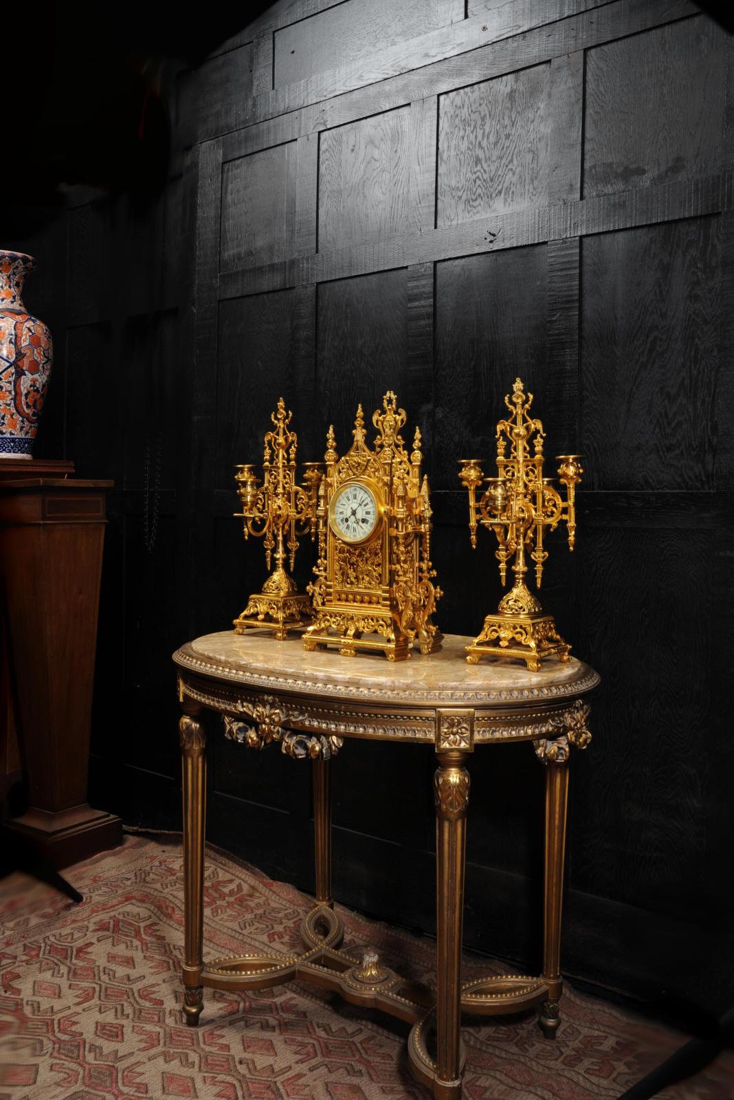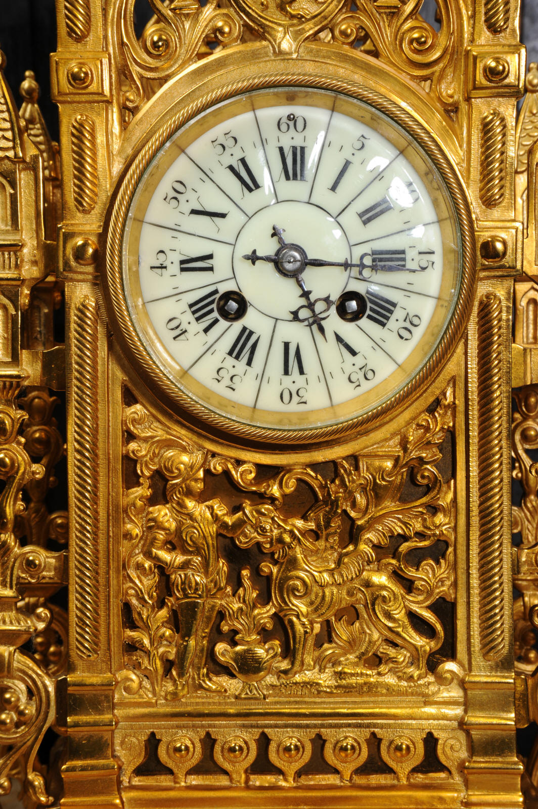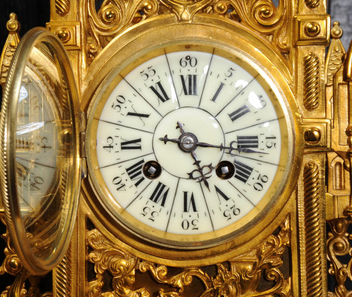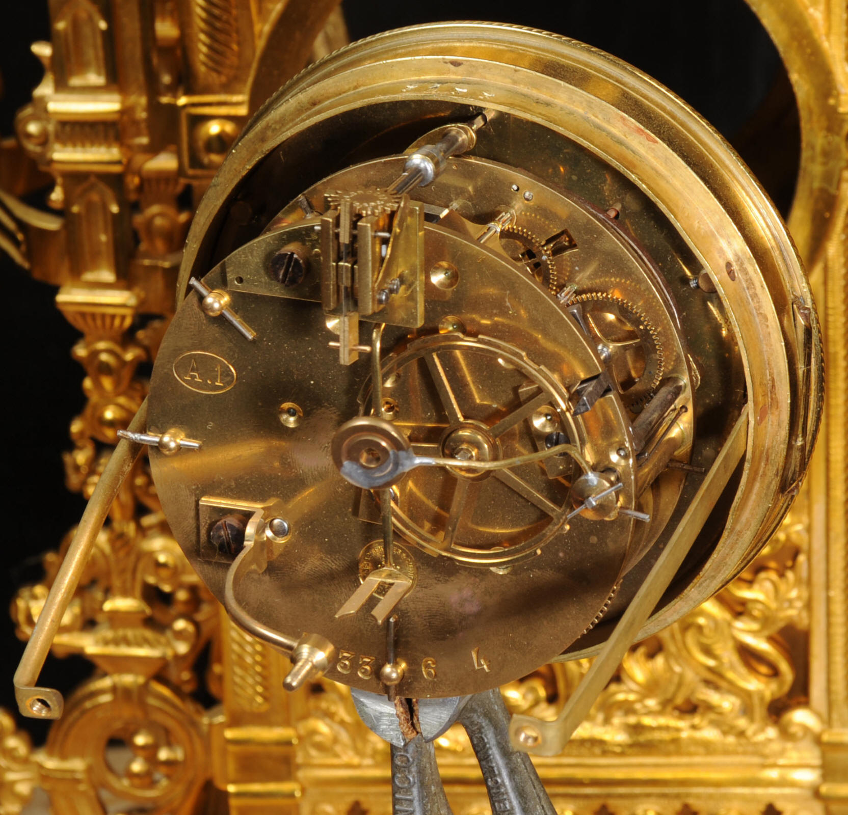 The dial is cream porcelain enamel on copper and is slightly sculptured. The bezel has a lovely rope design. It is complete with it's original blued steel hands. The French movement is of high quality and has the 'Japy Freres Grande Medaille D'Honneur' mark on the movement backplate. It is in excellent running condition and has been fully tested by our clockmaker. Pendulum is an old replacement. It runs for 8 days on one wind and strikes the hours and halves on a bell. Click the video clip below to hear the bell and watch the clock running. Condition of the case is excellent with a clean and bright finish protected by lacquer. There is some very minor wear and tarnish. The dial has some very slight nibbles around the winding holes. Candelabra arms are slightly distorted. A lovely and unusual Gothic clock set to add to your collection.