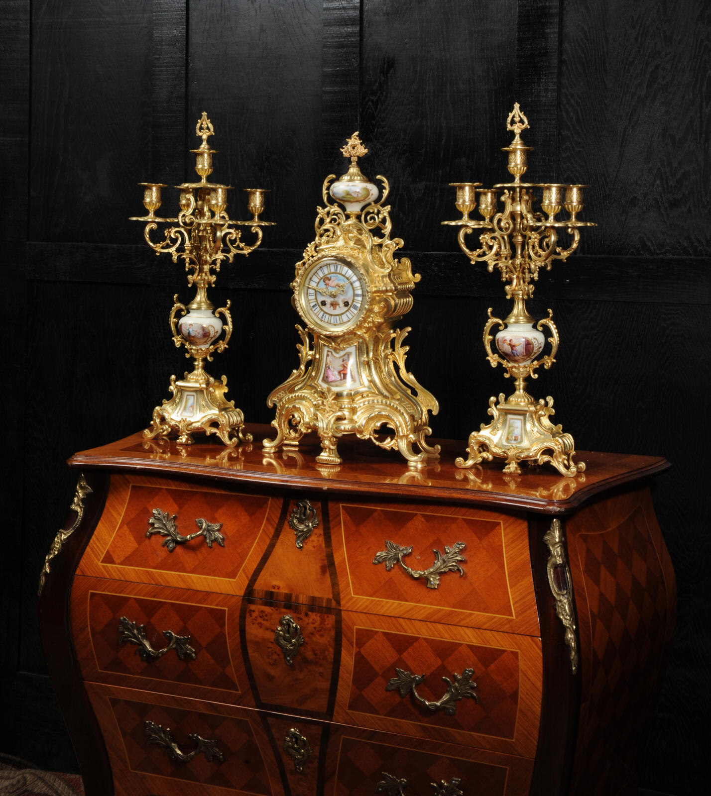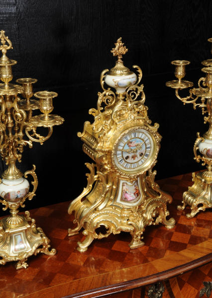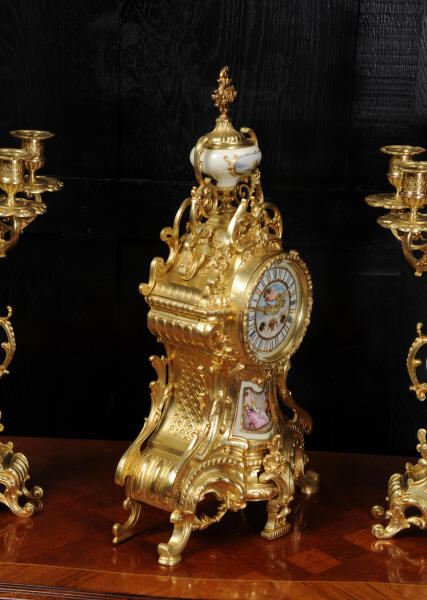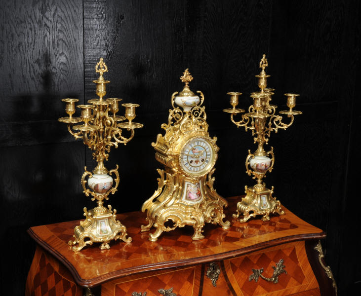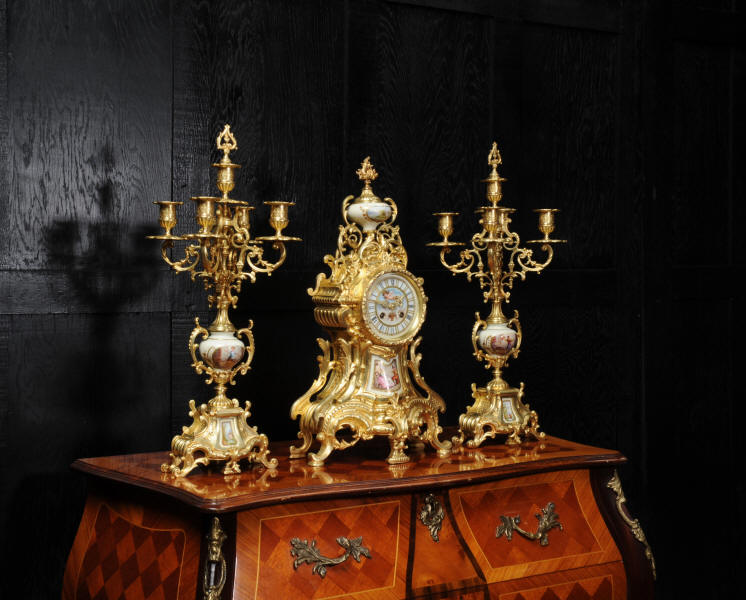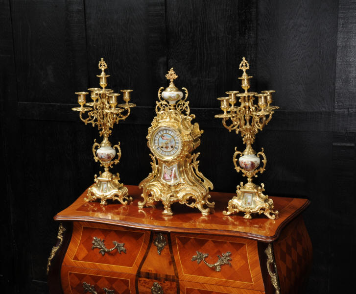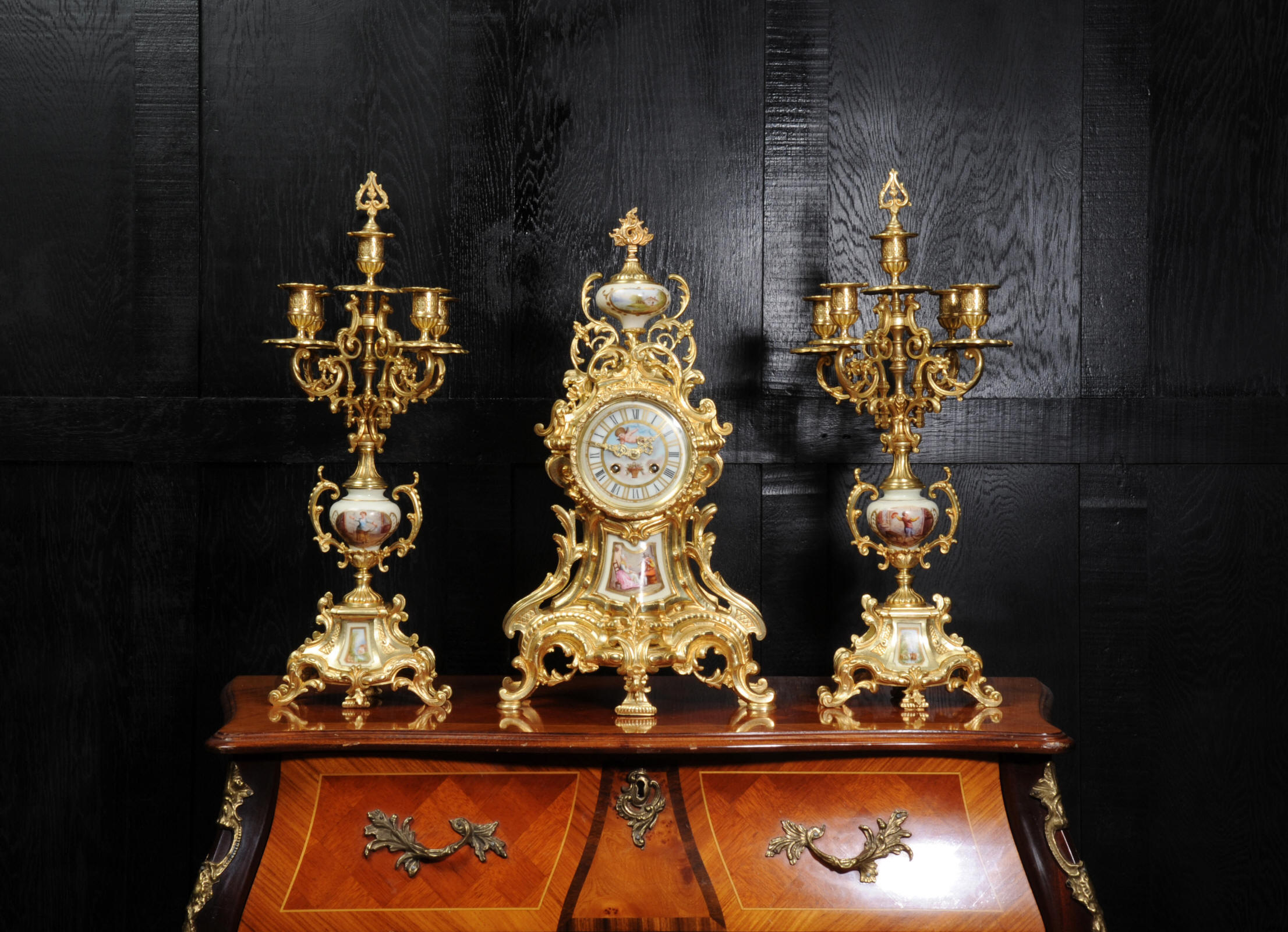 The case is of a waisted design with profuse, twirling acanthus decoration. The dial is also porcelain with a charming cherub amongst the clouds and a basket of flowers. It is complete with it's original finely fretted gilt brass hands. Candelabra have their original snuffers, these sit in the central nozzles as finials when candelabra are not in use. The French movement is by A. D. Mougin and is of the maker's usual high quality. It is in excellent clean and running condition having been fully overhauled by our clockmaker. Pendulum is a replacement. It runs for 8 days and strikes the hours and halves on a bell. Click the video clip below to hear the bell and watch the clock running. Condition of the case is excellent, the original gilding is beautifully clean, bright and crisp. The porcelain is also in excellent condition, some slight wear to the over glaze gilt decoration, very occasional marks and discolouration and a couple of nibbles to the top of the candelabra urns. Candelabra are slightly distorted. The set makes a stunning display as you can see below.