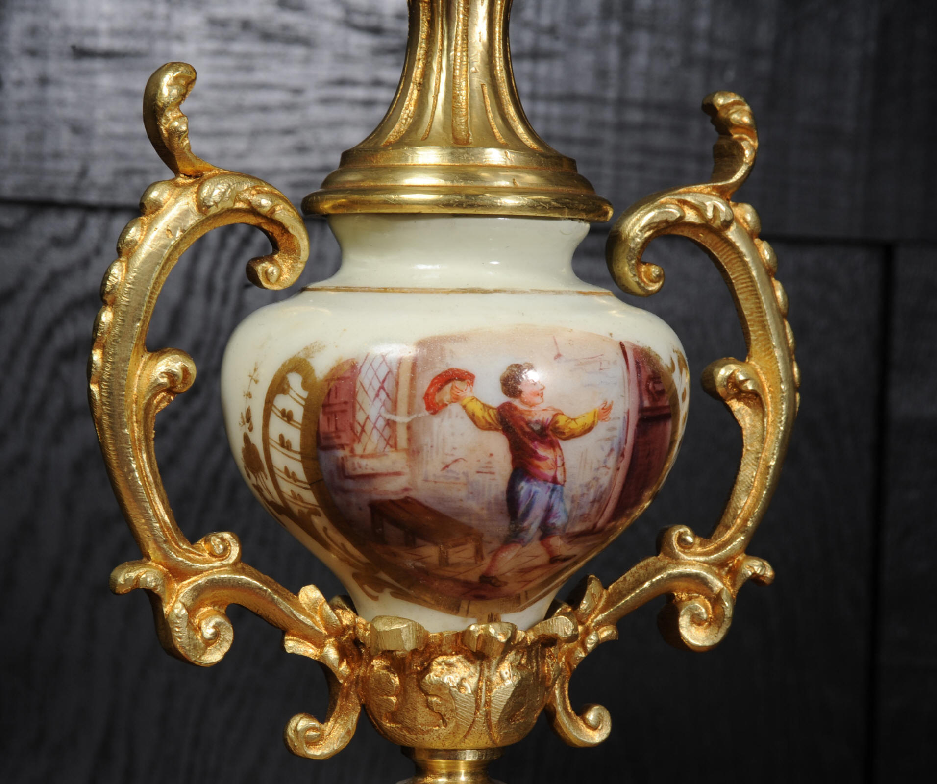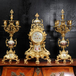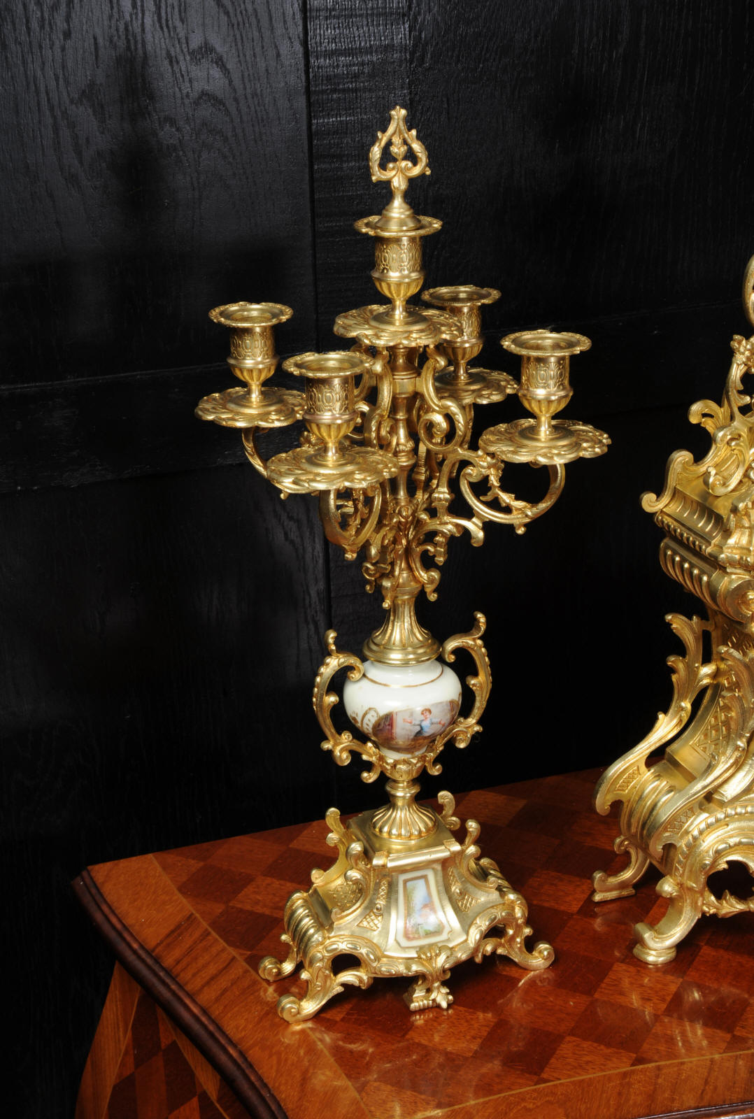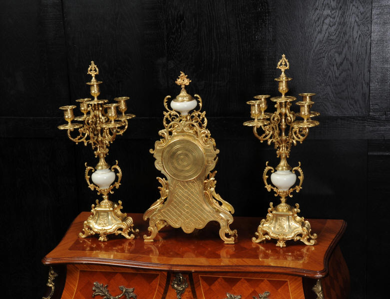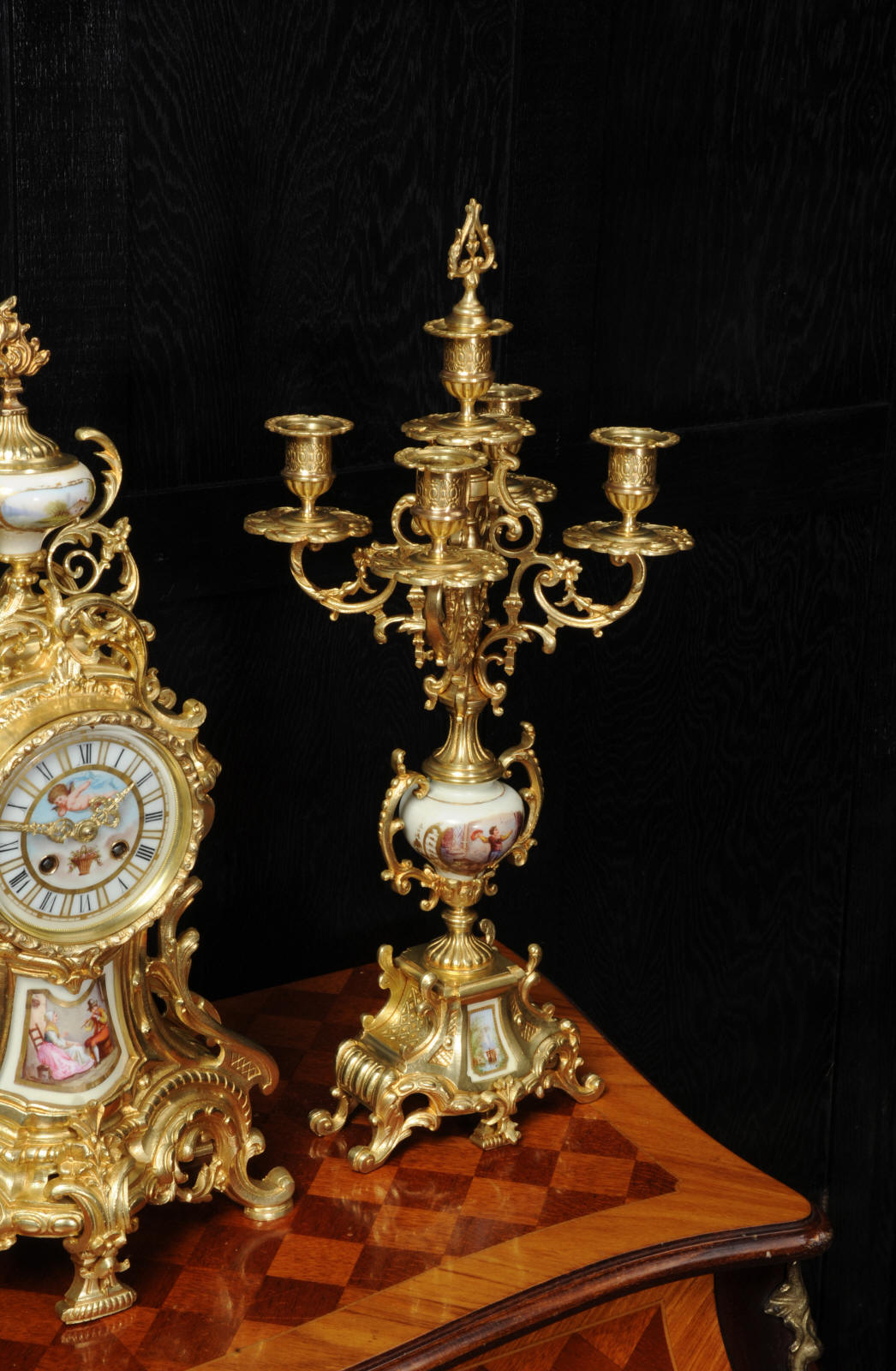 The case is of a waisted design with profuse, twirling acanthus decoration. The dial is also porcelain with a charming cherub amongst the clouds and a basket of flowers. It is complete with it's original finely fretted gilt brass hands. Candelabra have their original snuffers, these sit in the central nozzles as finials when candelabra are not in use. The French movement is by A. D. Mougin and is of the maker's usual high quality. It is in excellent clean and running condition having been fully overhauled by our clockmaker. Pendulum is a replacement. It runs for 8 days and strikes the hours and halves on a bell. Click the video clip below to hear the bell and watch the clock running. Condition of the case is excellent, the original gilding is beautifully clean, bright and crisp. The porcelain is also in excellent condition, some slight wear to the over glaze gilt decoration, very occasional marks and discolouration and a couple of nibbles to the top of the candelabra urns. Candelabra are slightly distorted. The set makes a stunning display as you can see below.