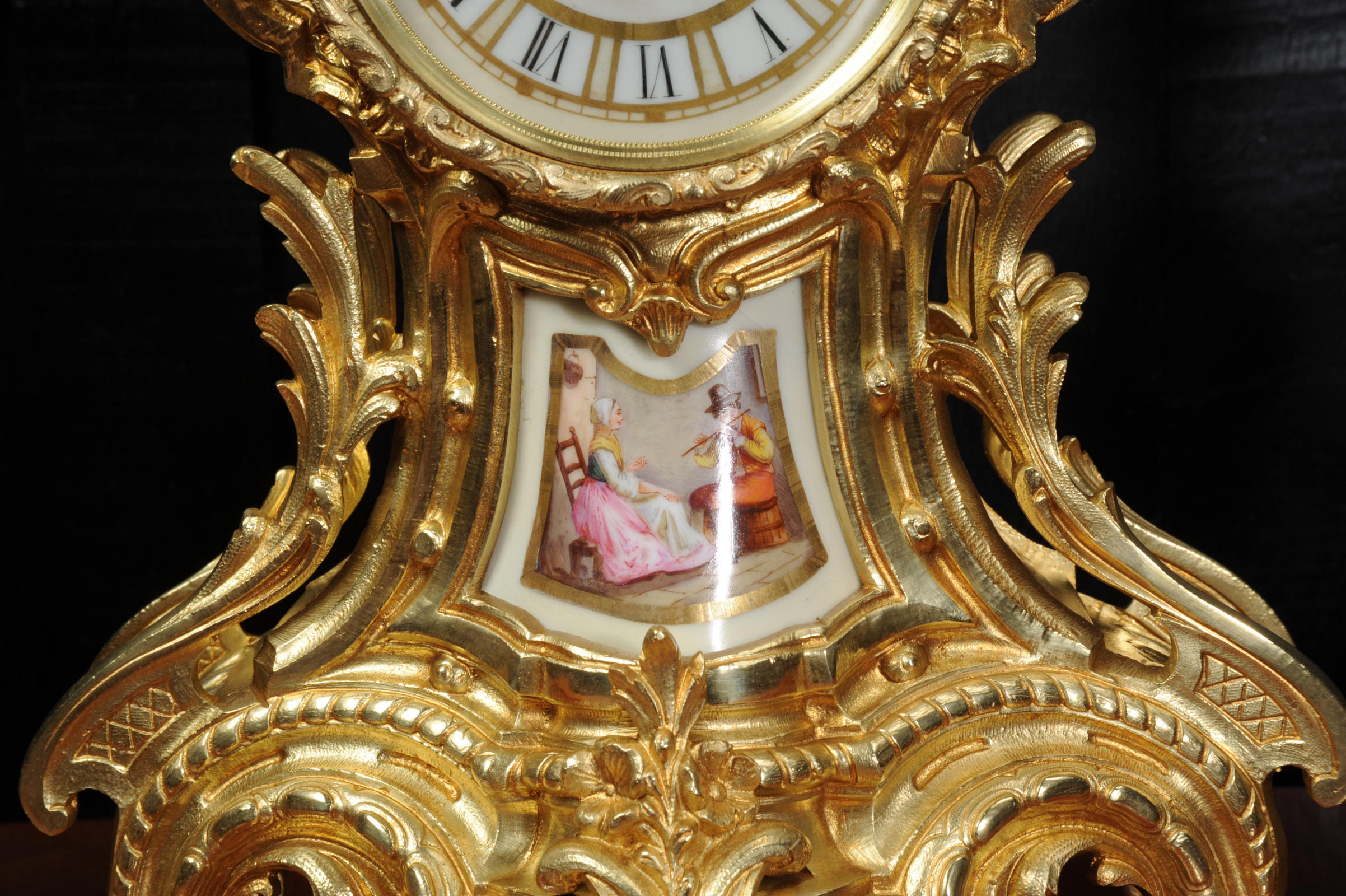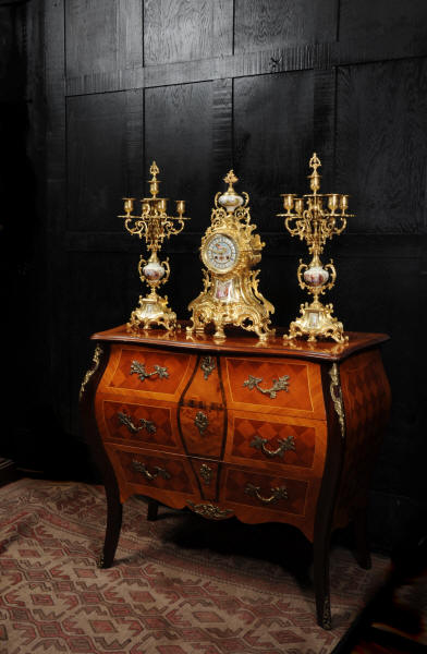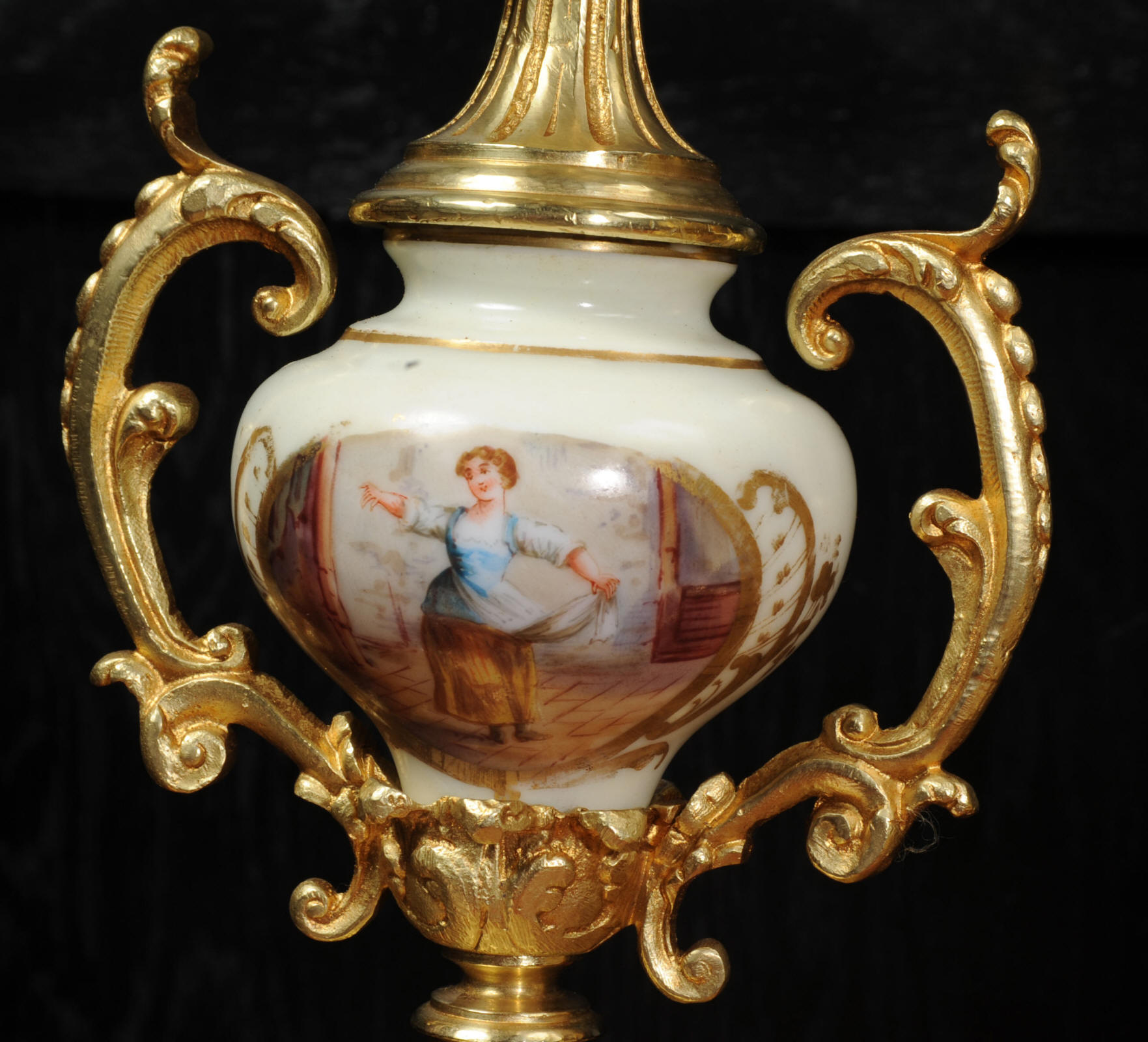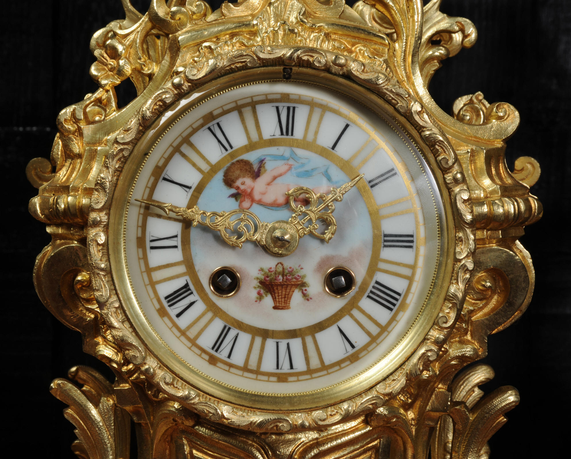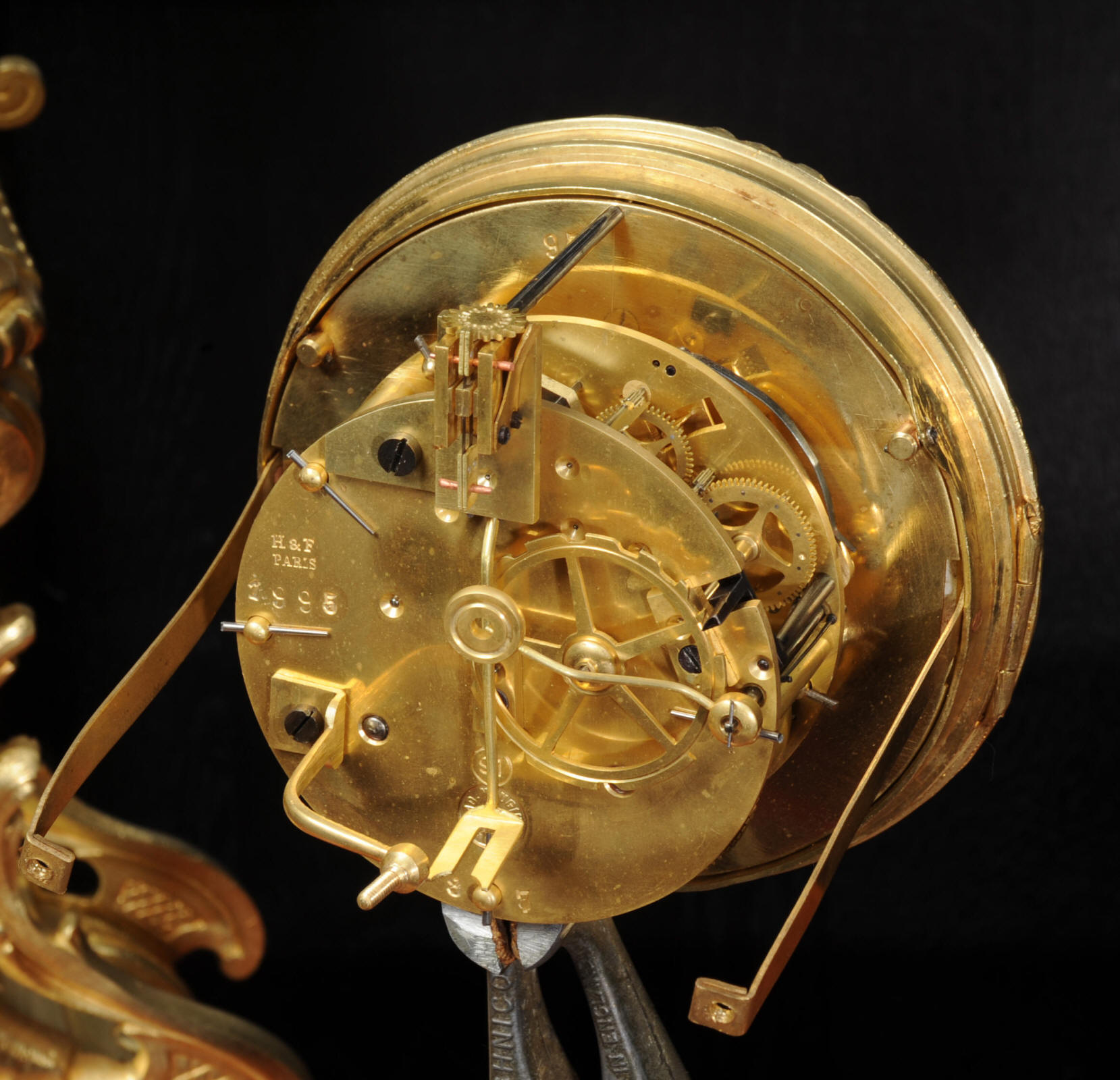 The case is of a waisted design with profuse, twirling acanthus decoration. The dial is also porcelain with a charming cherub amongst the clouds and a basket of flowers. It is complete with it's original finely fretted gilt brass hands. Candelabra have their original snuffers, these sit in the central nozzles as finials when candelabra are not in use. The French movement is by A. D. Mougin and is of the maker's usual high quality. It is in excellent clean and running condition having been fully overhauled by our clockmaker. Pendulum is a replacement. It runs for 8 days and strikes the hours and halves on a bell. Click the video clip below to hear the bell and watch the clock running. Condition of the case is excellent, the original gilding is beautifully clean, bright and crisp. The porcelain is also in excellent condition, some slight wear to the over glaze gilt decoration, very occasional marks and discolouration and a couple of nibbles to the top of the candelabra urns. Candelabra are slightly distorted. The set makes a stunning display as you can see below.