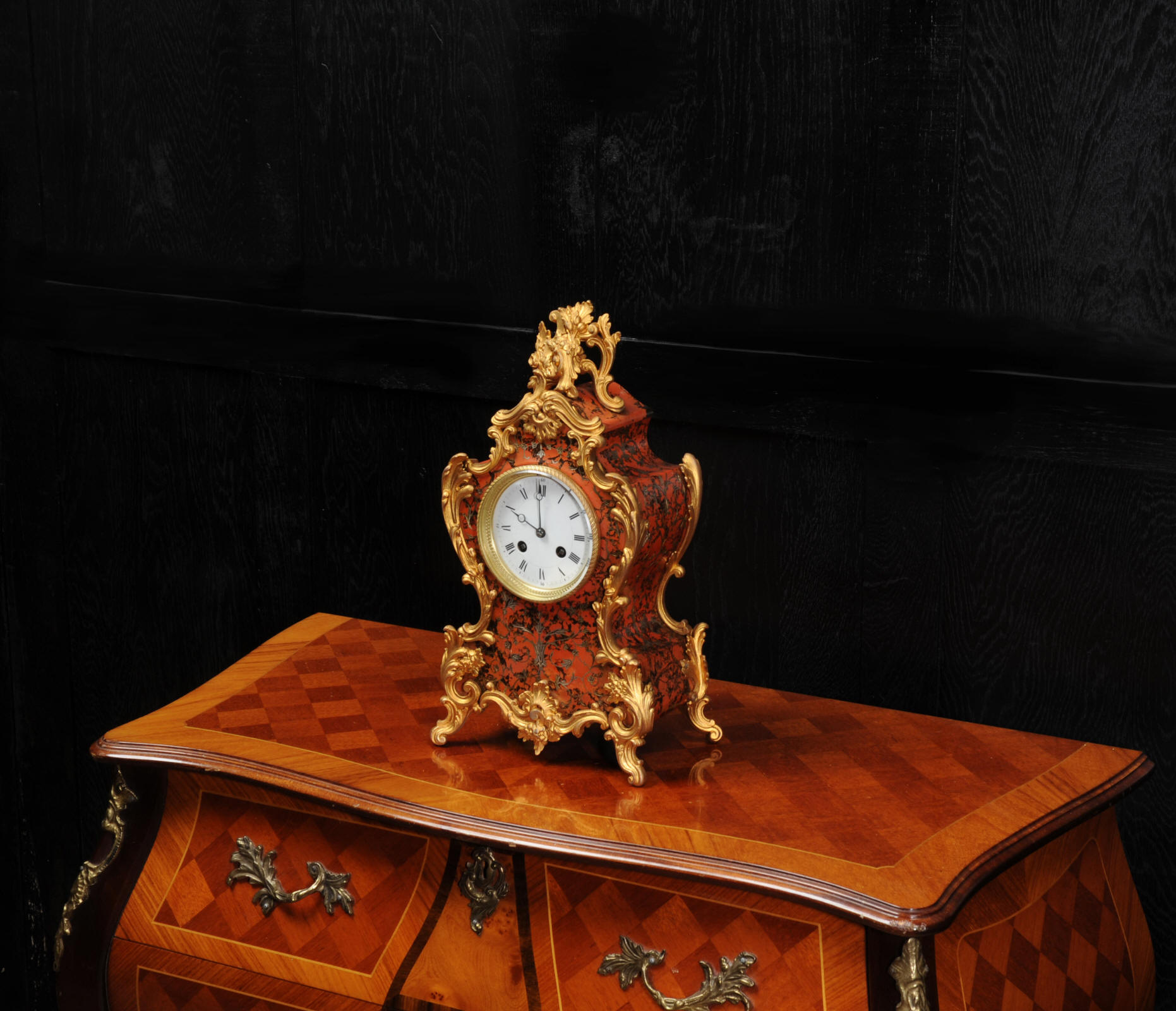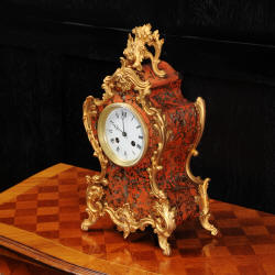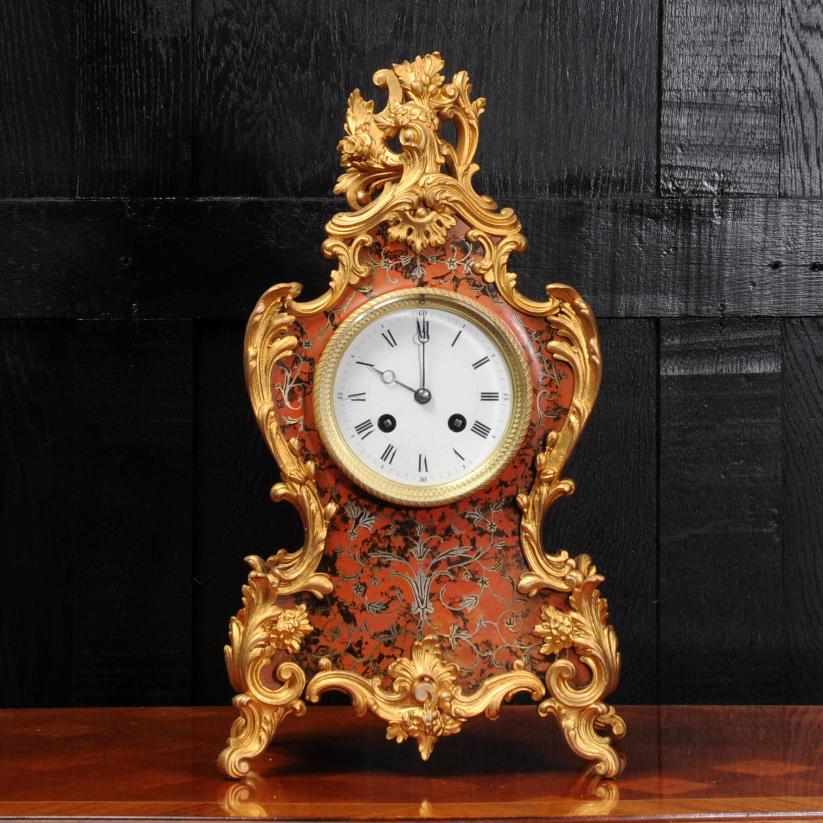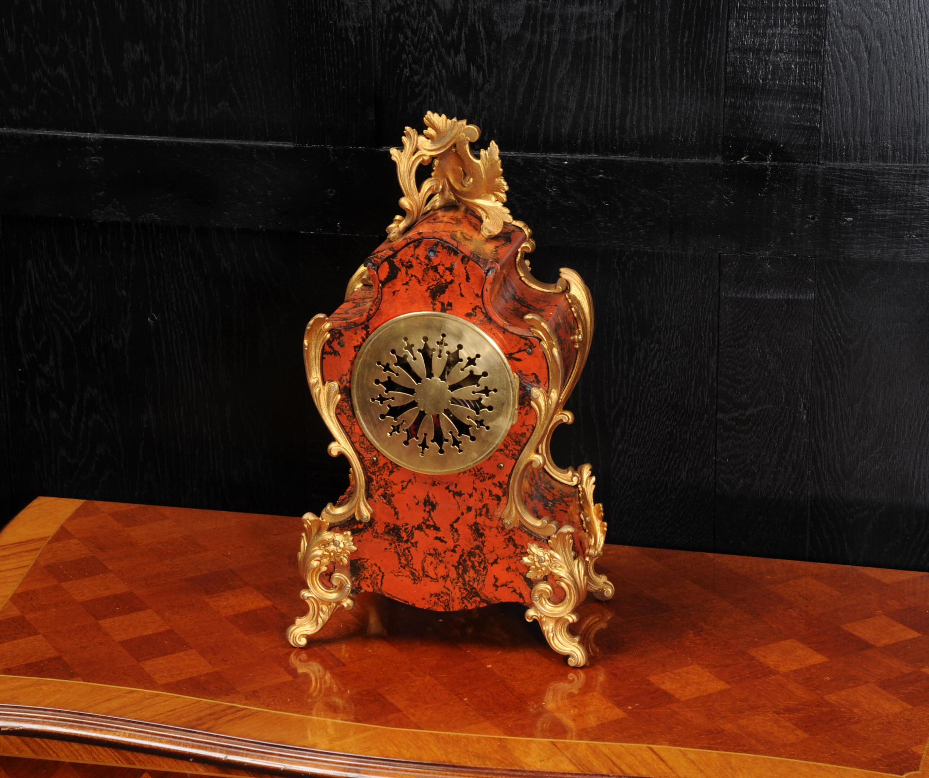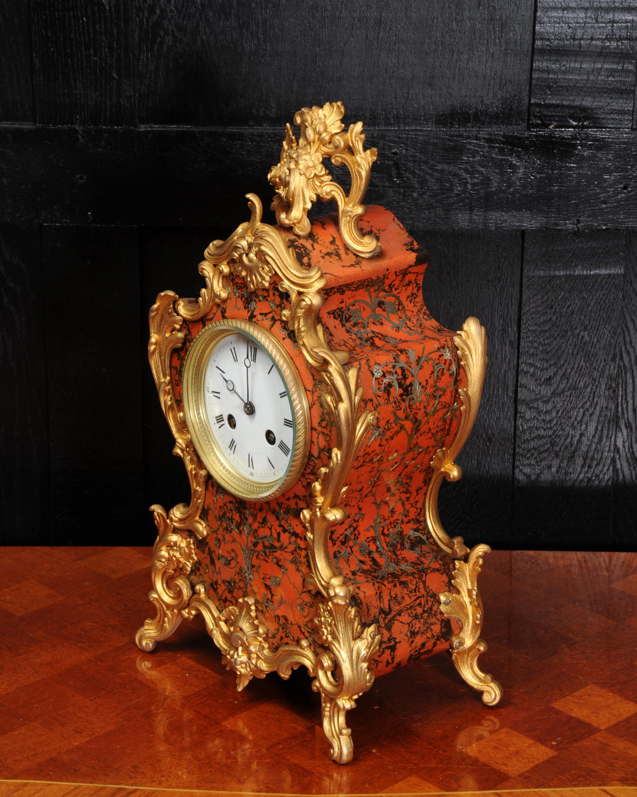 The dial is porcelain enamel on copper and has a finely engine turned bezel and delicately cut blued steel hands. The French movement is by A. D. Mougin and is of the company's usual high quality. It is in excellent clean and running condition having been fully overhauled by our clockmaker. Pendulum is an old replacement. It runs for 8 days and strikes the hours and halves on a gong. Click the video clip below to hear the gong and watch the clock running! Condition of the case is excellent, the lacquer is in good condition and has gently faded to a soft terracotta colour over the years. The gilt metal has some wear and we have polished it to a bright and clean finish with some wear on the high spots. The dial is good, there is some slight enamel loss near the 9 o'clock.