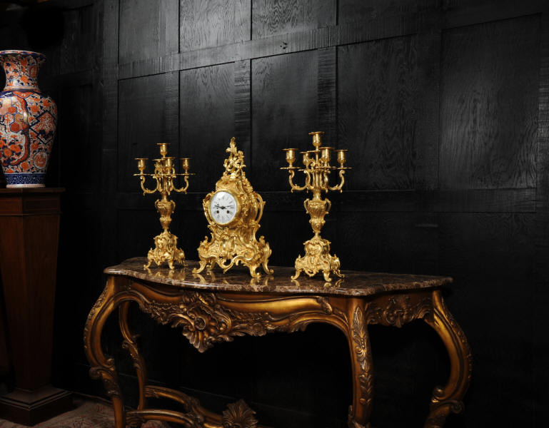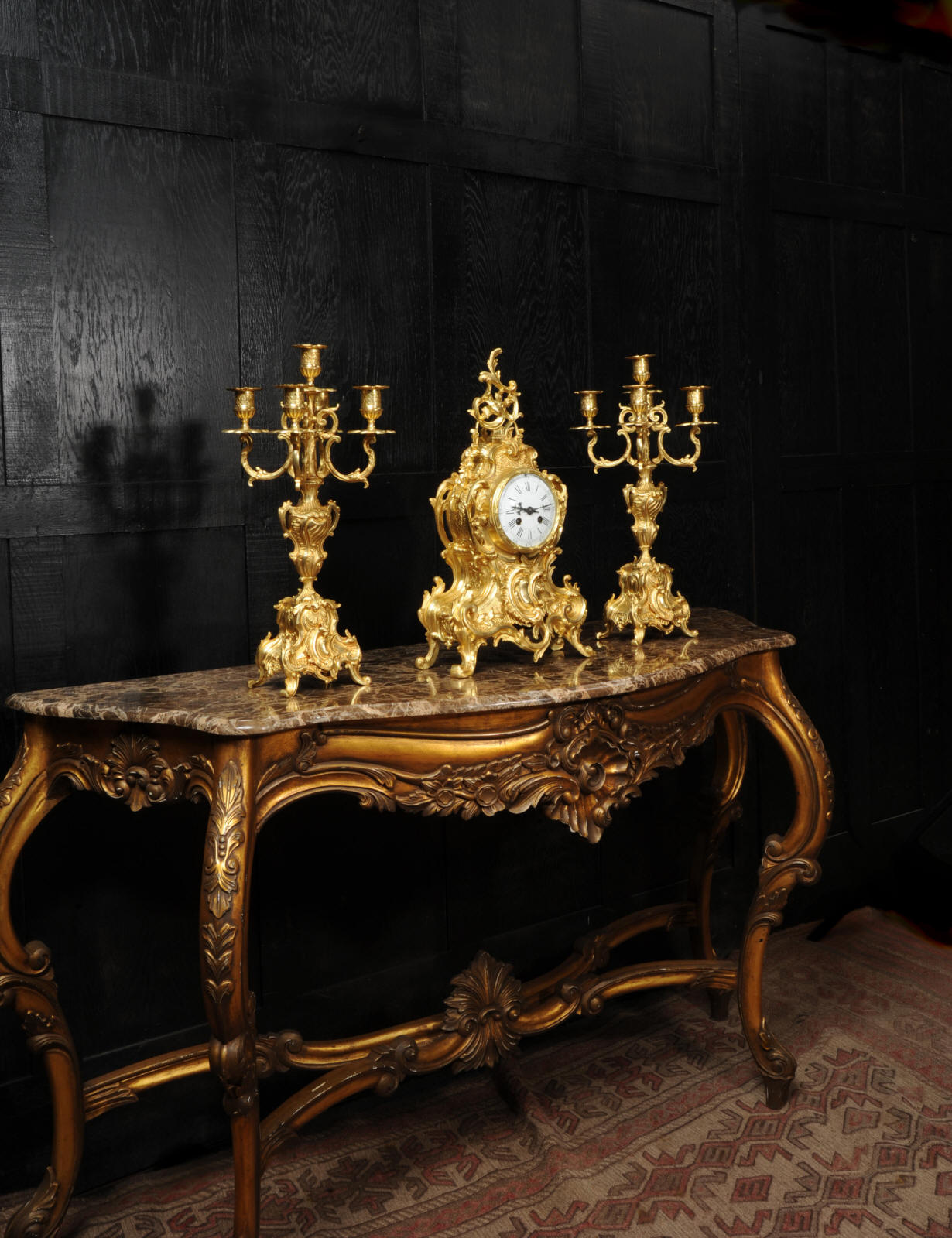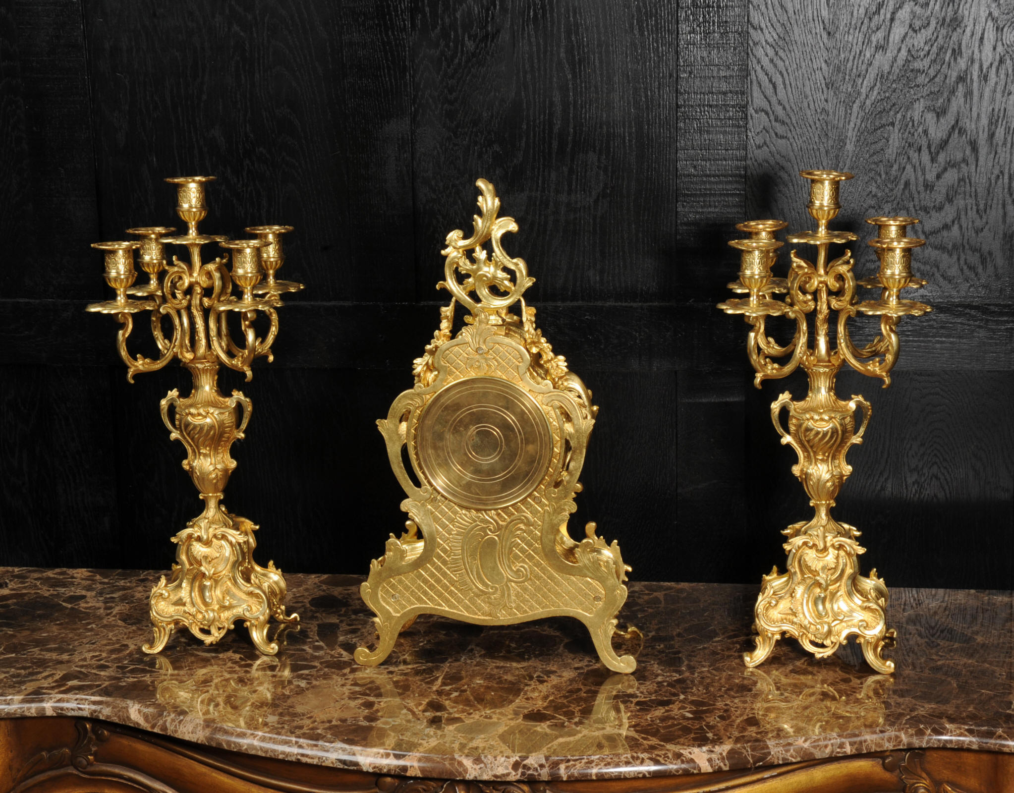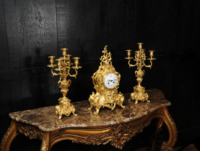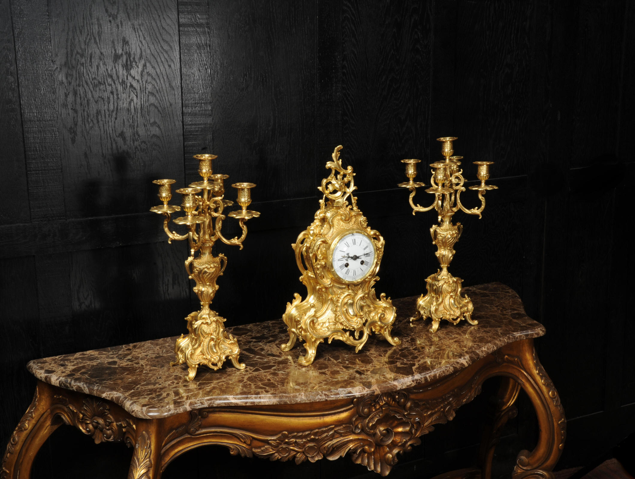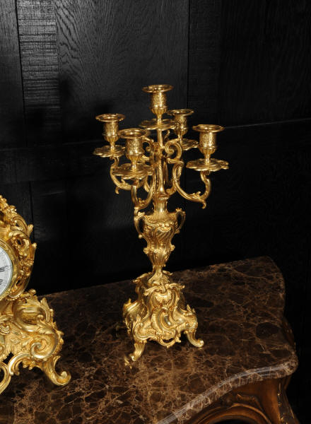 The beautiful, large porcelain enamel dial is complete with the original finely cut gilt brass hands and convex glass. The French movement is of high quality and is by Vincenti et Cie. It is in excellent clean and running condition having been fully overhauled by our clockmaker. Pendulum is original. It runs for 8 days and strikes the hours and halves on a bell. Click the video clip below to hear the bell and watch the clock running! Condition of the case is excellent, the original gilding is beautifully clean and bright with hardly any wear or discolouration. The dial is also in excellent condition with no damage. Candelabra arms are slightly distorted.
