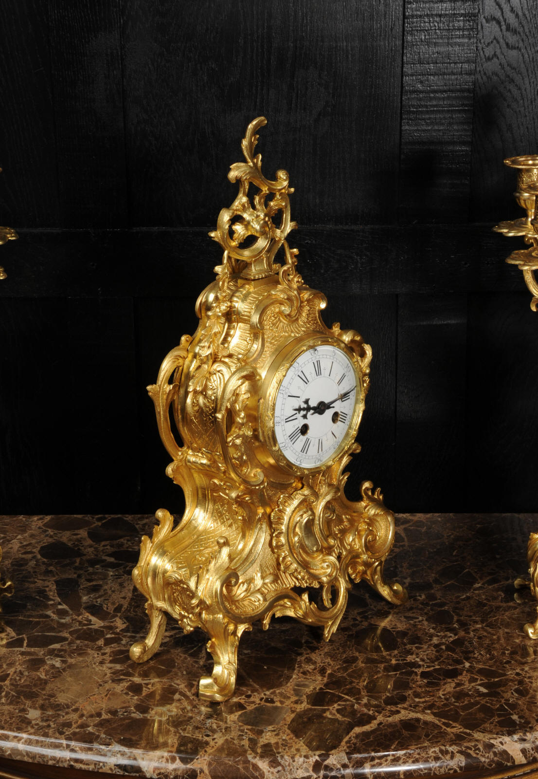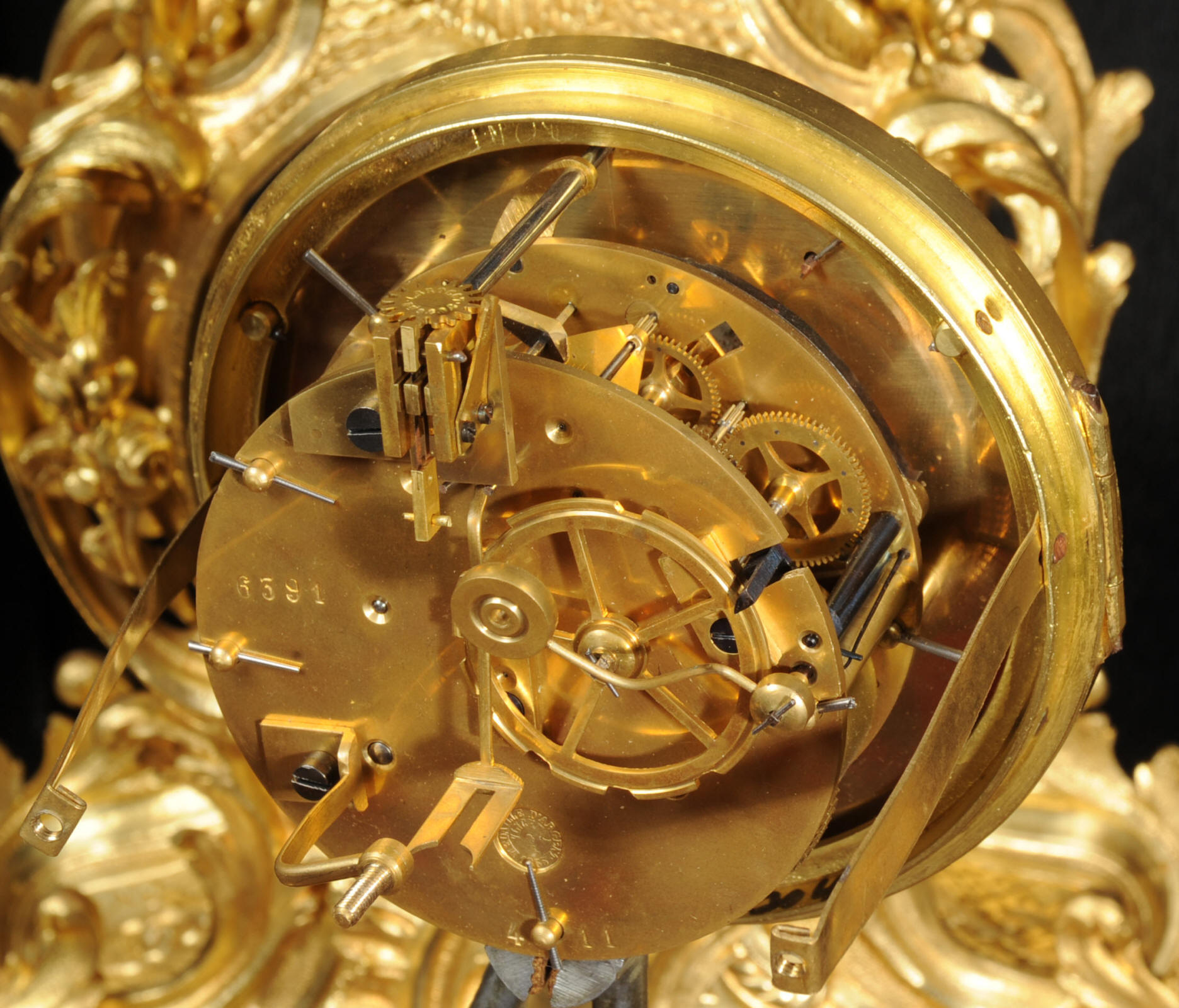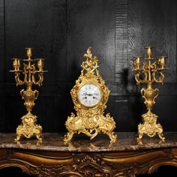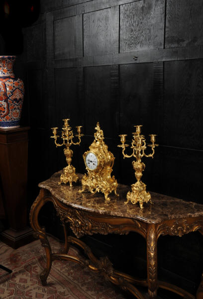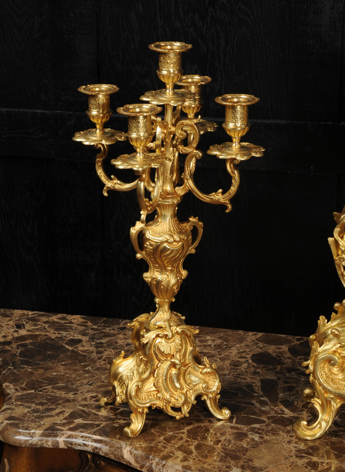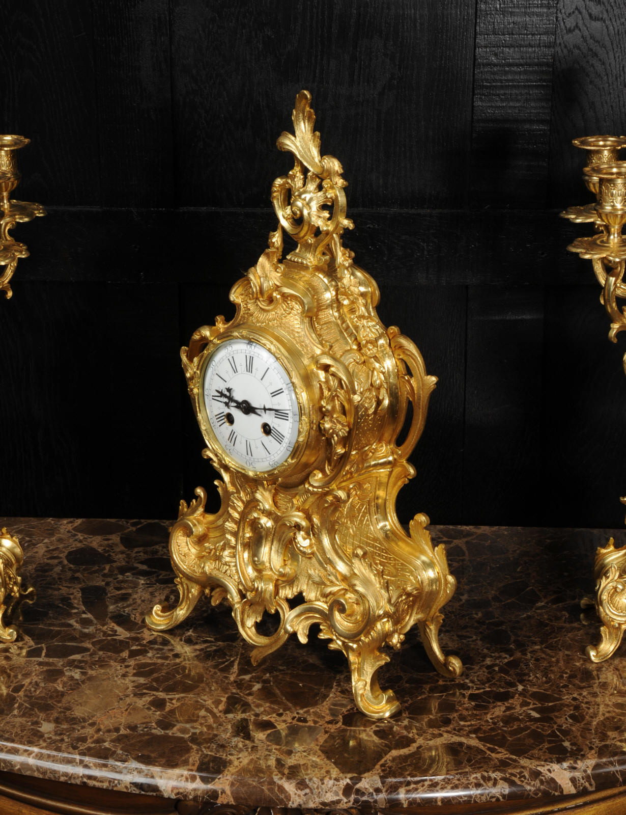 The beautiful, large porcelain enamel dial is complete with the original finely cut gilt brass hands and convex glass. The French movement is of high quality and is by Vincenti et Cie. It is in excellent clean and running condition having been fully overhauled by our clockmaker. Pendulum is original. It runs for 8 days and strikes the hours and halves on a bell. Click the video clip below to hear the bell and watch the clock running! Condition of the case is excellent, the original gilding is beautifully clean and bright with hardly any wear or discolouration. The dial is also in excellent condition with no damage. Candelabra arms are slightly distorted.