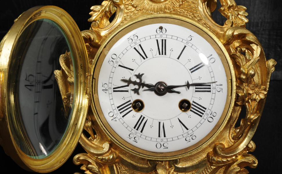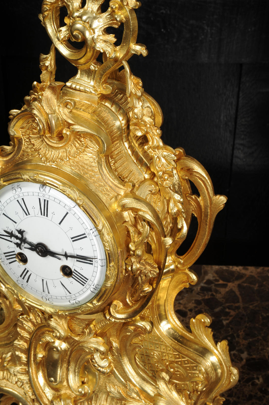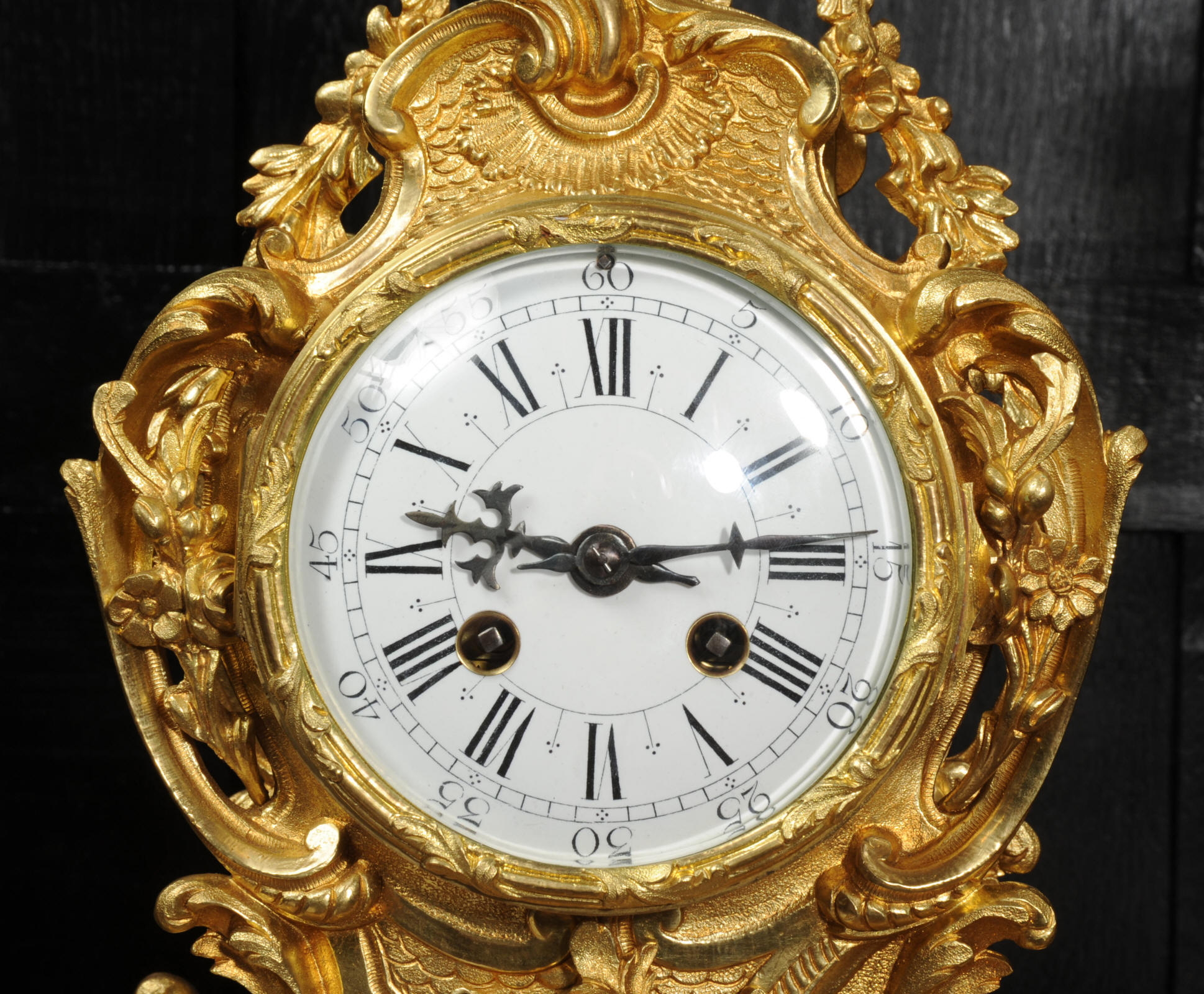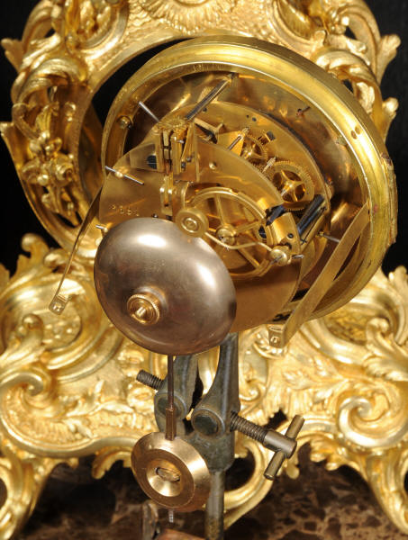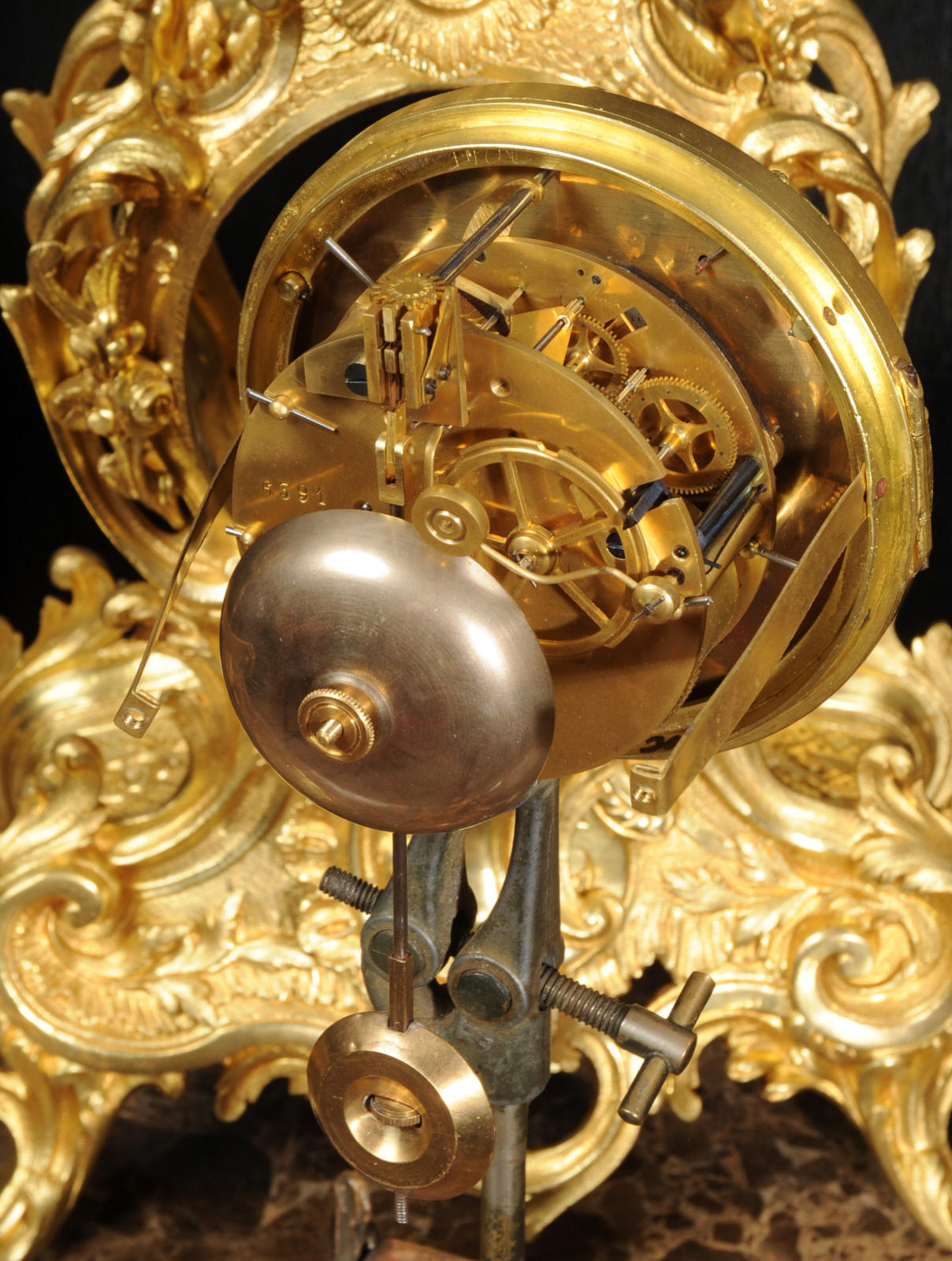 The beautiful, large porcelain enamel dial is complete with the original finely cut gilt brass hands and convex glass. The French movement is of high quality and is by Vincenti et Cie. It is in excellent clean and running condition having been fully overhauled by our clockmaker. Pendulum is original. It runs for 8 days and strikes the hours and halves on a bell. Click the video clip below to hear the bell and watch the clock running! Condition of the case is excellent, the original gilding is beautifully clean and bright with hardly any wear or discolouration. The dial is also in excellent condition with no damage. Candelabra arms are slightly distorted.