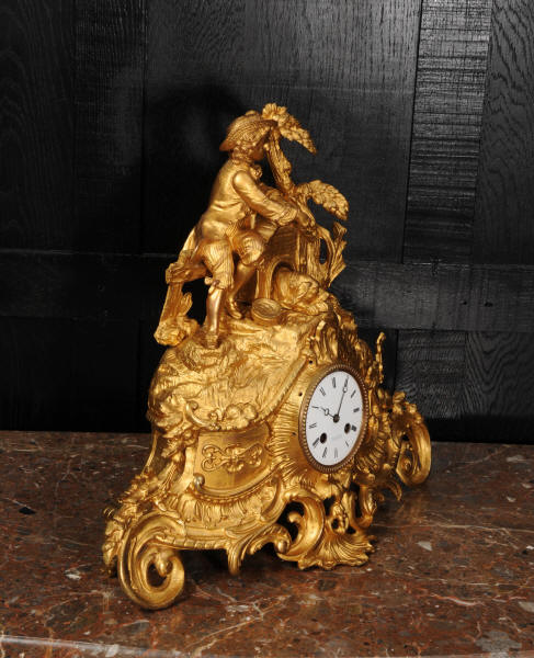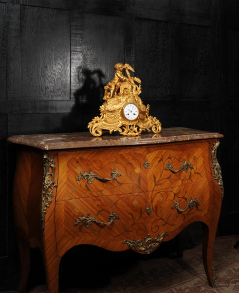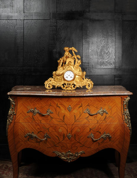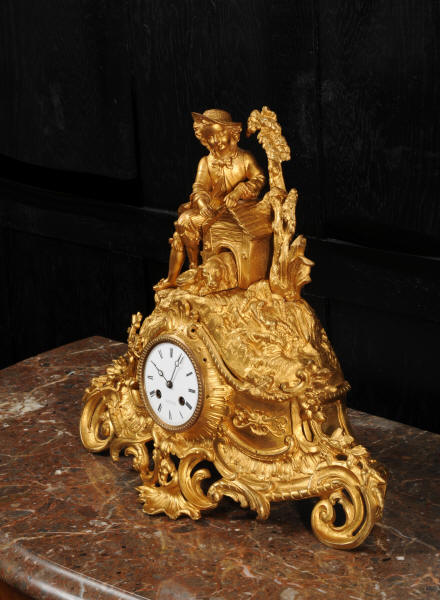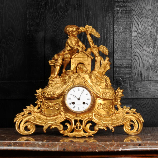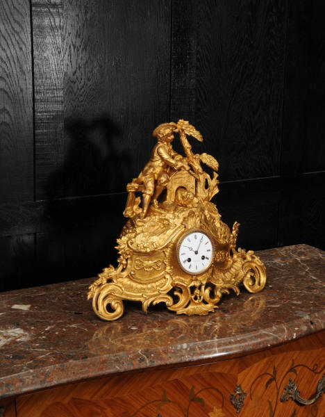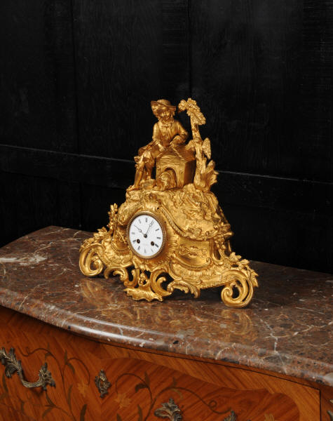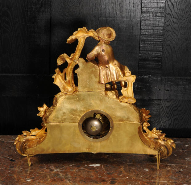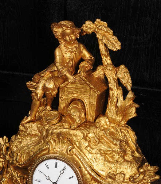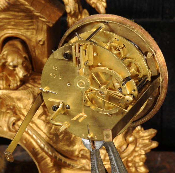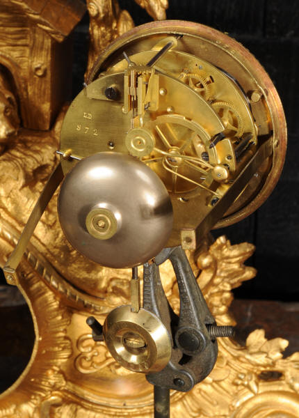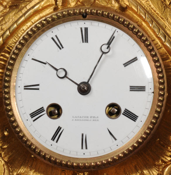 The dial is porcelain enamel on copper with its original blued steel moon hands and has the retailers signature. Please note that this type of clock does not have a glazed bezel or a rear door. The French movement is of good quality and is in excellent clean and running condition having been fully serviced by our clockmaker. The retailers mark 'L.D.' is on the movement backplate. Pendulum is an old replacement. It runs for 8 days on one wind and strikes the hours and halves on a bell. Click the video below to hear the bell and watch the clock running! Condition of the case is good, there is some wear to the gilding and it has been polished to a clean and bright finish. The bezel opening of the case has a couple of holes that do not detract and the movement retaining ring is an old replacement. The dial has a slight chip and a faint hairline near the three o'clock position.
