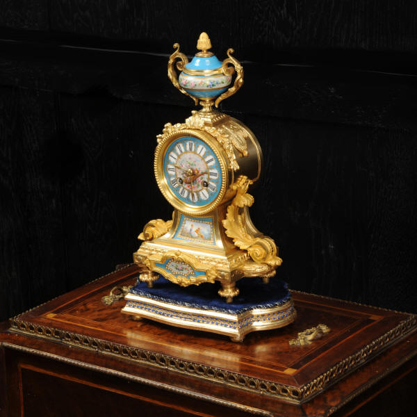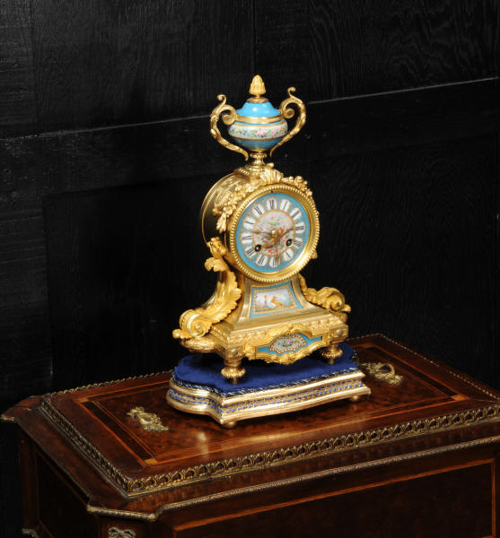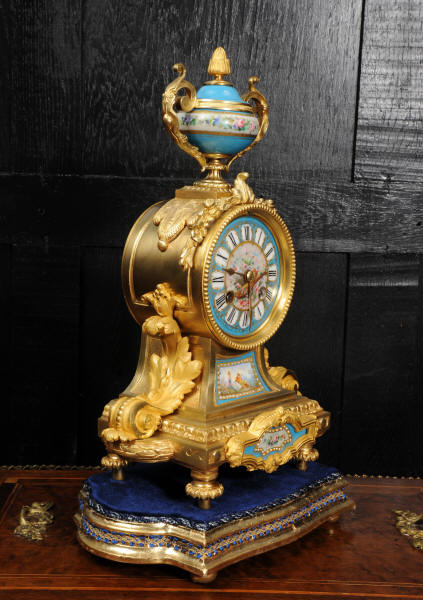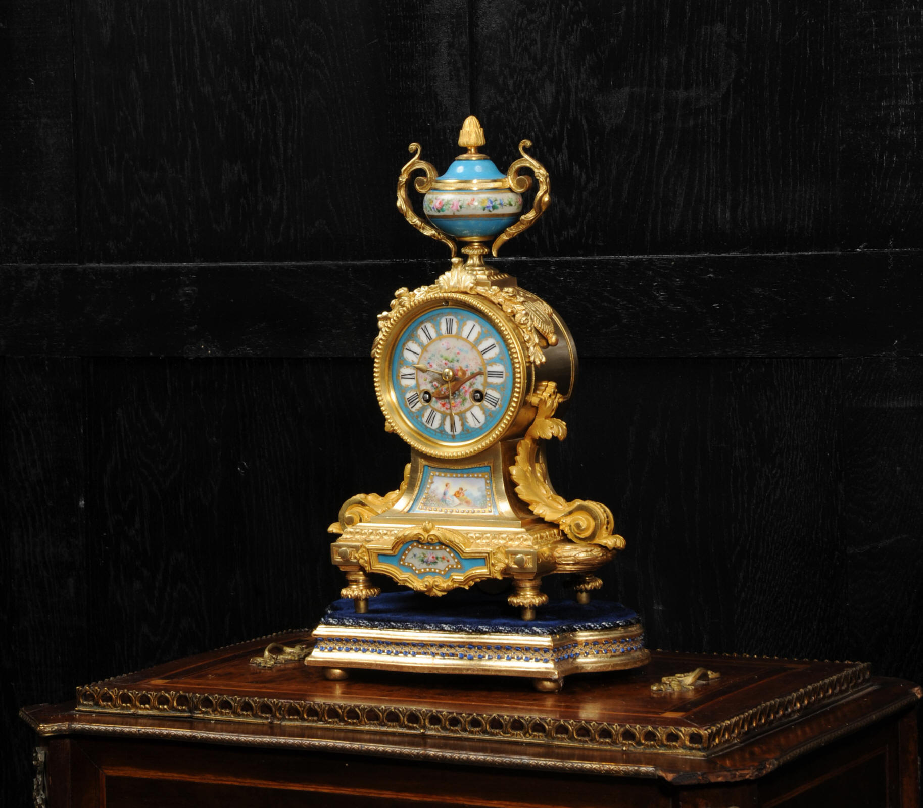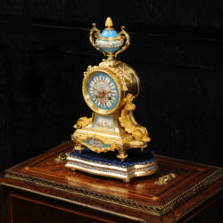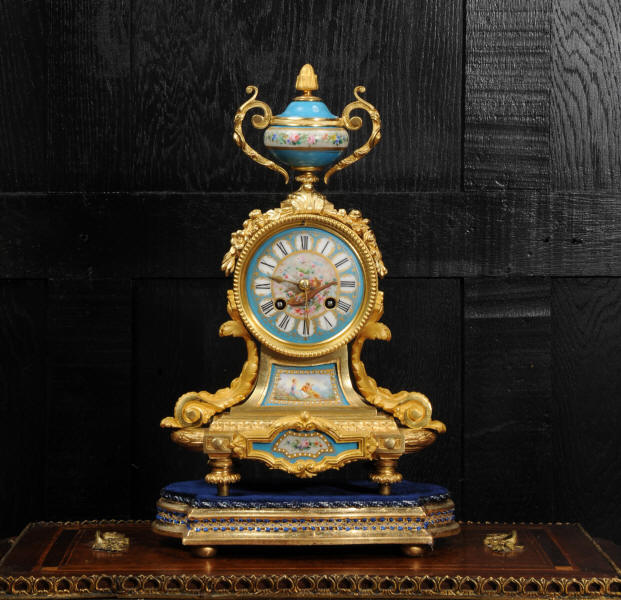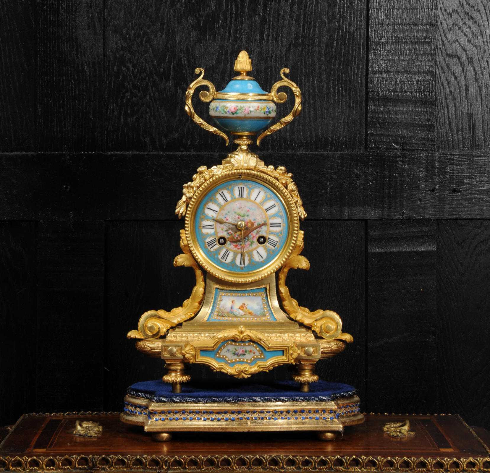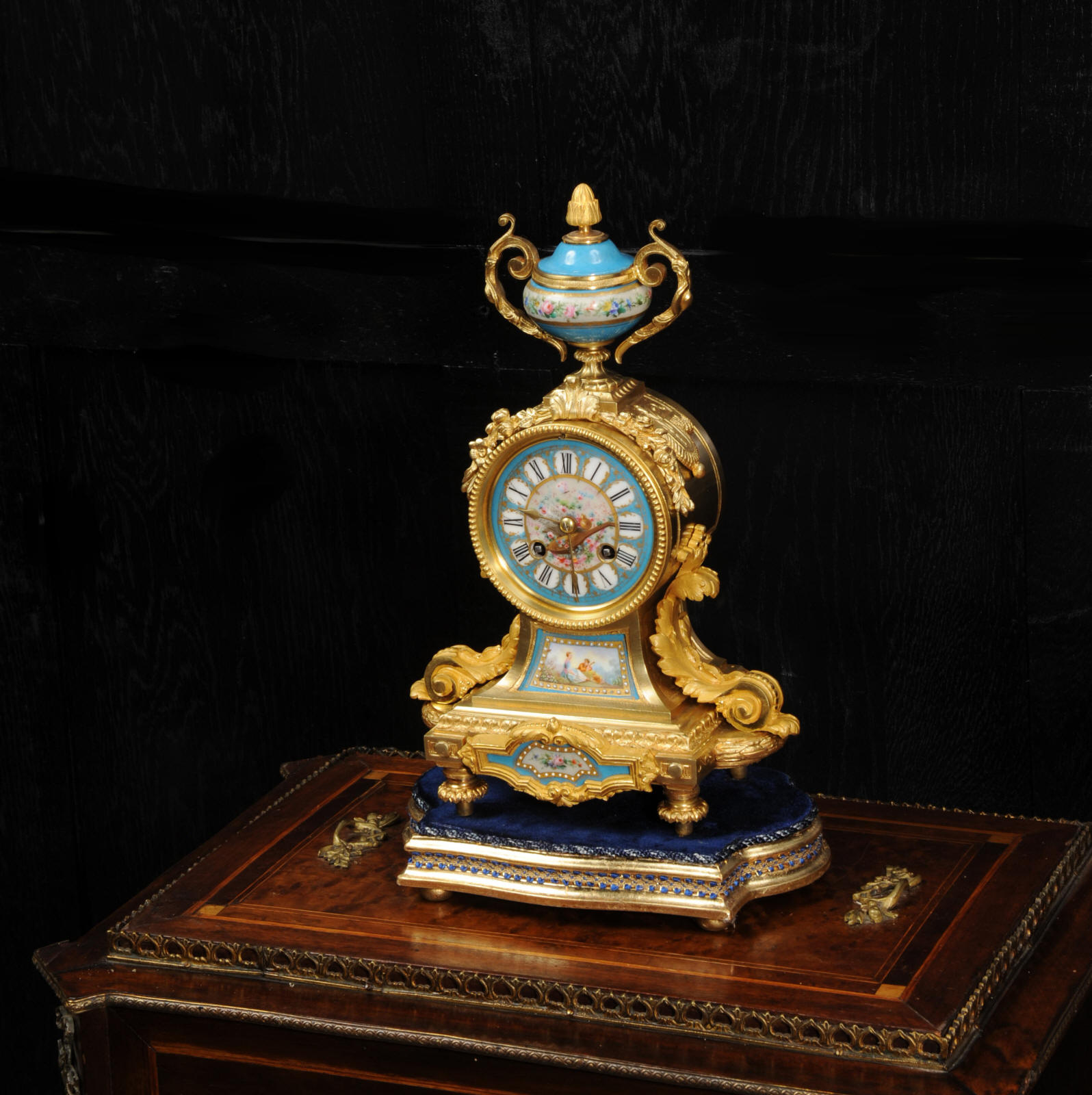 The lower porcelain panel is painted with floral swag and the dial is decorated with musical motifs and roses, allegorical of love. The clock is complete with it's original gesso base. Please note that this style of clock does not have a glazed bezel or a rear door. The French movement is of very high quality as one would expect of Japy Freres. It has the Japy Freres 'Medaille d'Honneur' mark on the movement backplate. It is in excellent clean and running condition having been fully serviced by our clockmaker. Pendulum is original. It runs for 8 days on one wind and strikes the hours and halves on a bell. Click the video clip below to hear the bell and watch the clock running! Condition of the case is excellent with a clean and bright finish, there is some very minor wear to the original gilding and some occasional discolouration. The porcelain is in excellent condition with no damage and the vast majority of the over-glaze gilt decoration present. There are losses to the red and white applied 'jewels'. Gesso base is in good condition with wear to the high spots. The blue fabric has been replaced quite recently. This is a fine and very decorative clock to add to your collection.